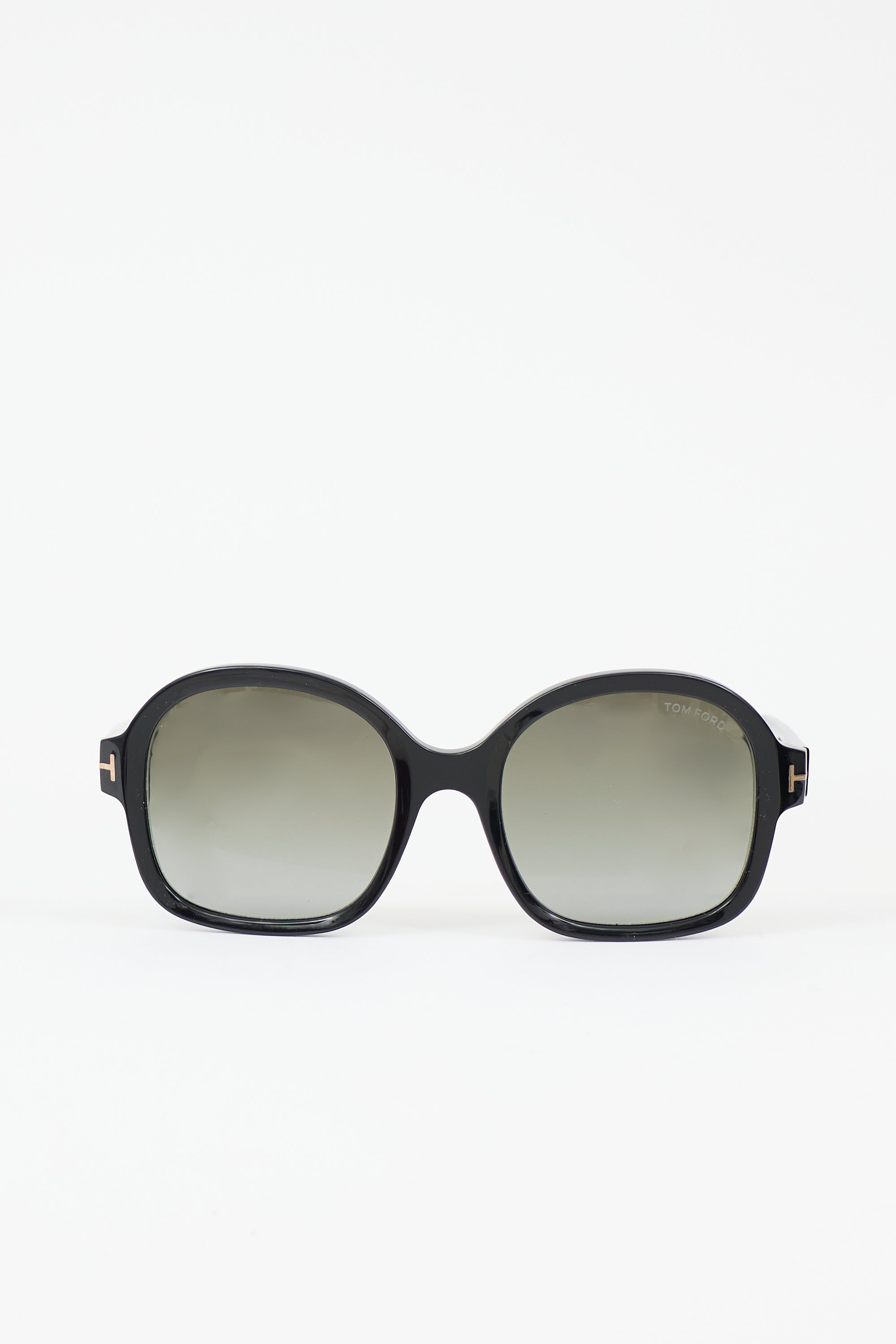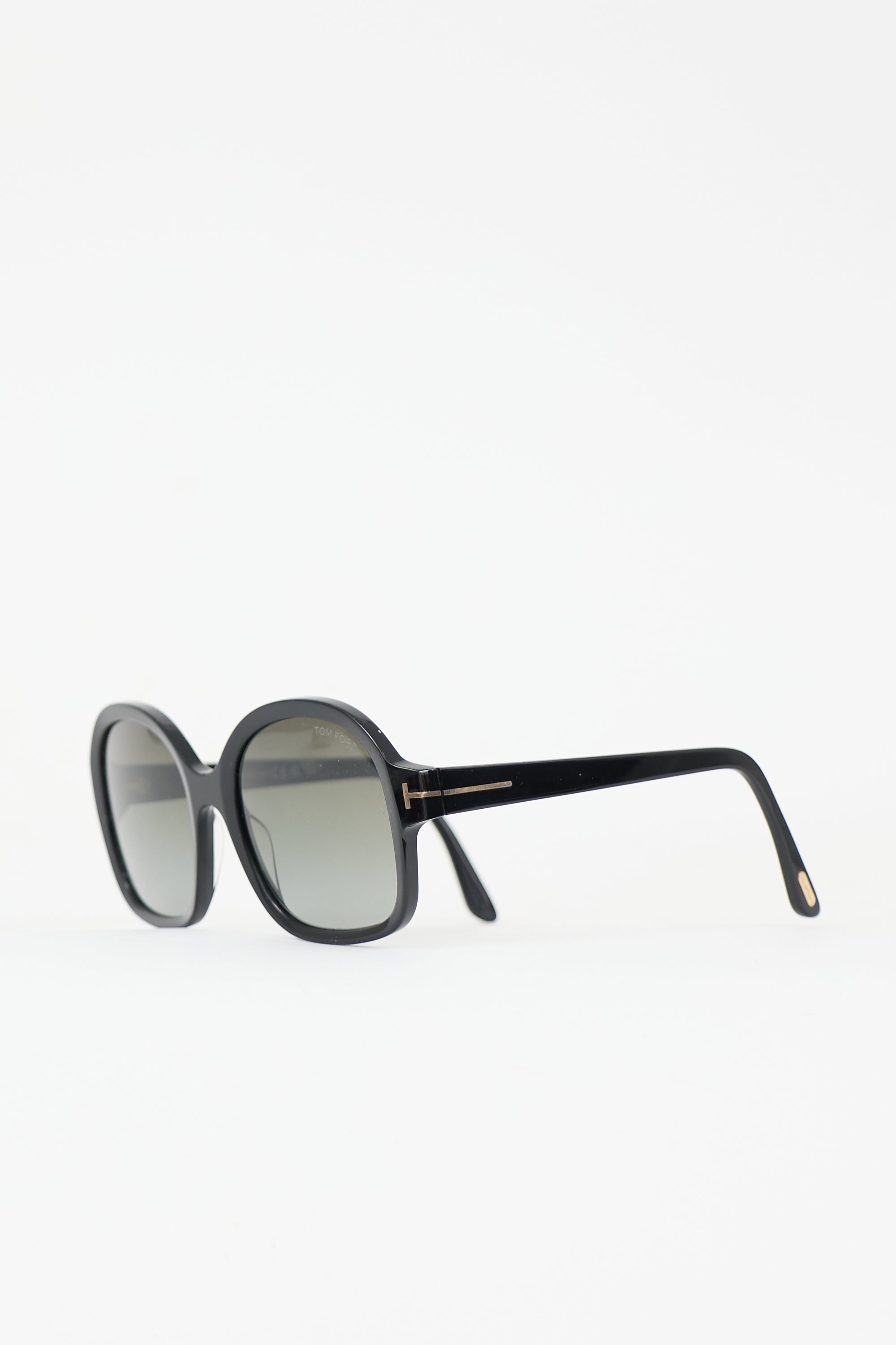 Pre-owned Tom Ford black TF1034 Hanley sunglasses featuring oversized square frame, black tinted lens, and gold tone logo at temple. Includes original case.