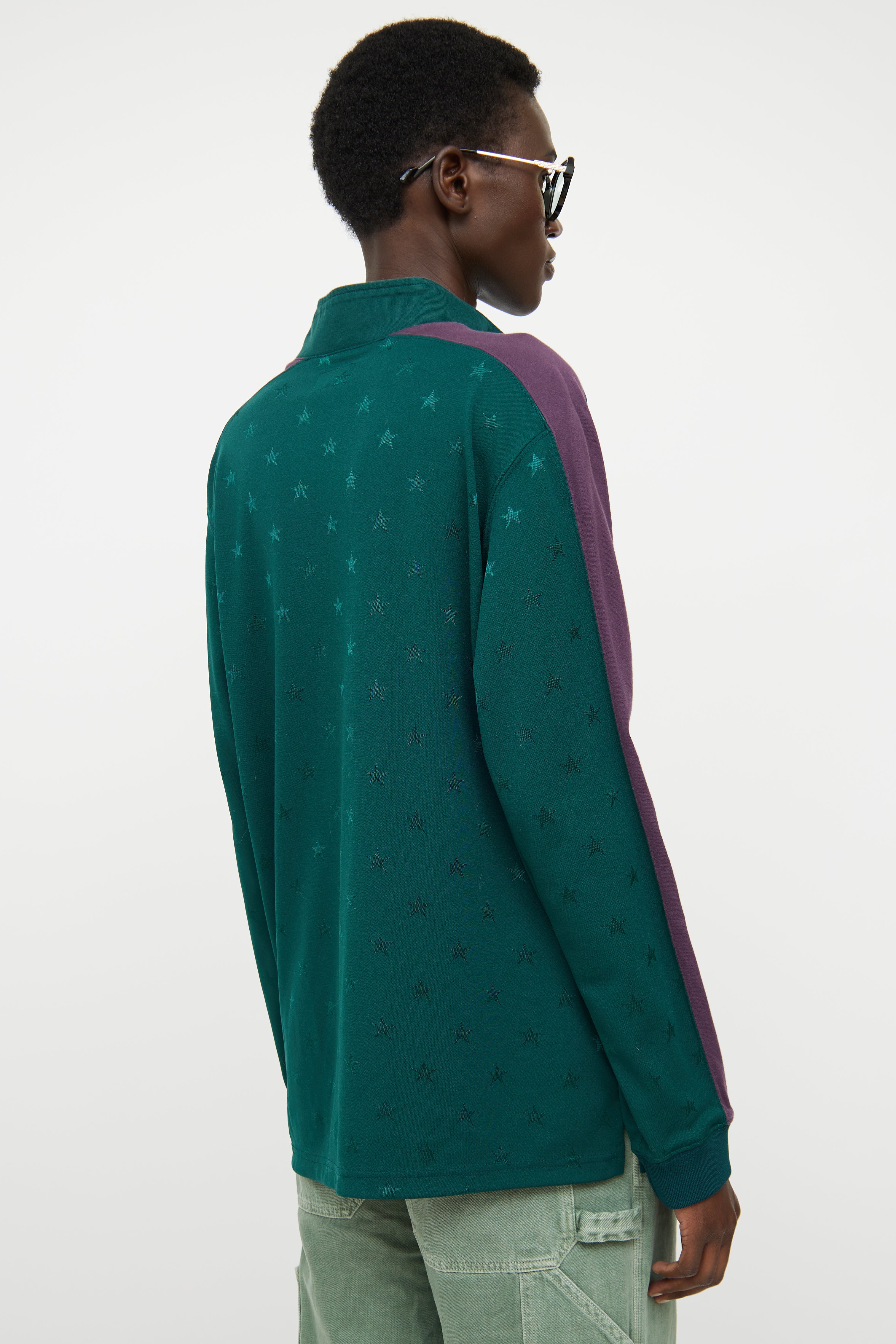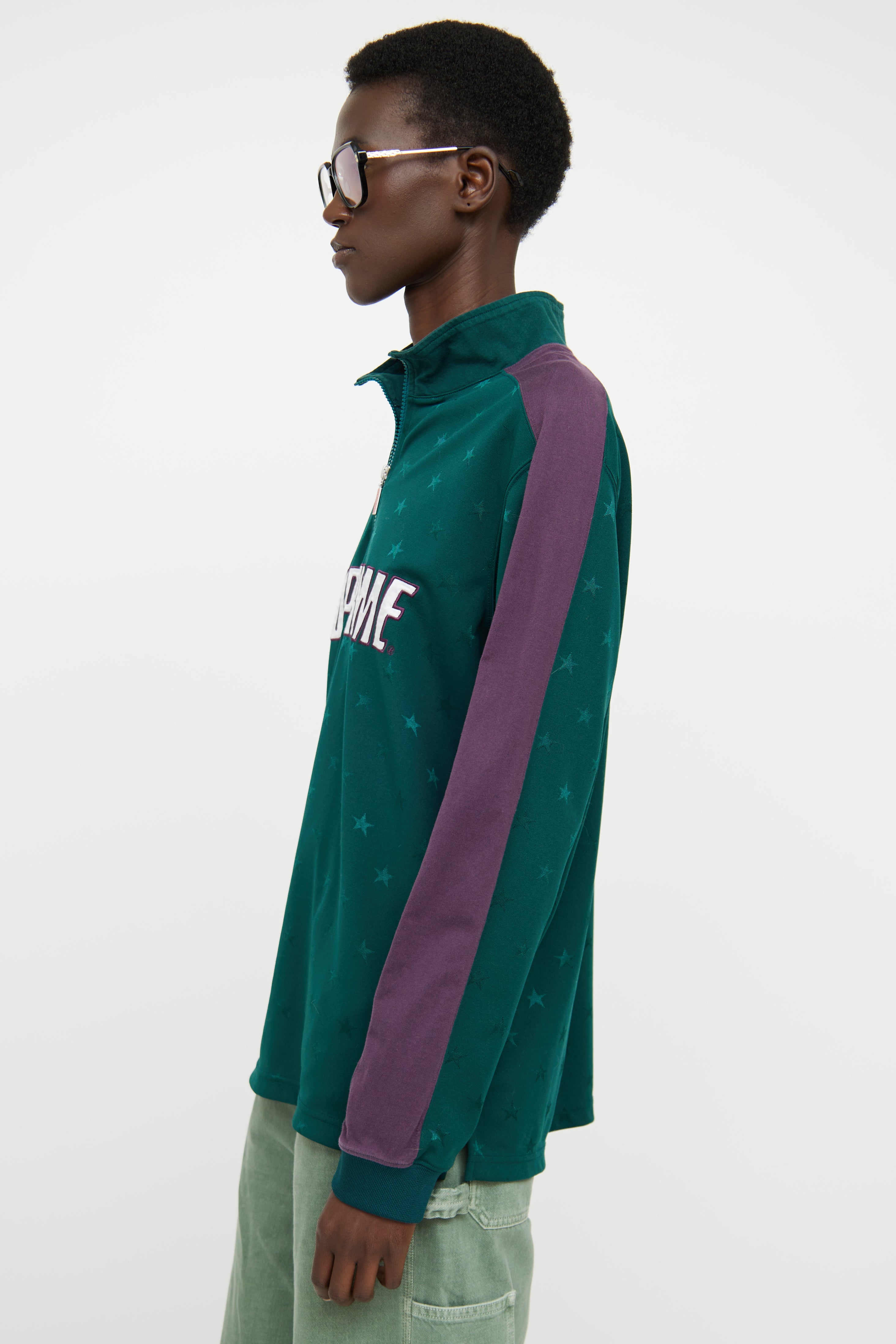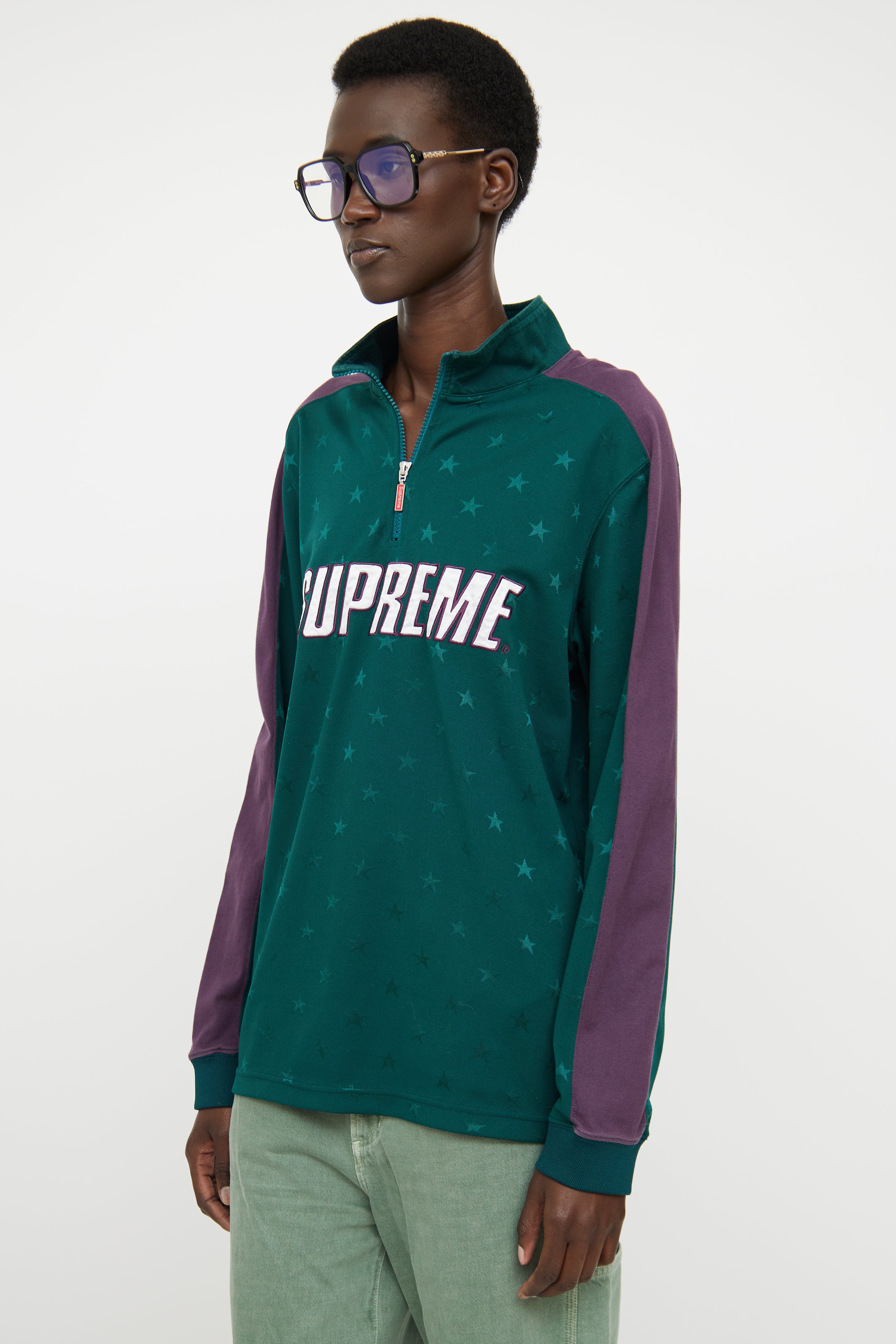 Pre-owned Supreme green long sleeve top featuring stand collar, half zip closure, rib knit cuffs, dual split seams at hem, tonal star pattern throughout, purple panel detailing, white logo text across front and red logo zip pull detail.