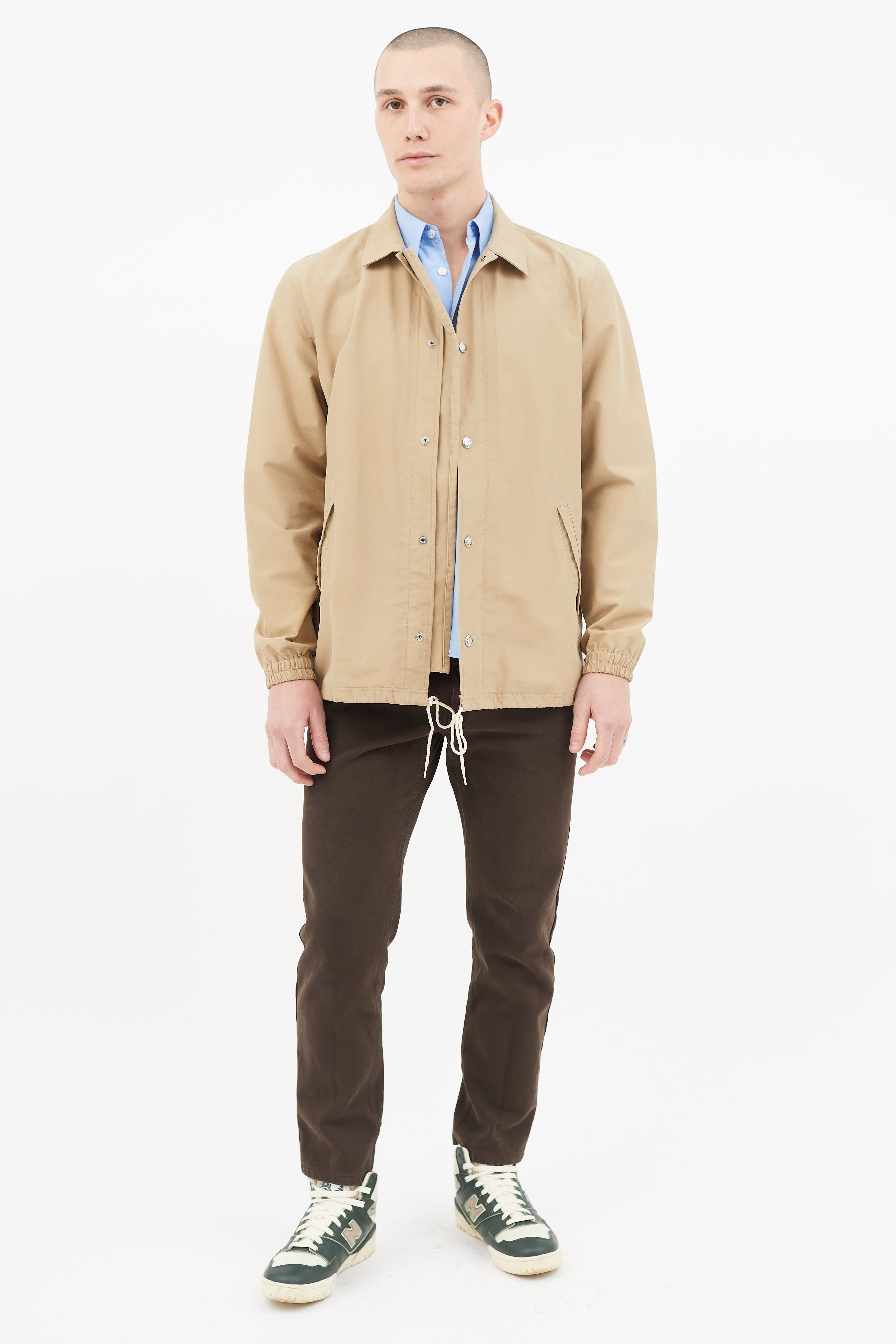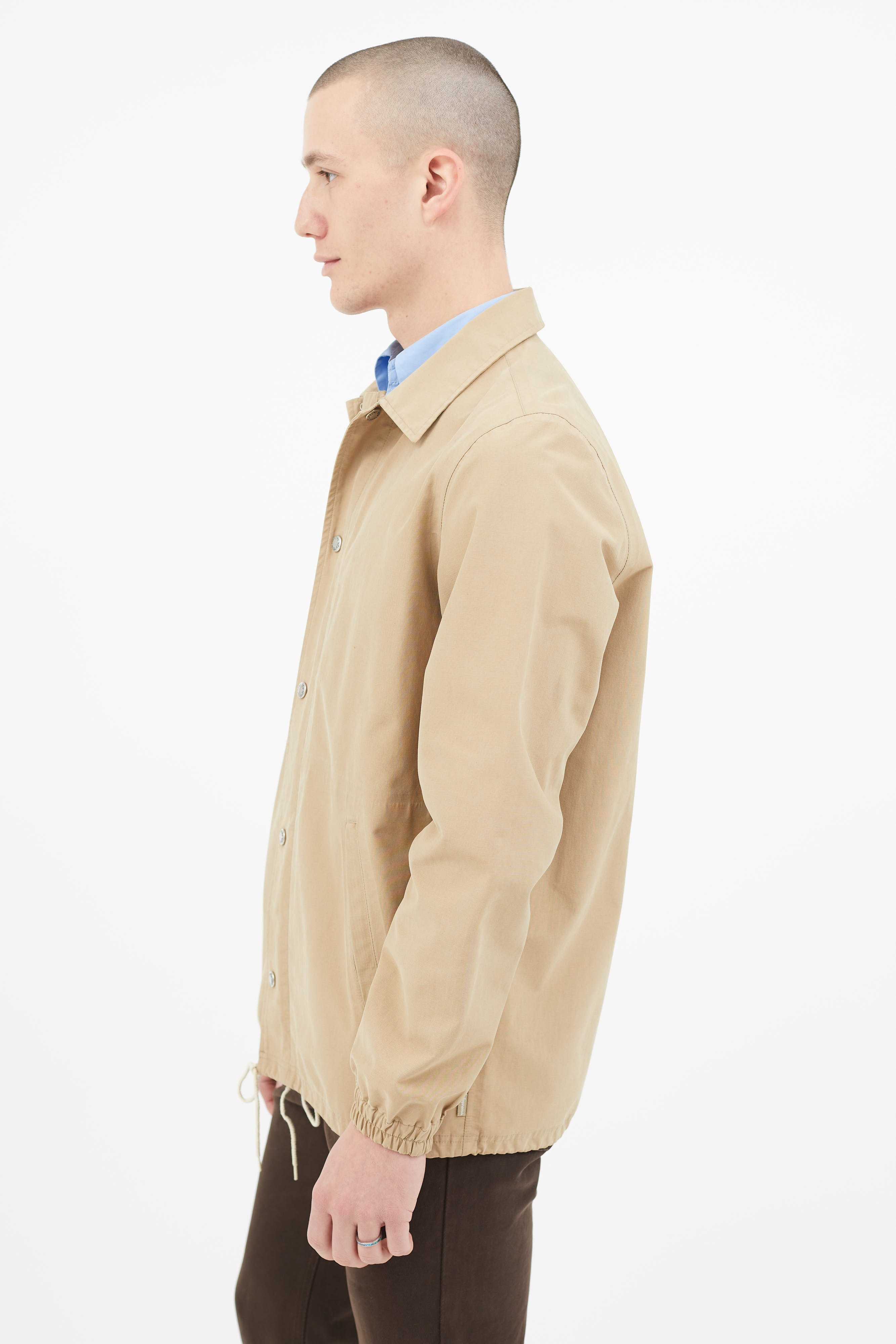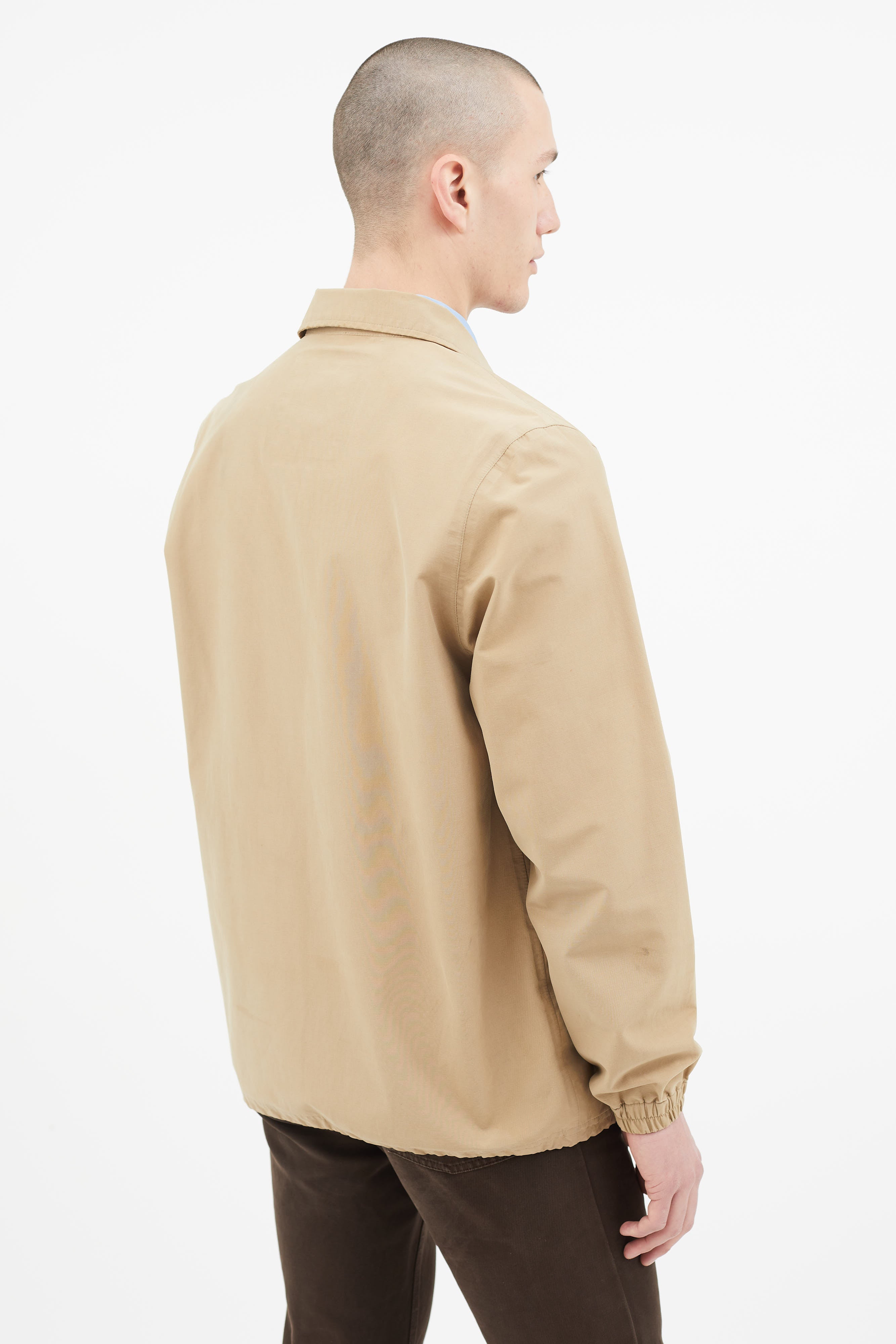 Pre-owned Supreme beige waterproof coach jacket featuring classic collar, snap button up front, two side pockets, elasticized cuffs and hem, drawstring fastening at waist, tonal logo tab at side, and seam tapped lining.