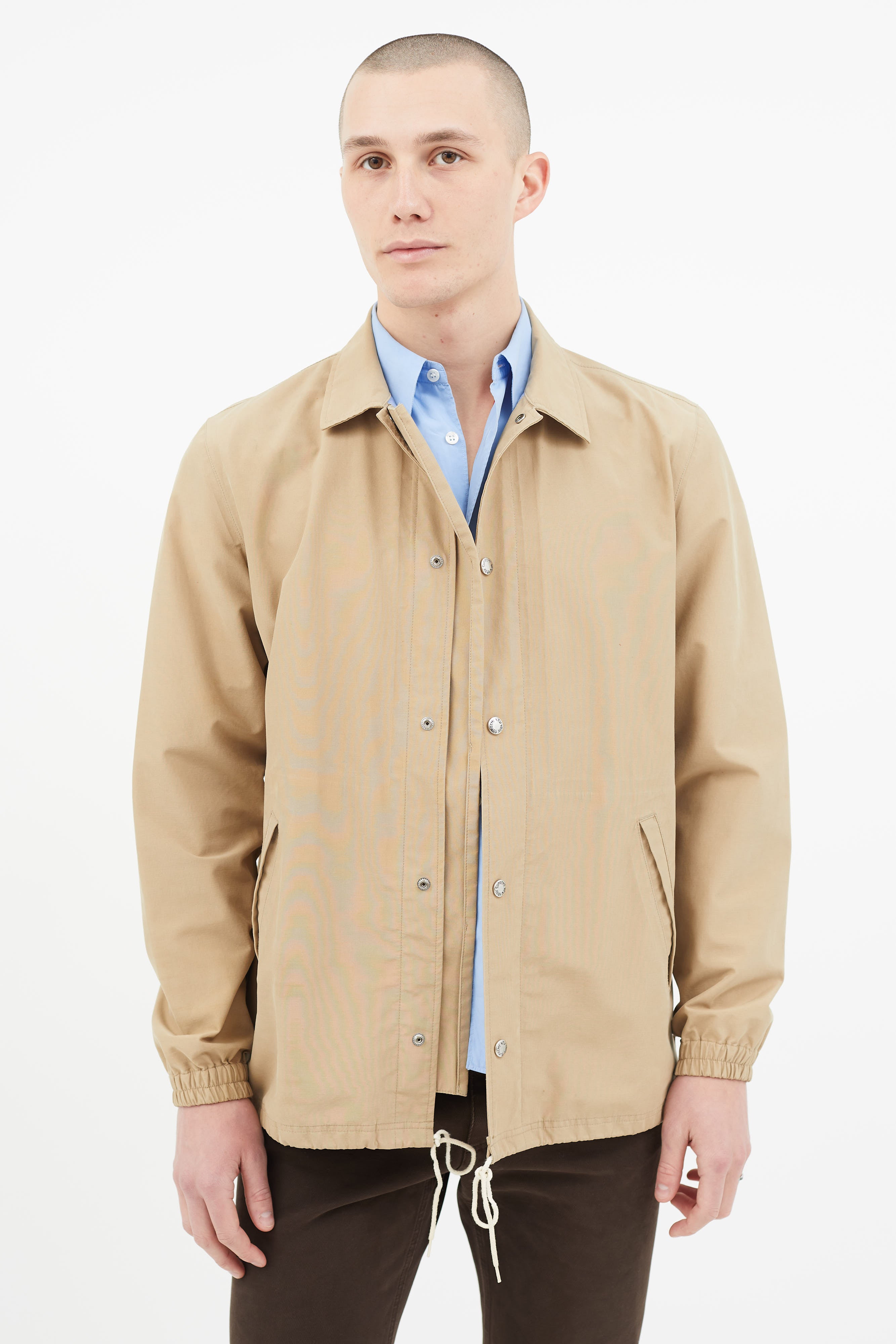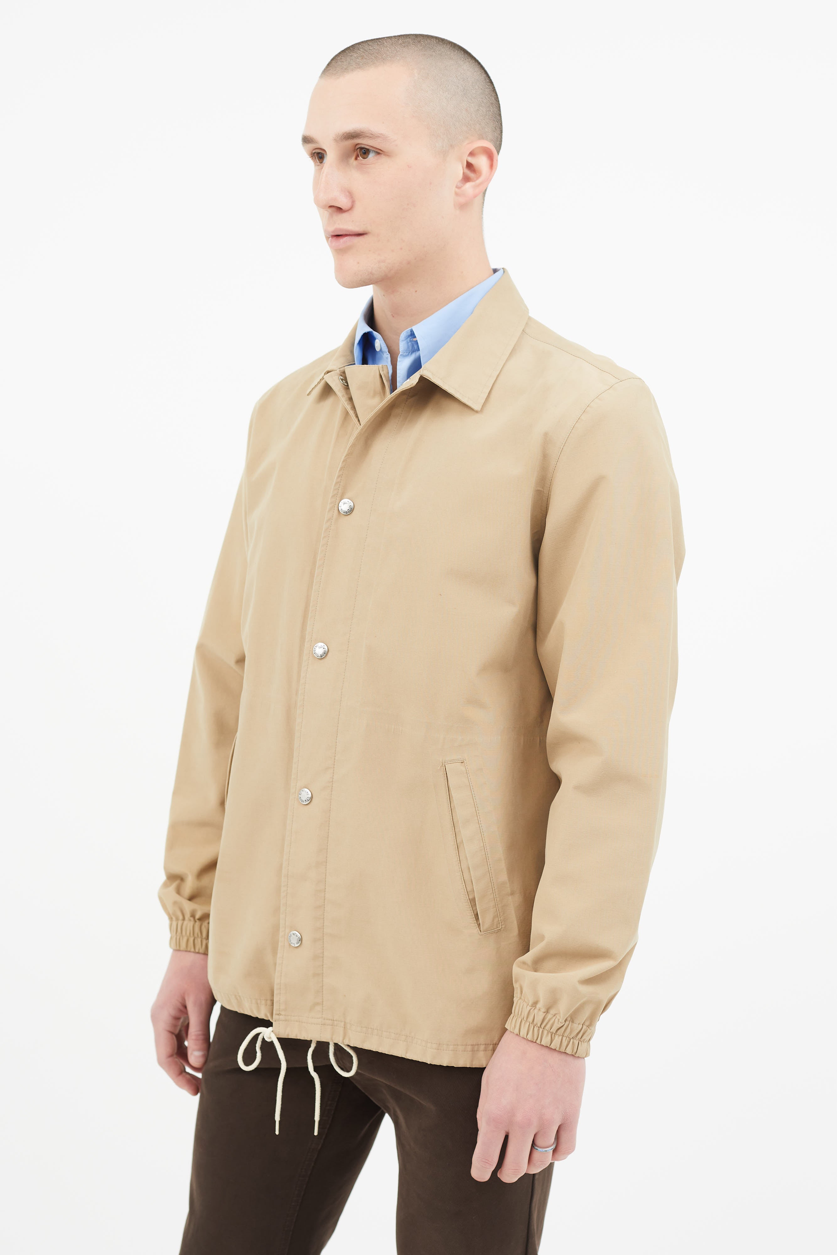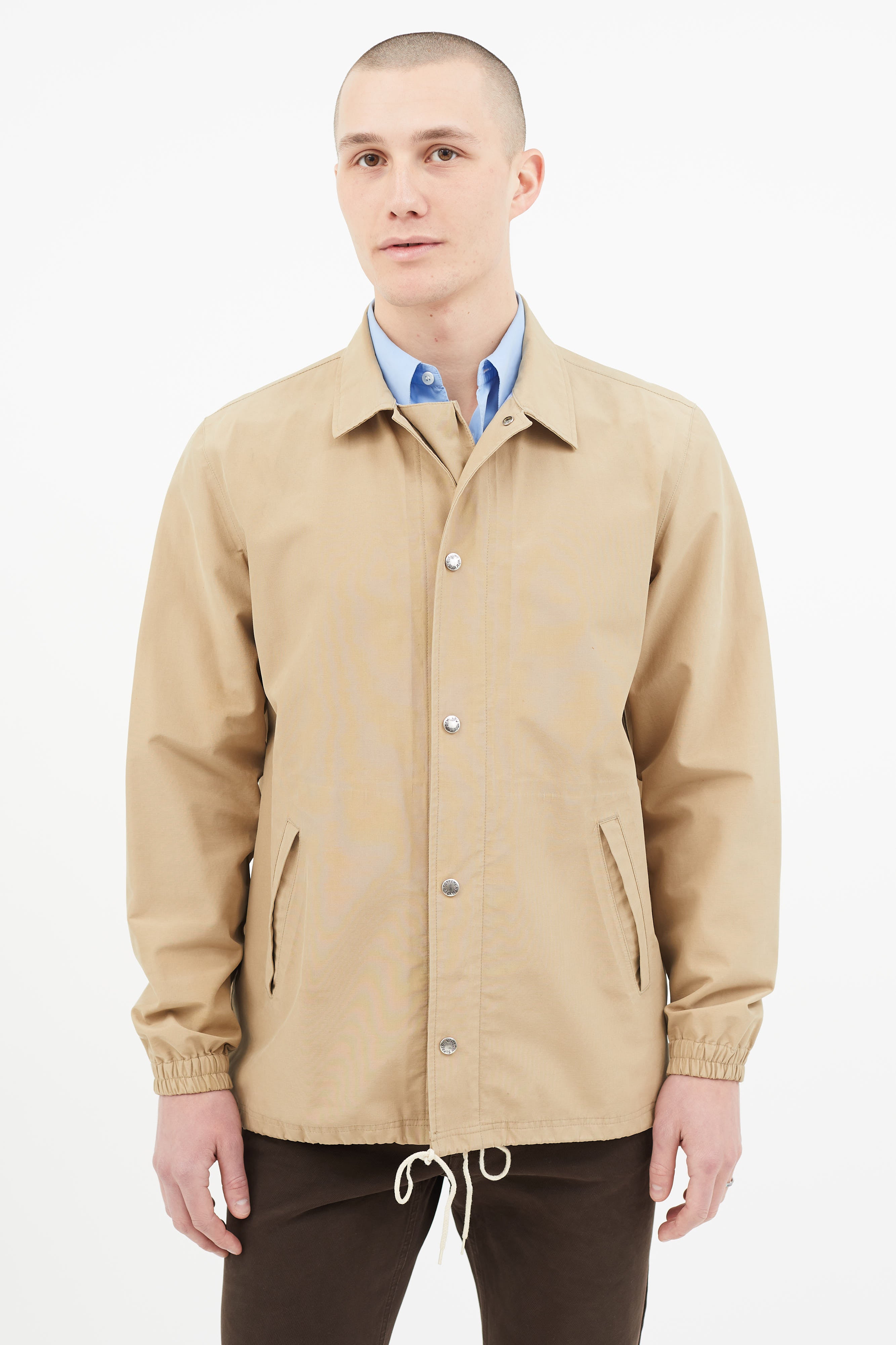 Pre-owned Supreme beige waterproof coach jacket featuring classic collar, snap button up front, two side pockets, elasticized cuffs and hem, drawstring fastening at waist, tonal logo tab at side, and seam tapped lining.