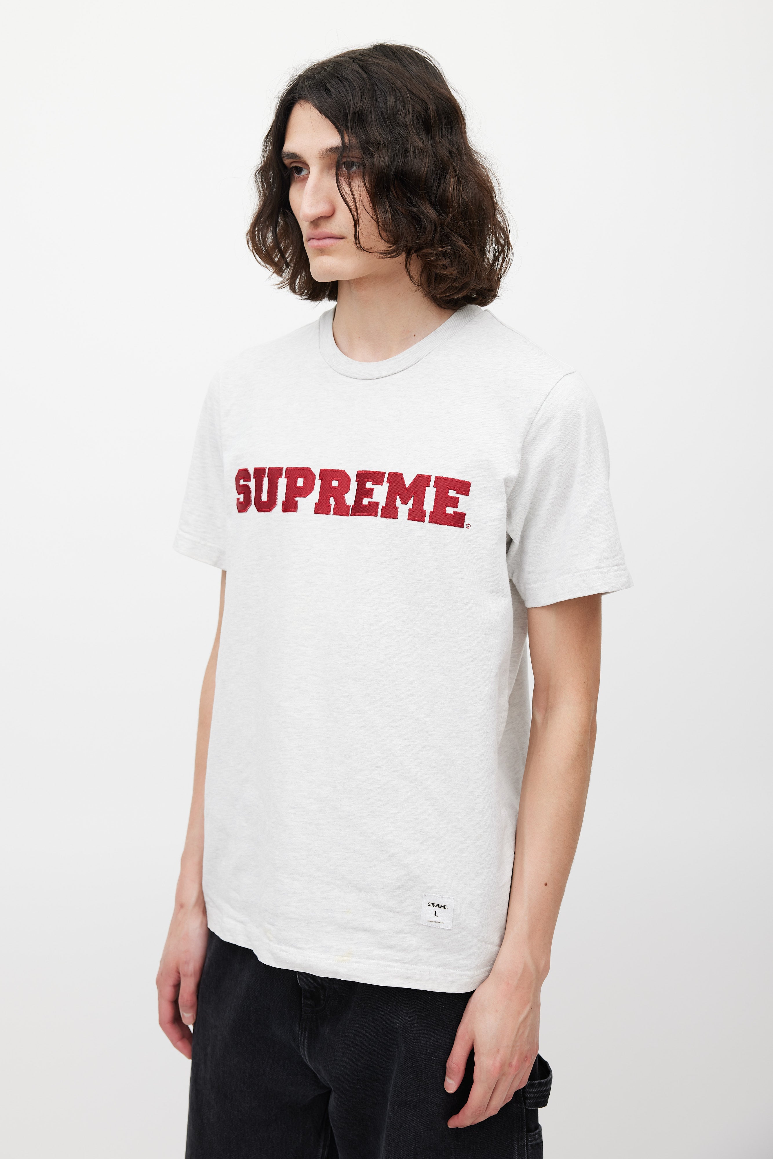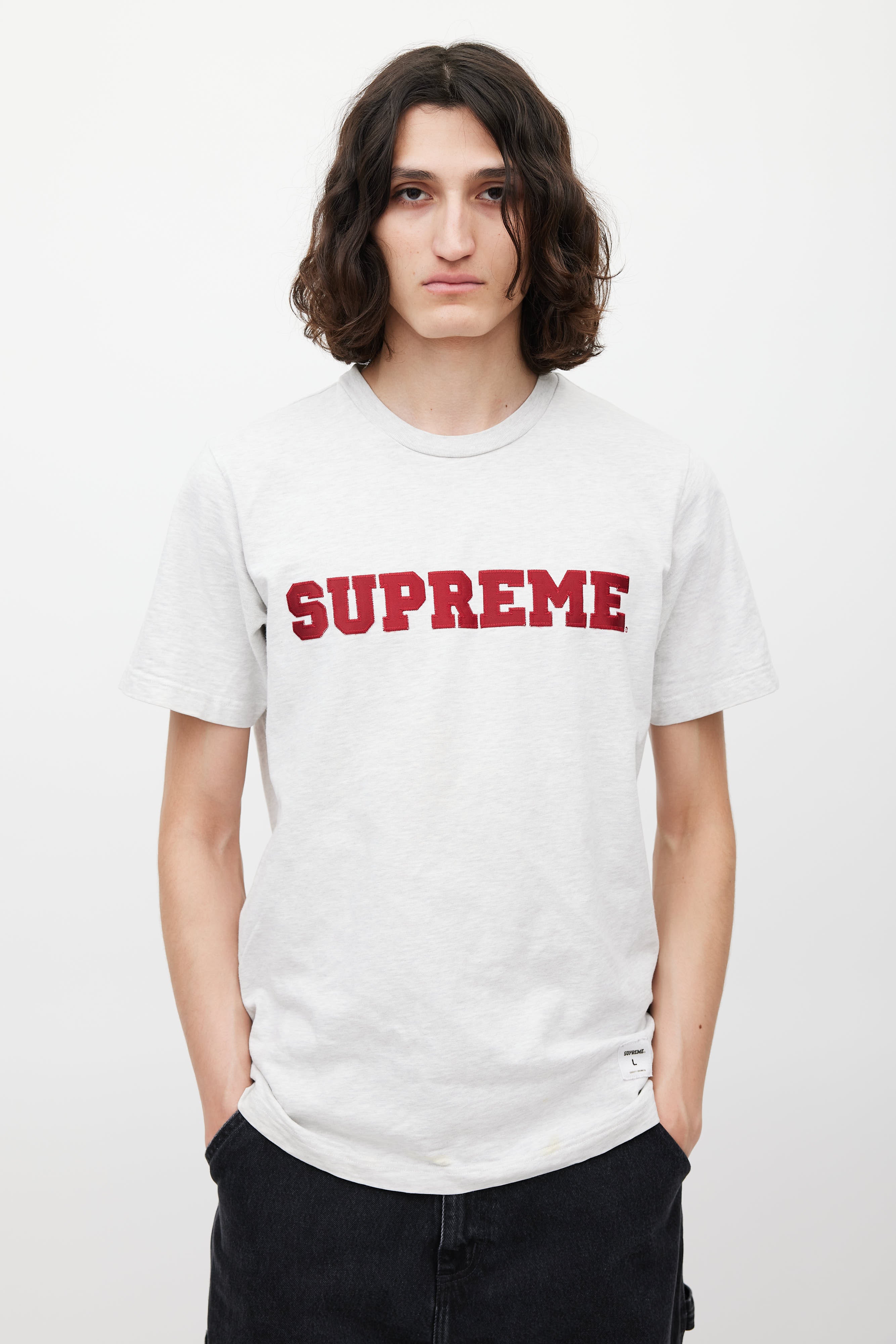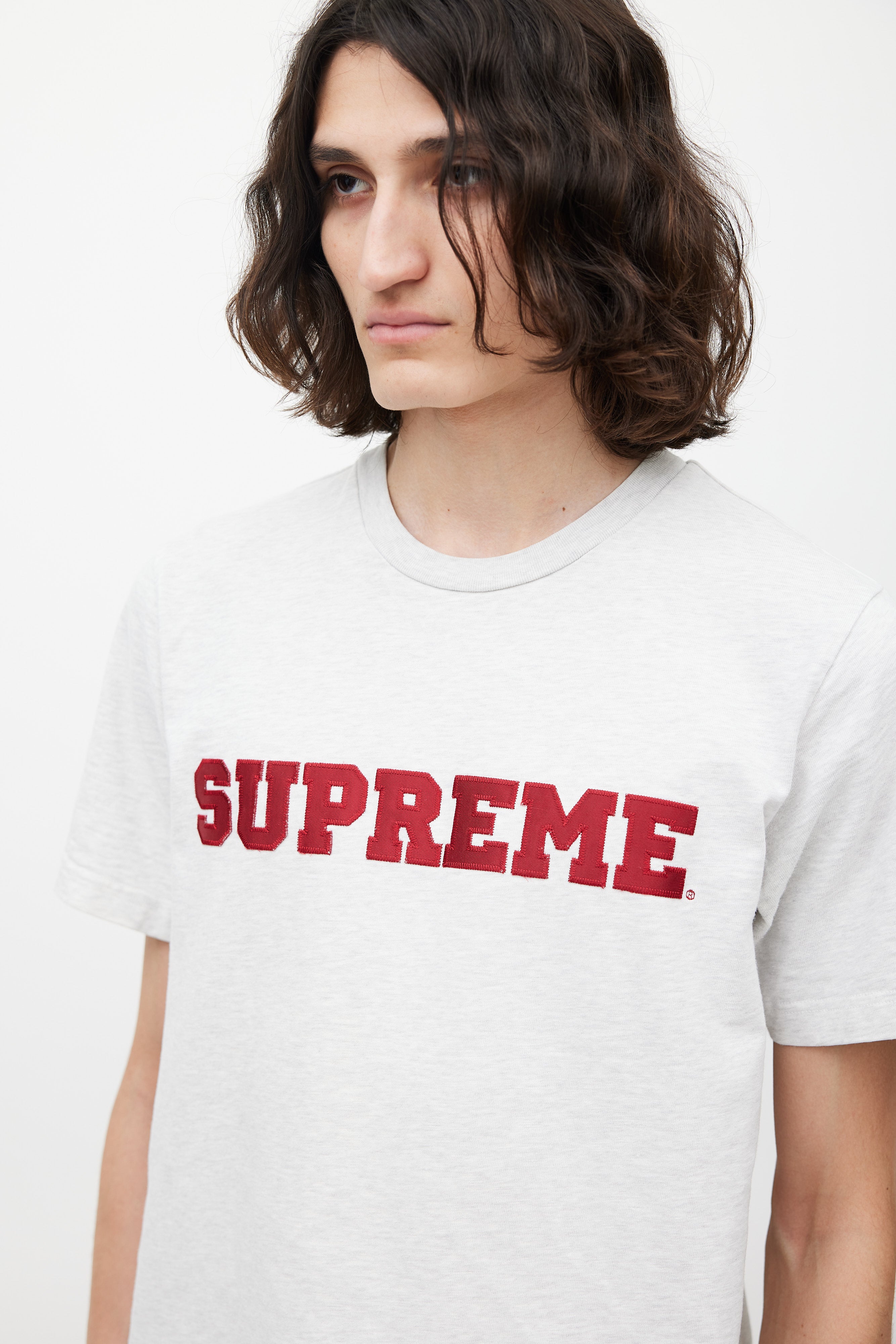 Pre-owned Supreme grey T-shirt featuring a red logo embroidery at chest, round neckline, and short sleeves.