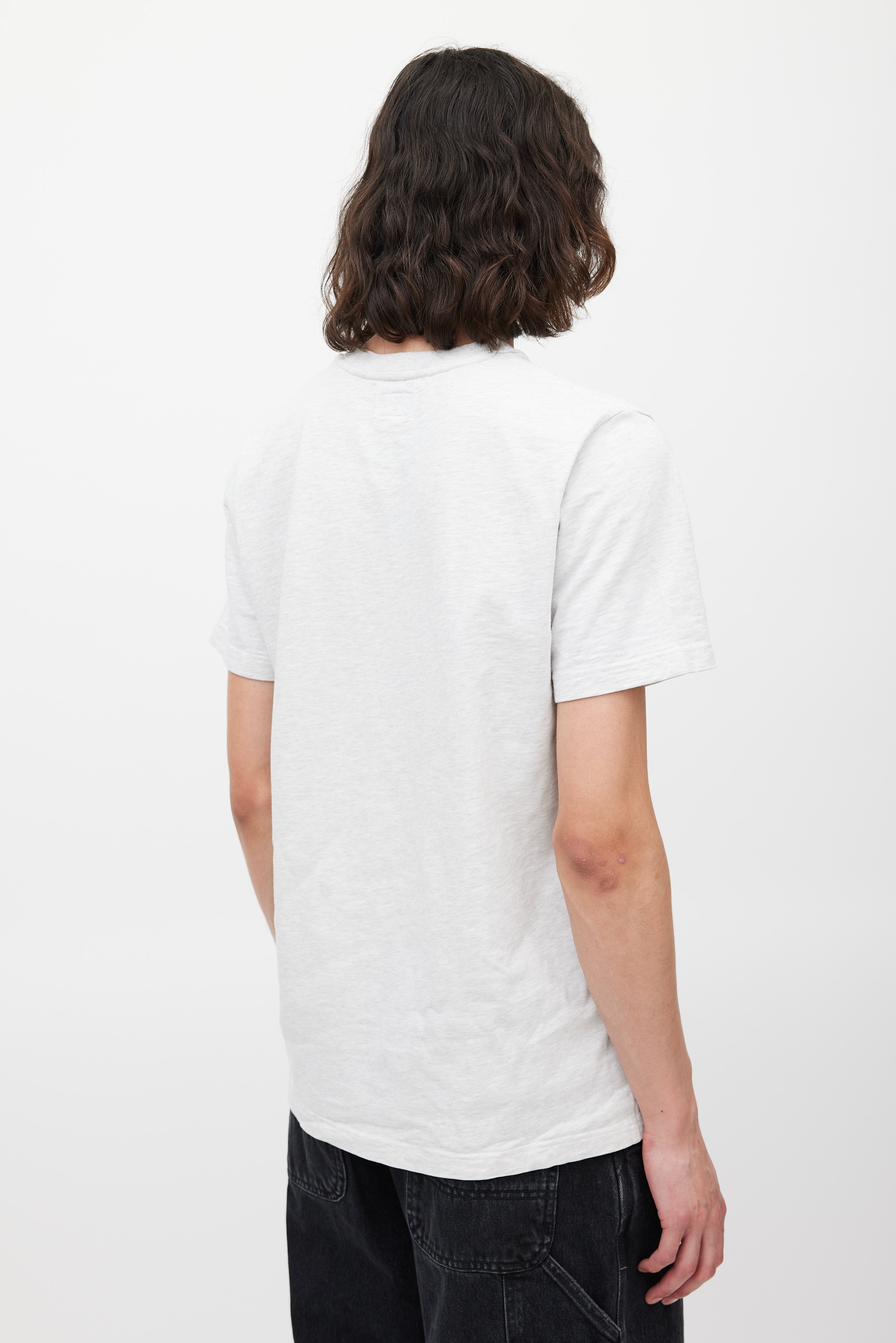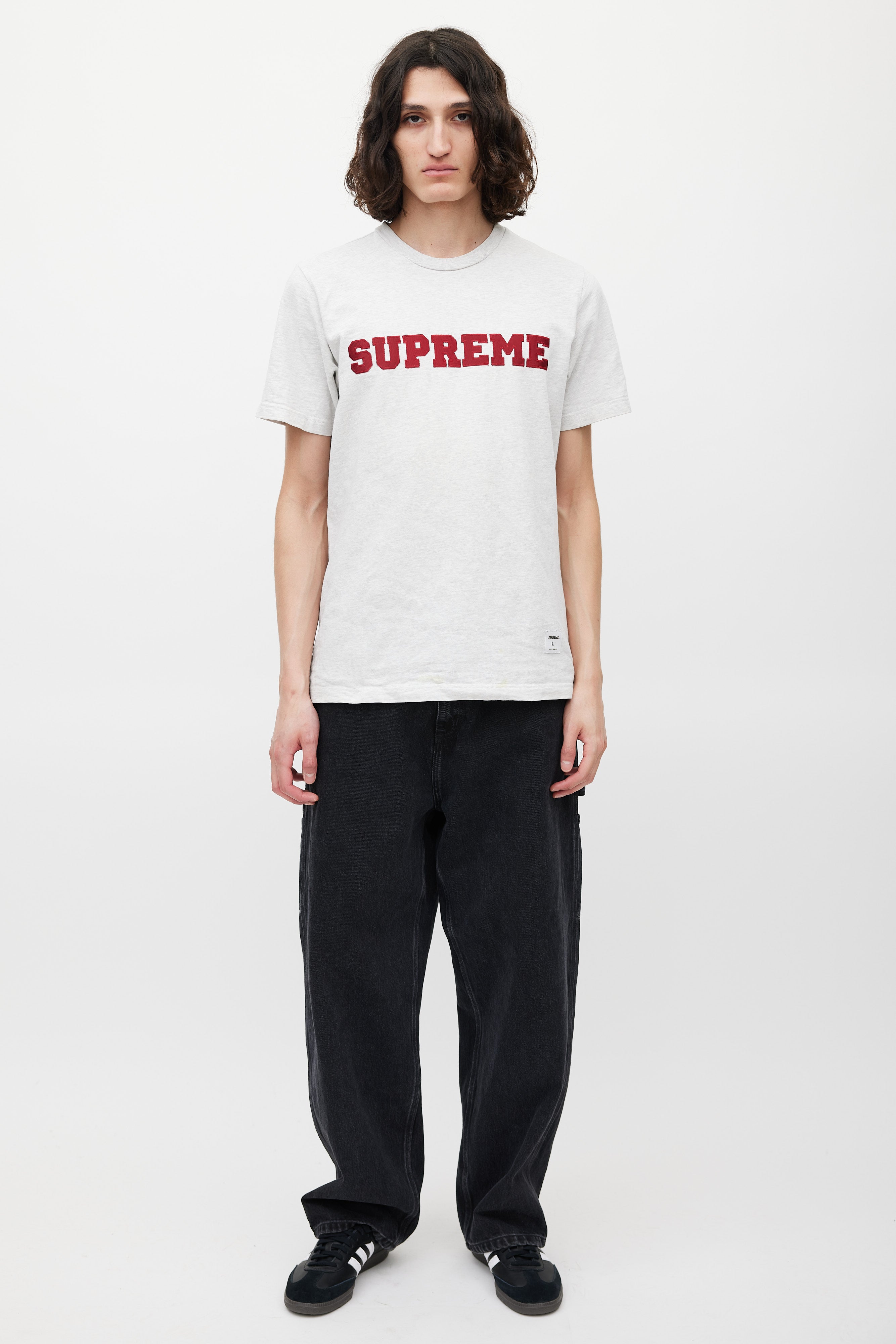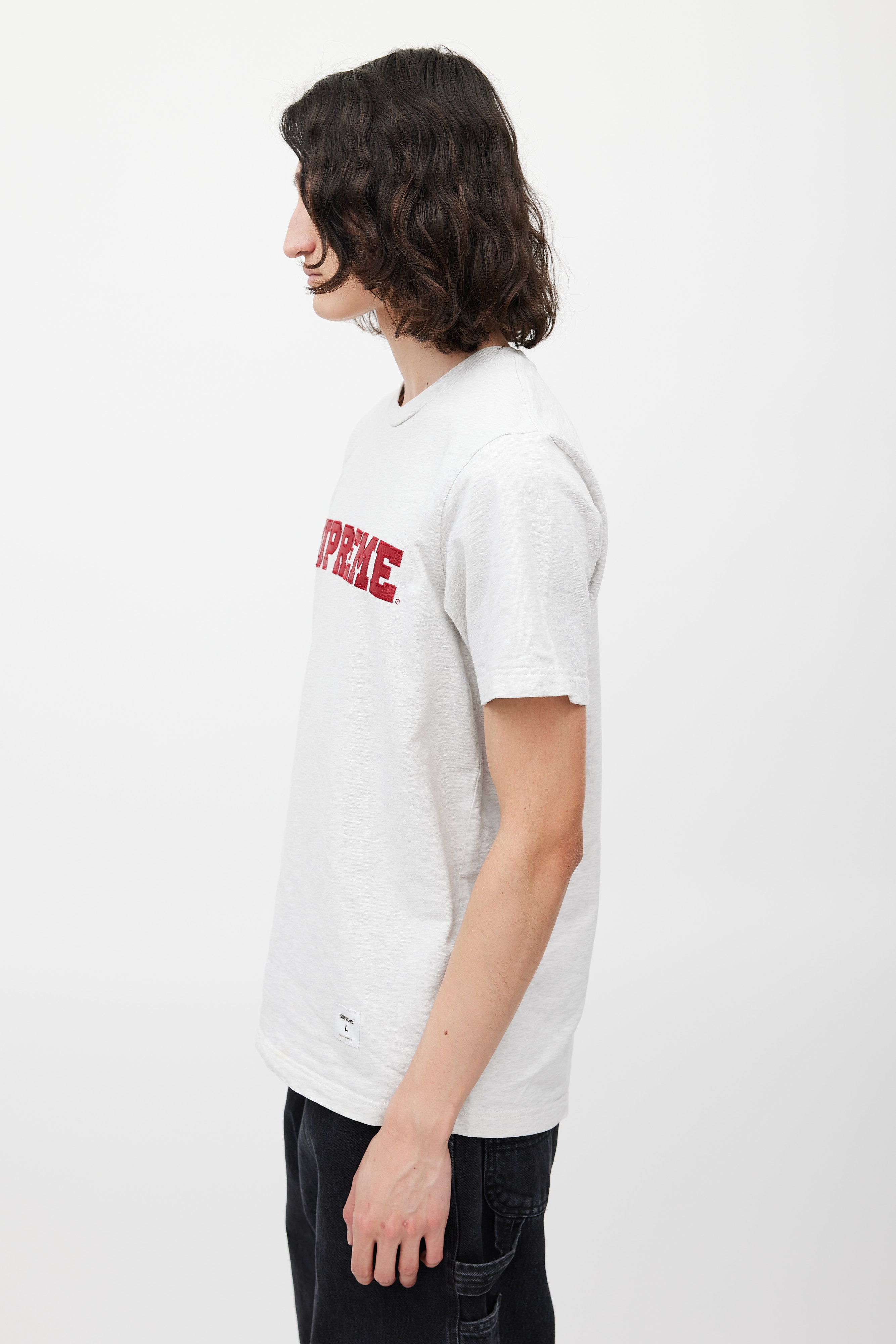 Pre-owned Supreme grey T-shirt featuring a red logo embroidery at chest, round neckline, and short sleeves.