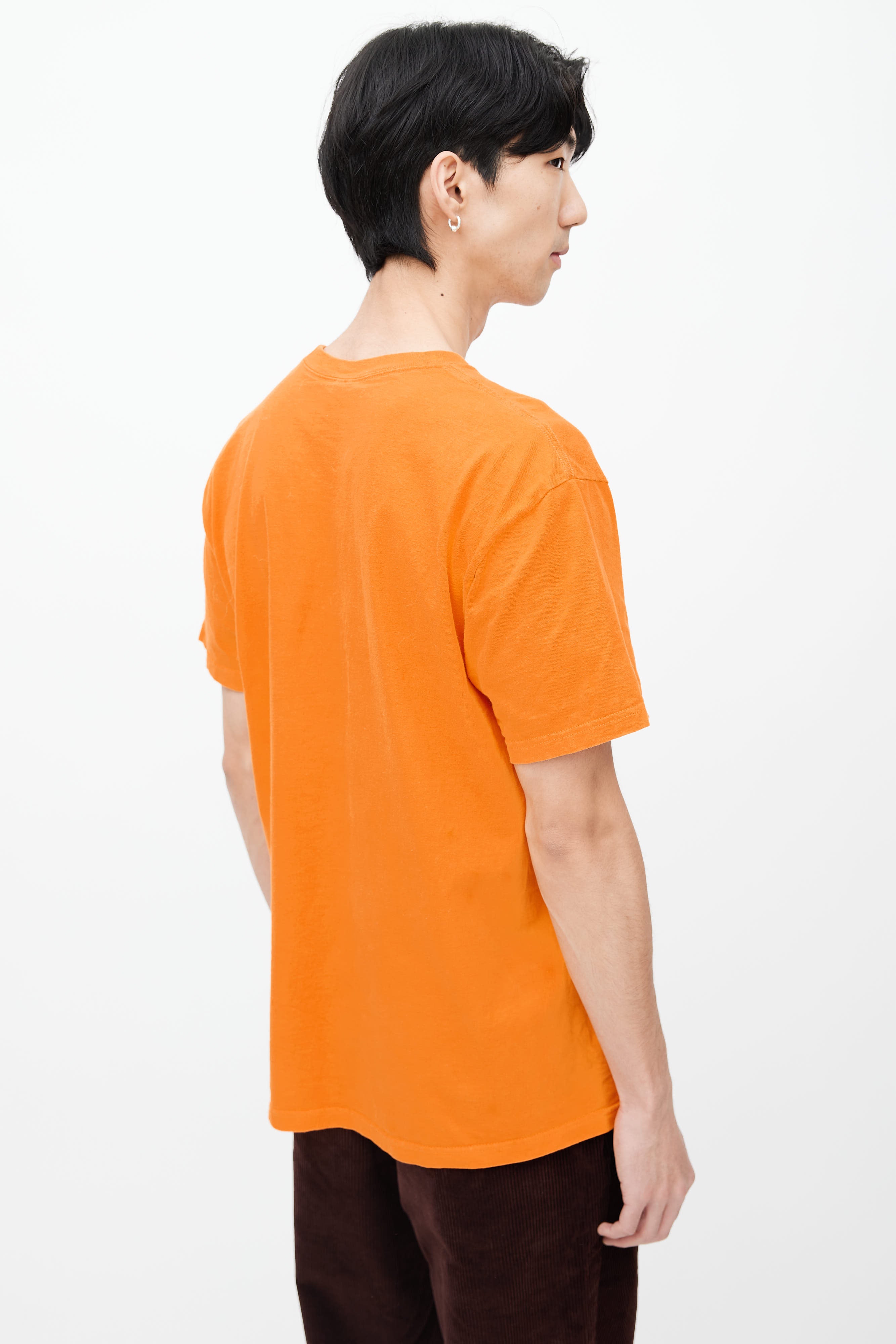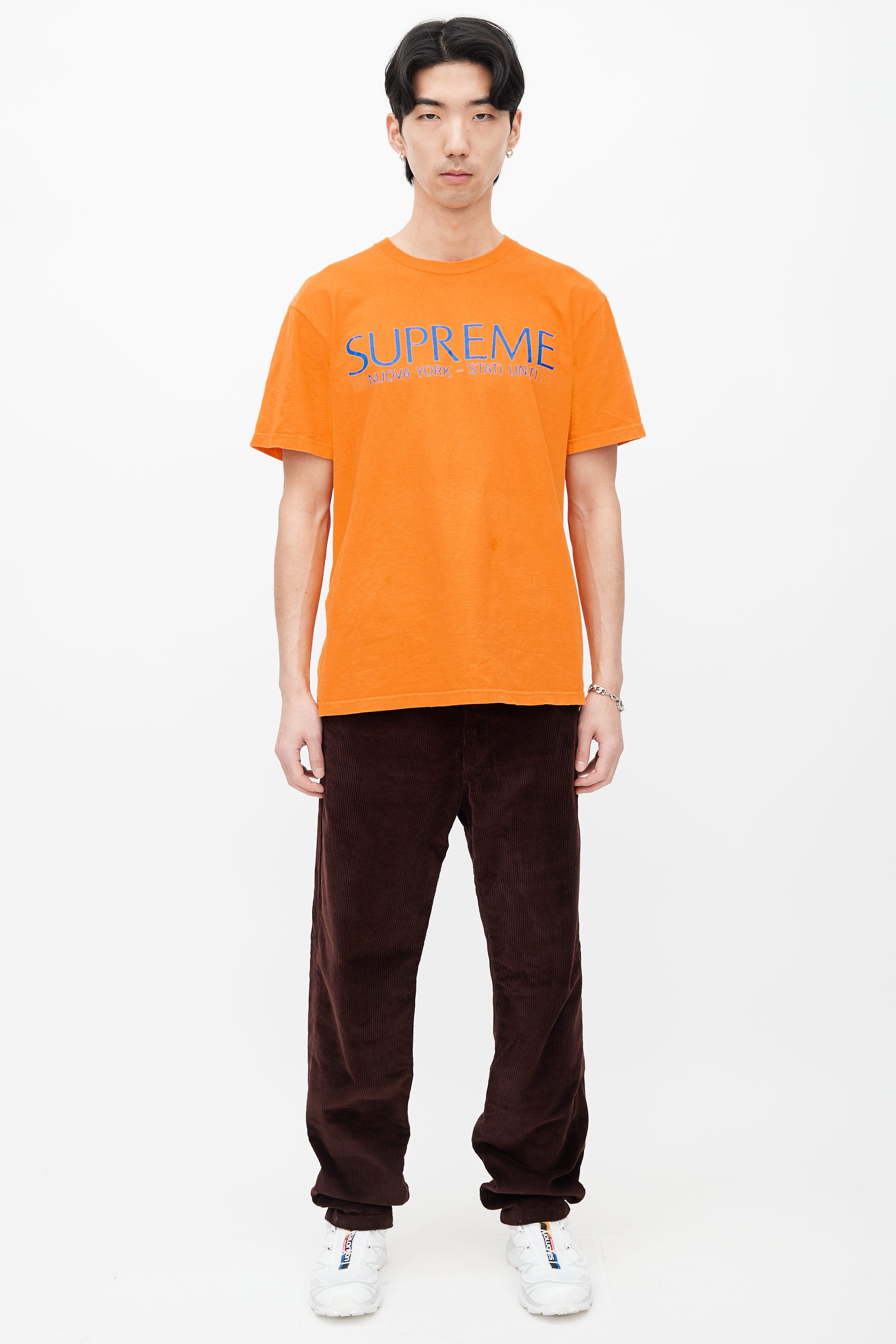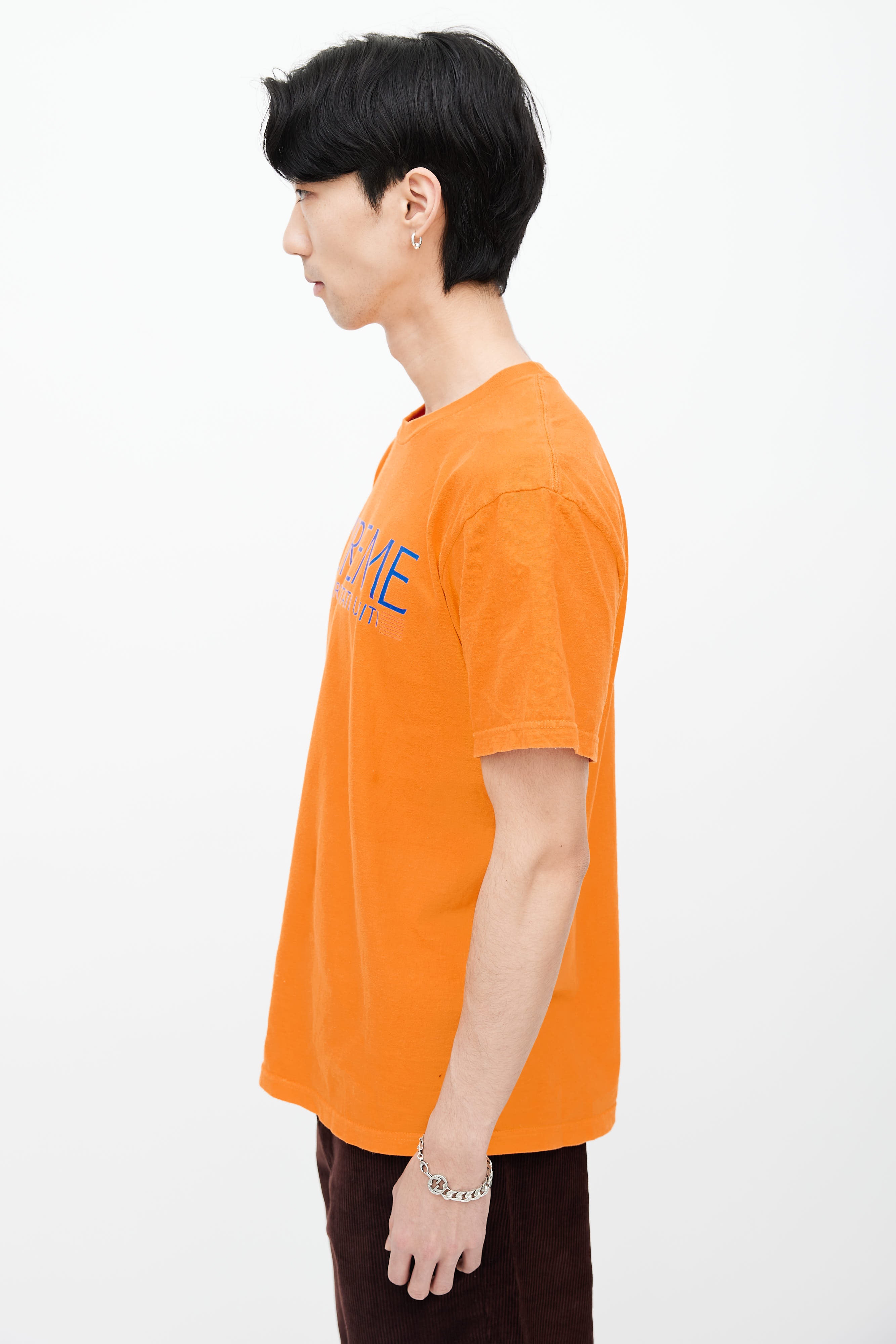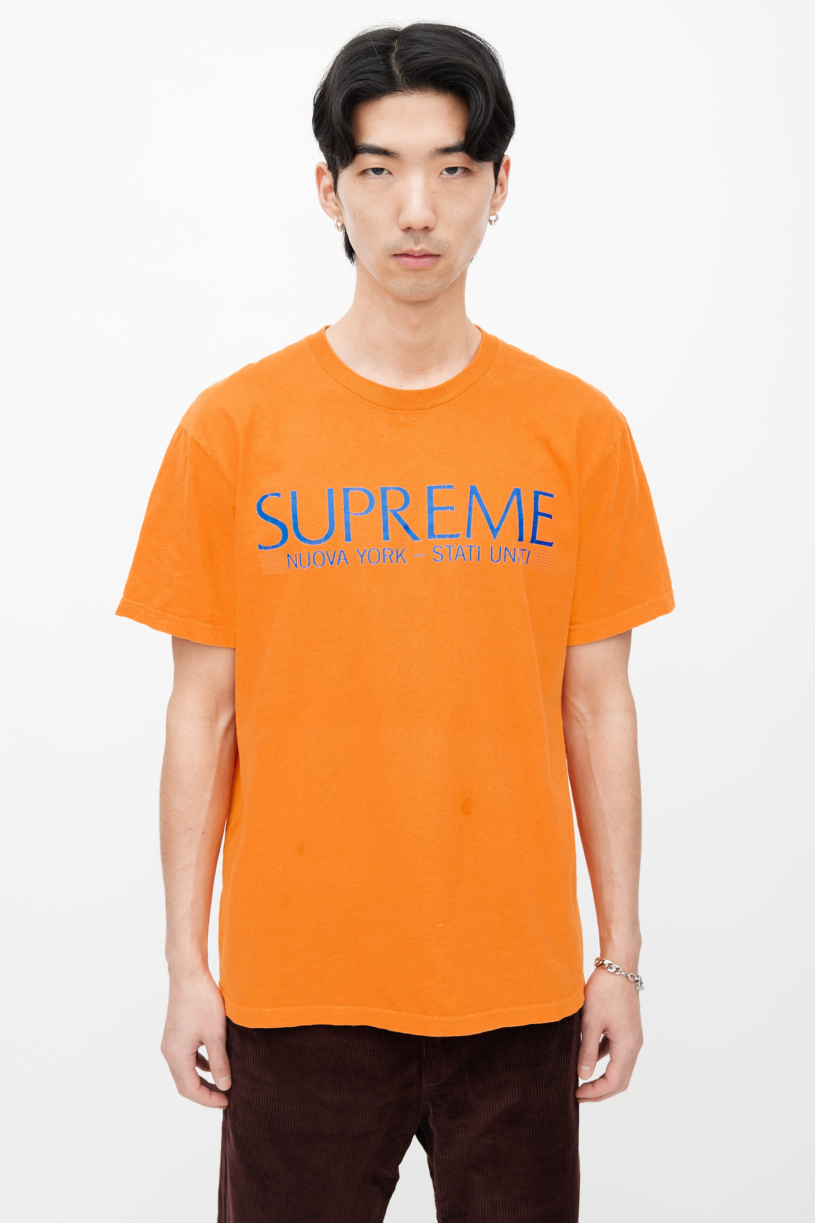 Pre-owned Supreme T-shirt in orange featuring crew neckline, short sleeves, and blue graphic letter print at front.