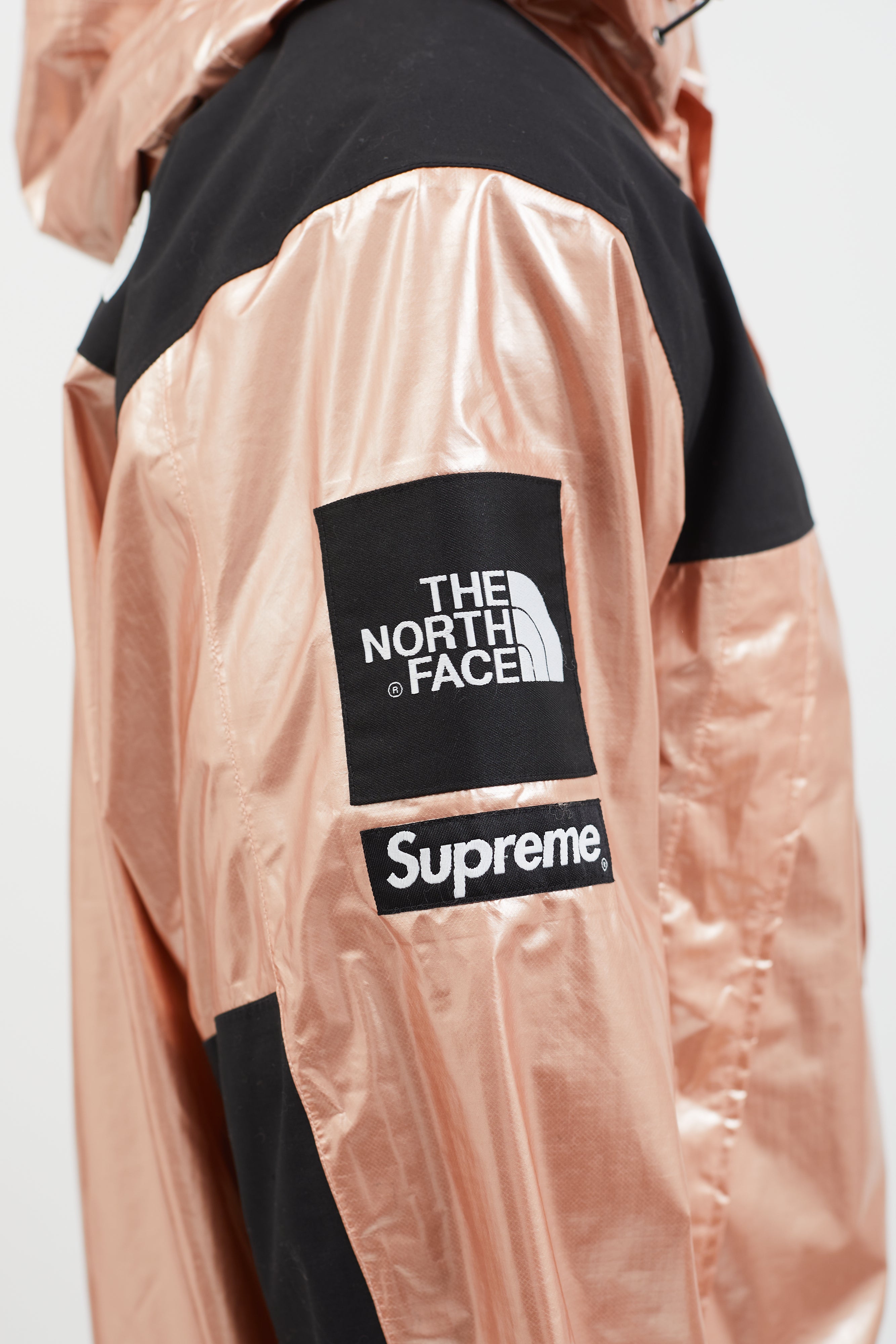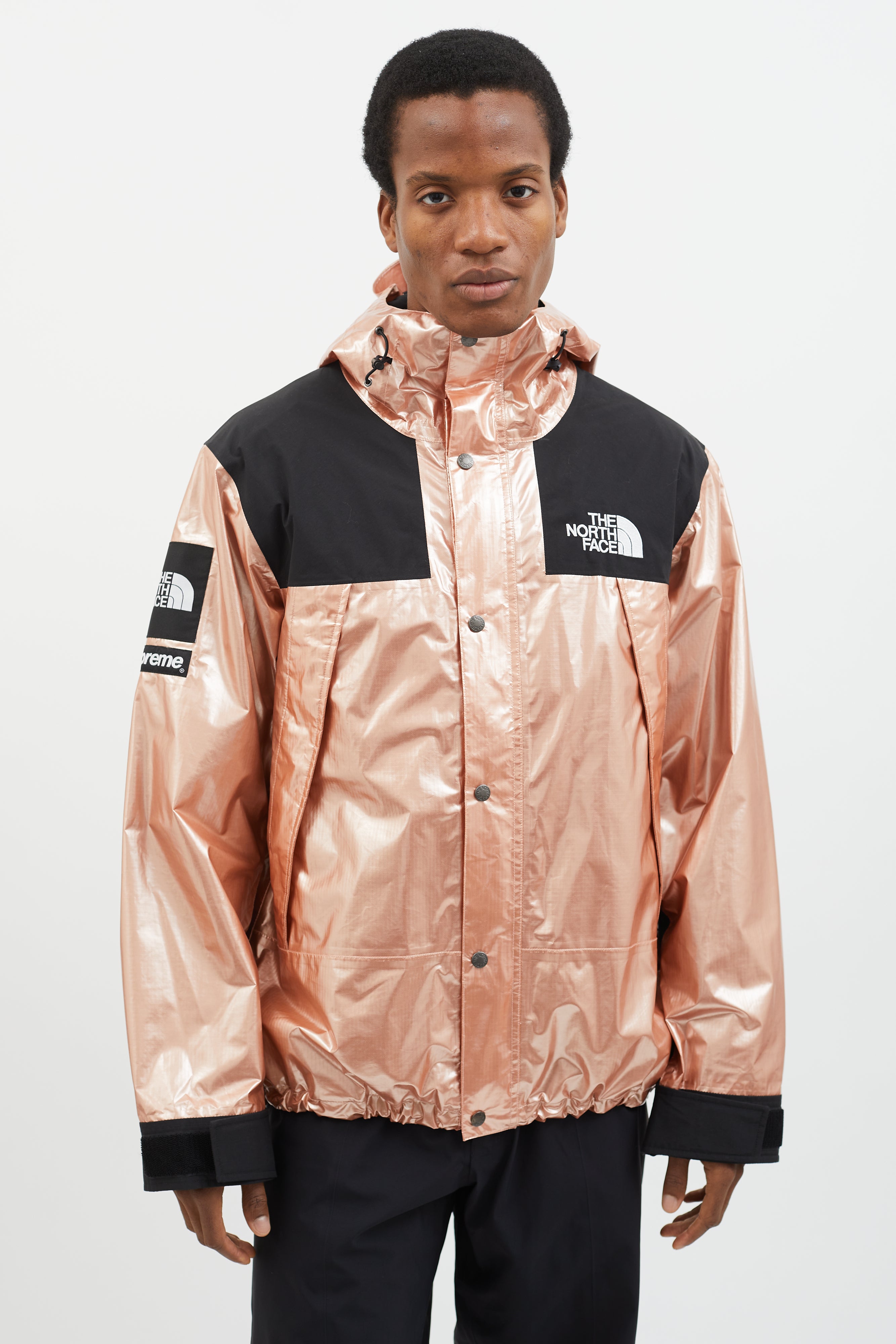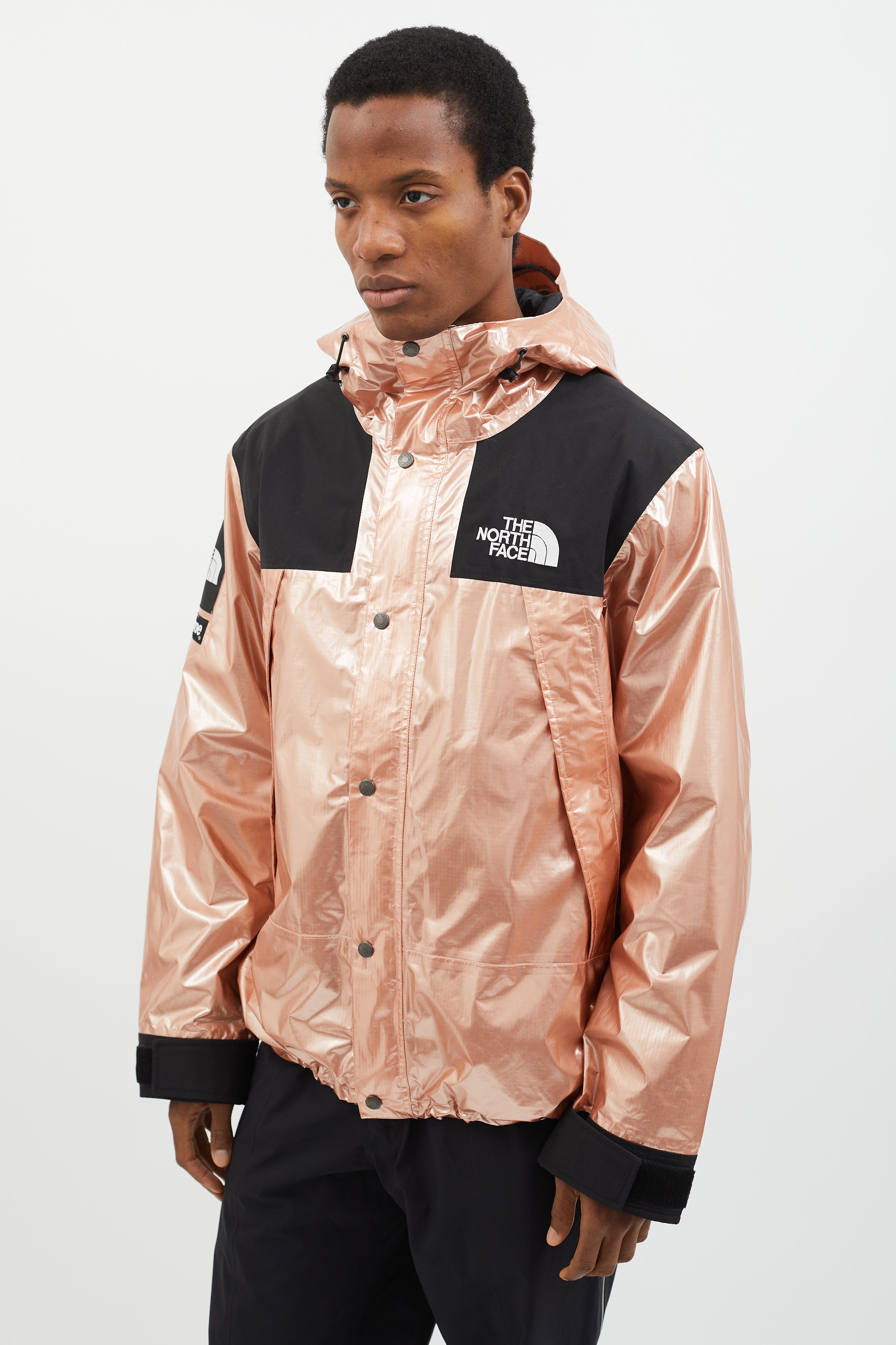 Pre-owned 2018 Supreme x The North Face Mountain Parka in metallic rose gold featuring attached hood with adjustable toggles, logo patch at chest, back, and sleeve, two oversized zippered pockets at side, toggle fastener at hem, snap button closure at front, and black panels at chest and sleeves.