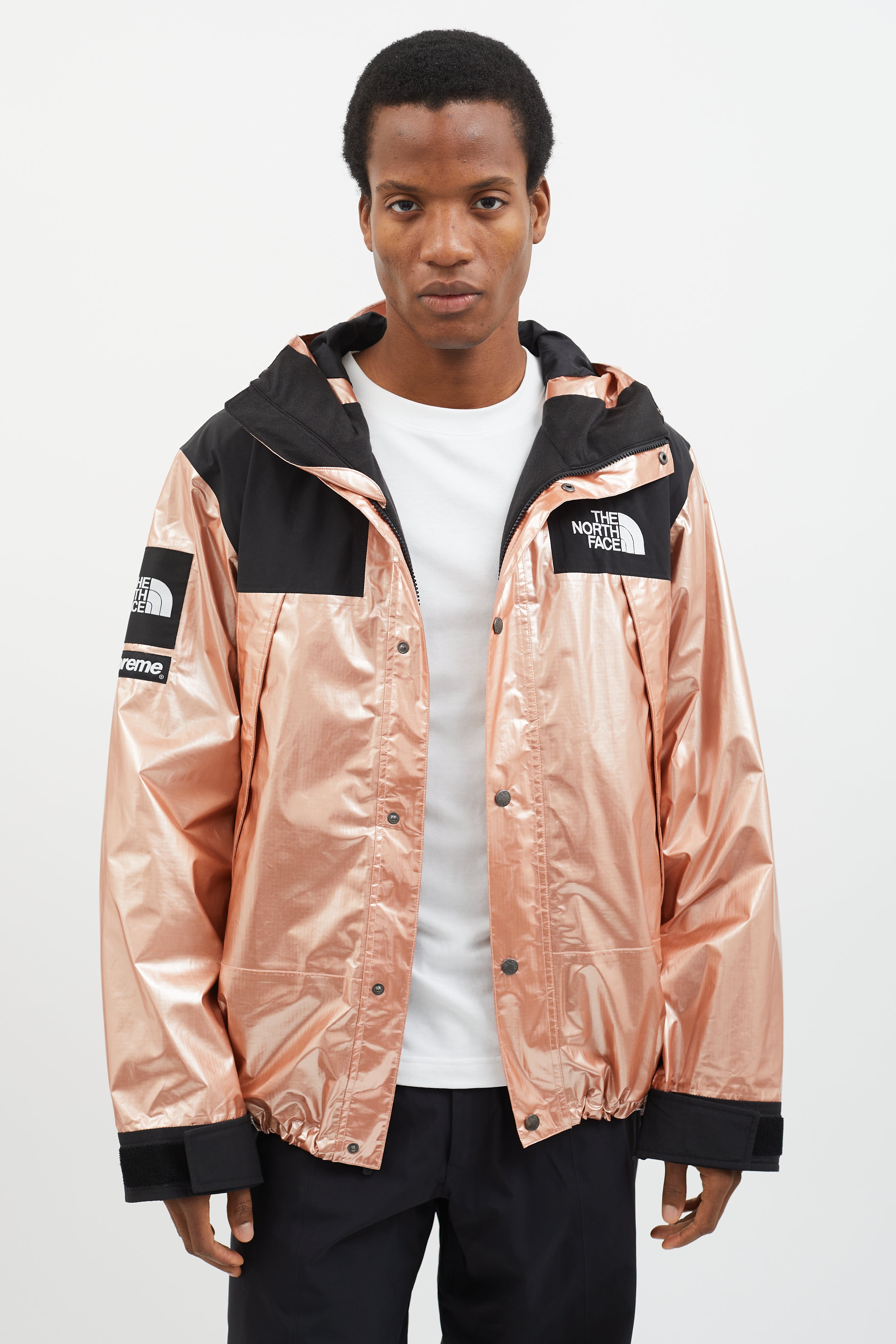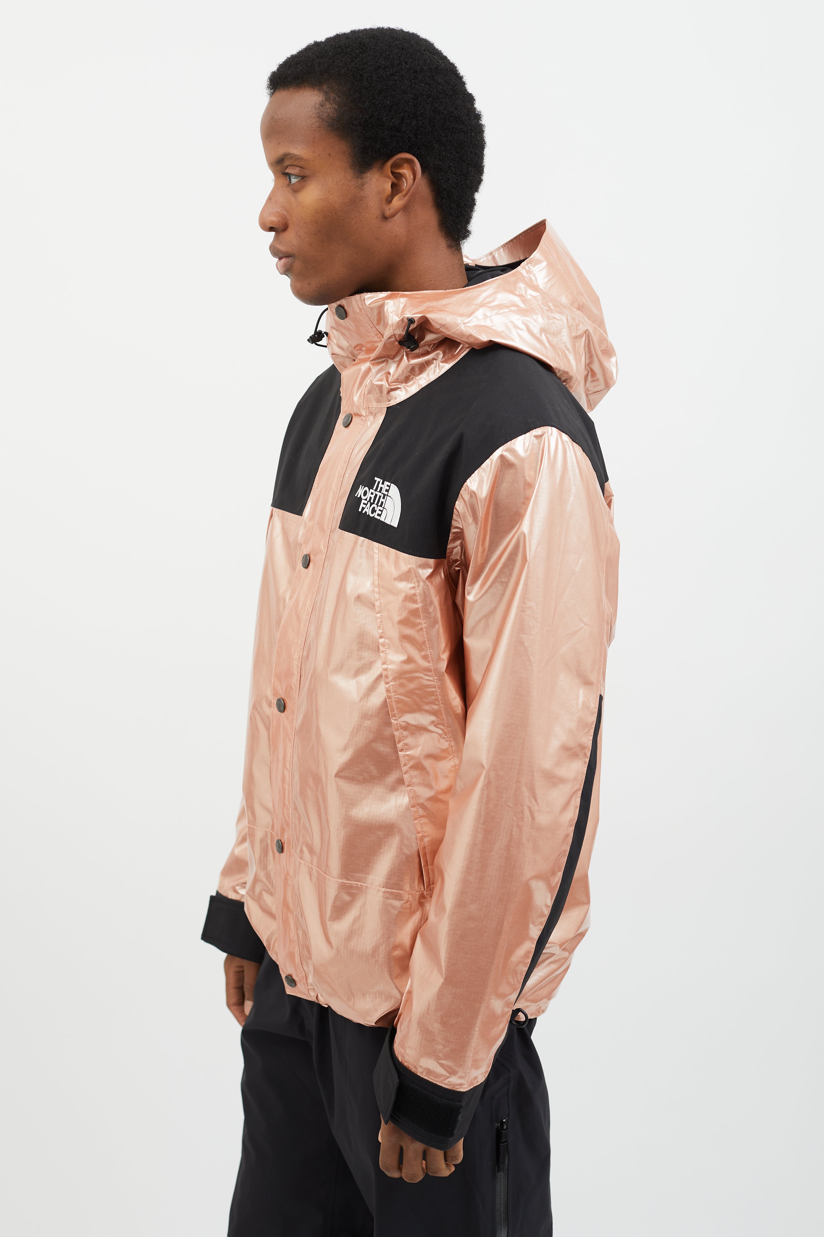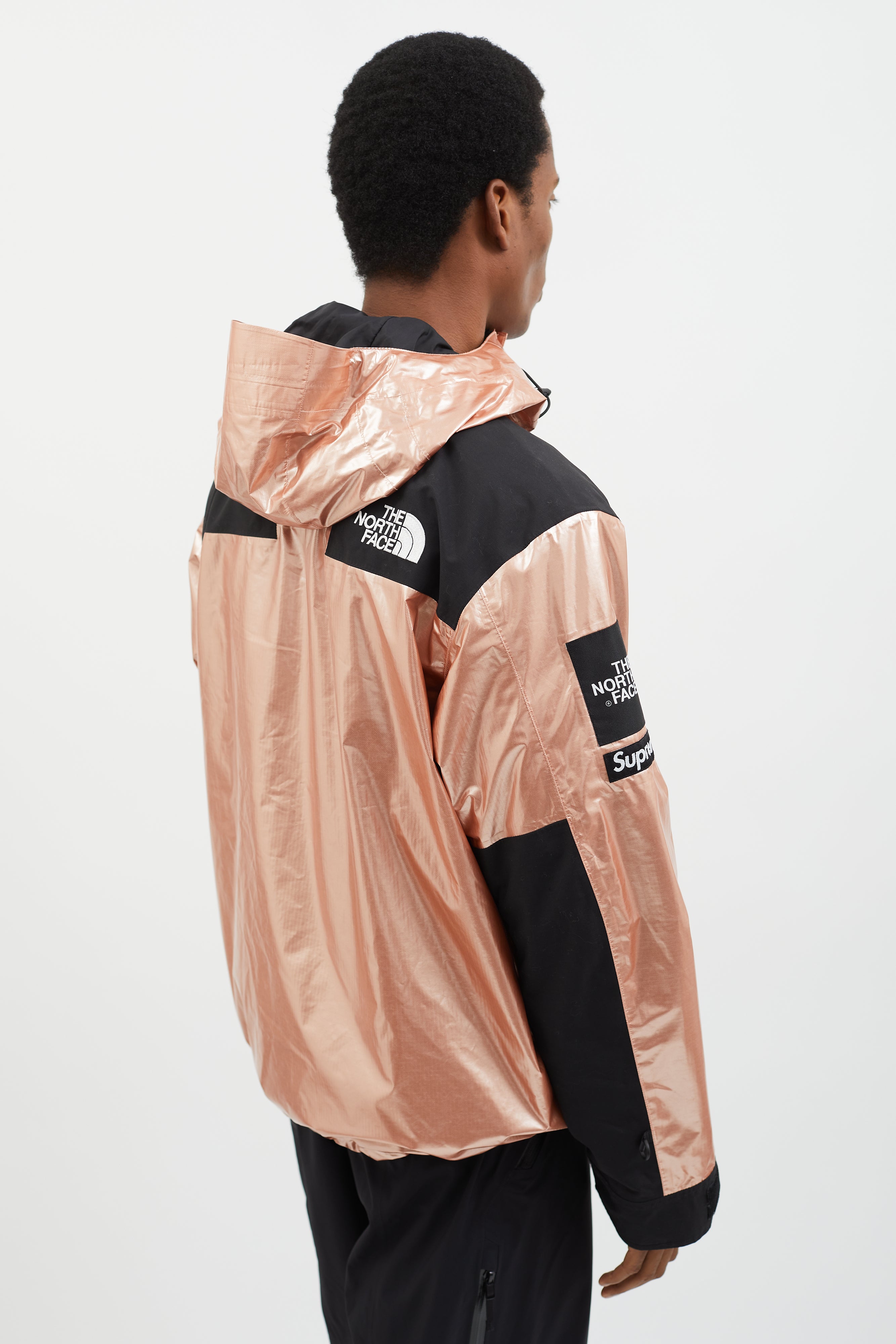 Pre-owned 2018 Supreme x The North Face Mountain Parka in metallic rose gold featuring attached hood with adjustable toggles, logo patch at chest, back, and sleeve, two oversized zippered pockets at side, toggle fastener at hem, snap button closure at front, and black panels at chest and sleeves.