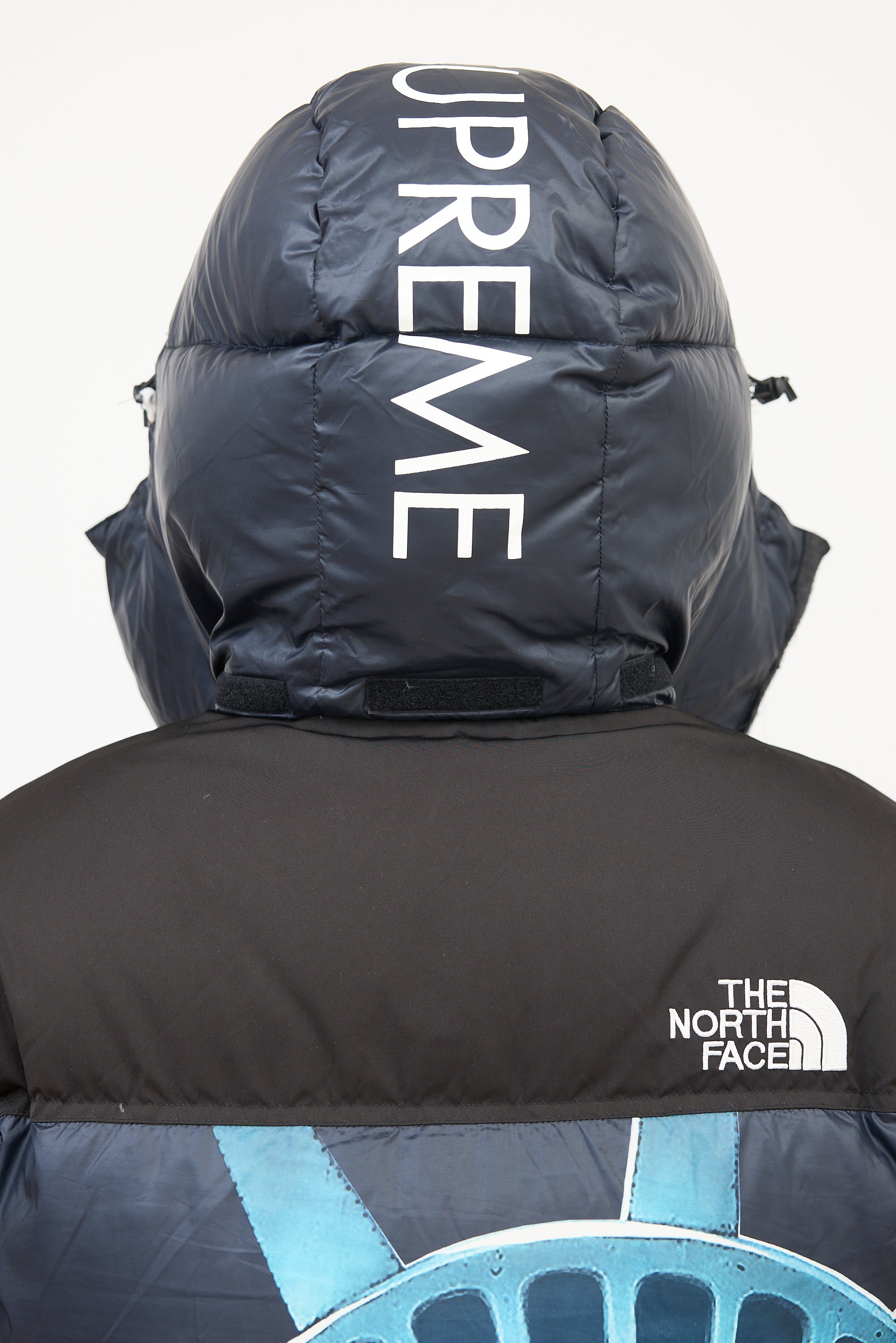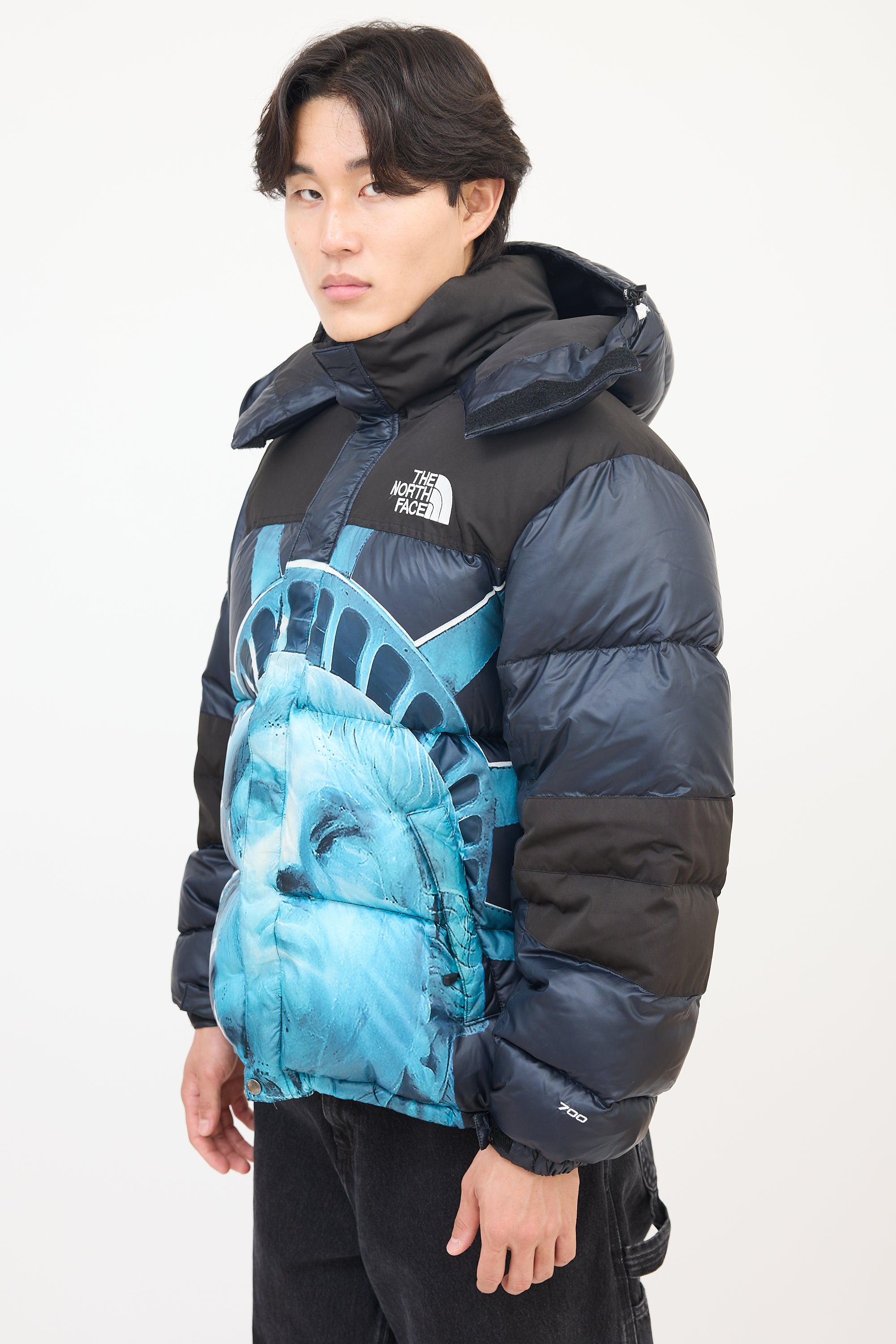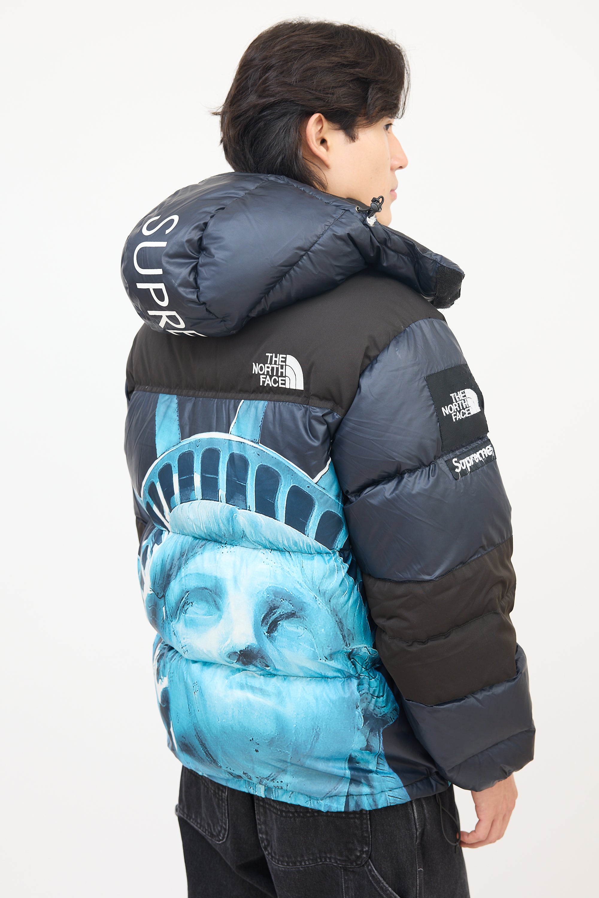 Pre-owned Supreme X The North Face black and blue Baltoro puffer jacket featuring a funnel collar, adjustable drawcord hood with logo printed along centre, front zip, two zip pockets at front waist, one interior zip pocket at left waist, one interior mesh patch pocket at right chest, Statue of Liberty graphic at body, drawcord at hem, long sleeves with elasticized and Velcro strapped cuffs, patch logos at right arm, and embroidered logos at left chest and right upper back. Padded and lined.