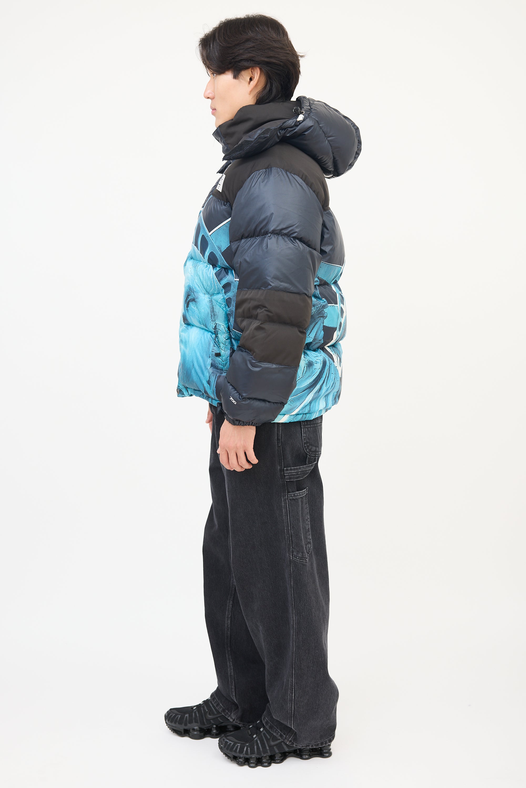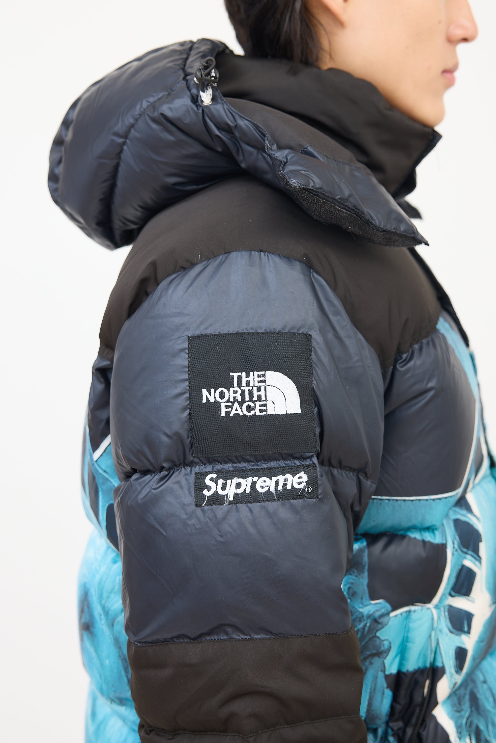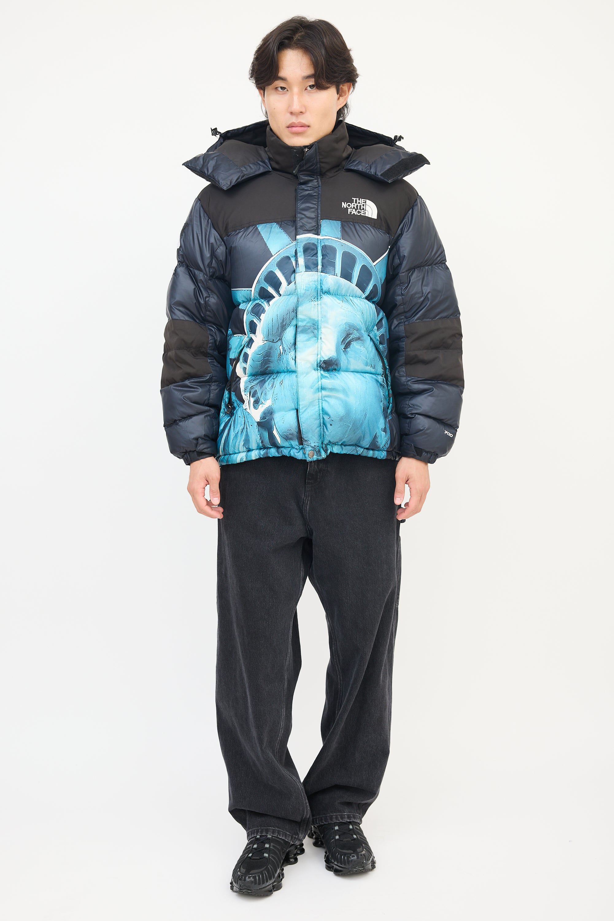 Pre-owned Supreme X The North Face black and blue Baltoro puffer jacket featuring a funnel collar, adjustable drawcord hood with logo printed along centre, front zip, two zip pockets at front waist, one interior zip pocket at left waist, one interior mesh patch pocket at right chest, Statue of Liberty graphic at body, drawcord at hem, long sleeves with elasticized and Velcro strapped cuffs, patch logos at right arm, and embroidered logos at left chest and right upper back. Padded and lined.
