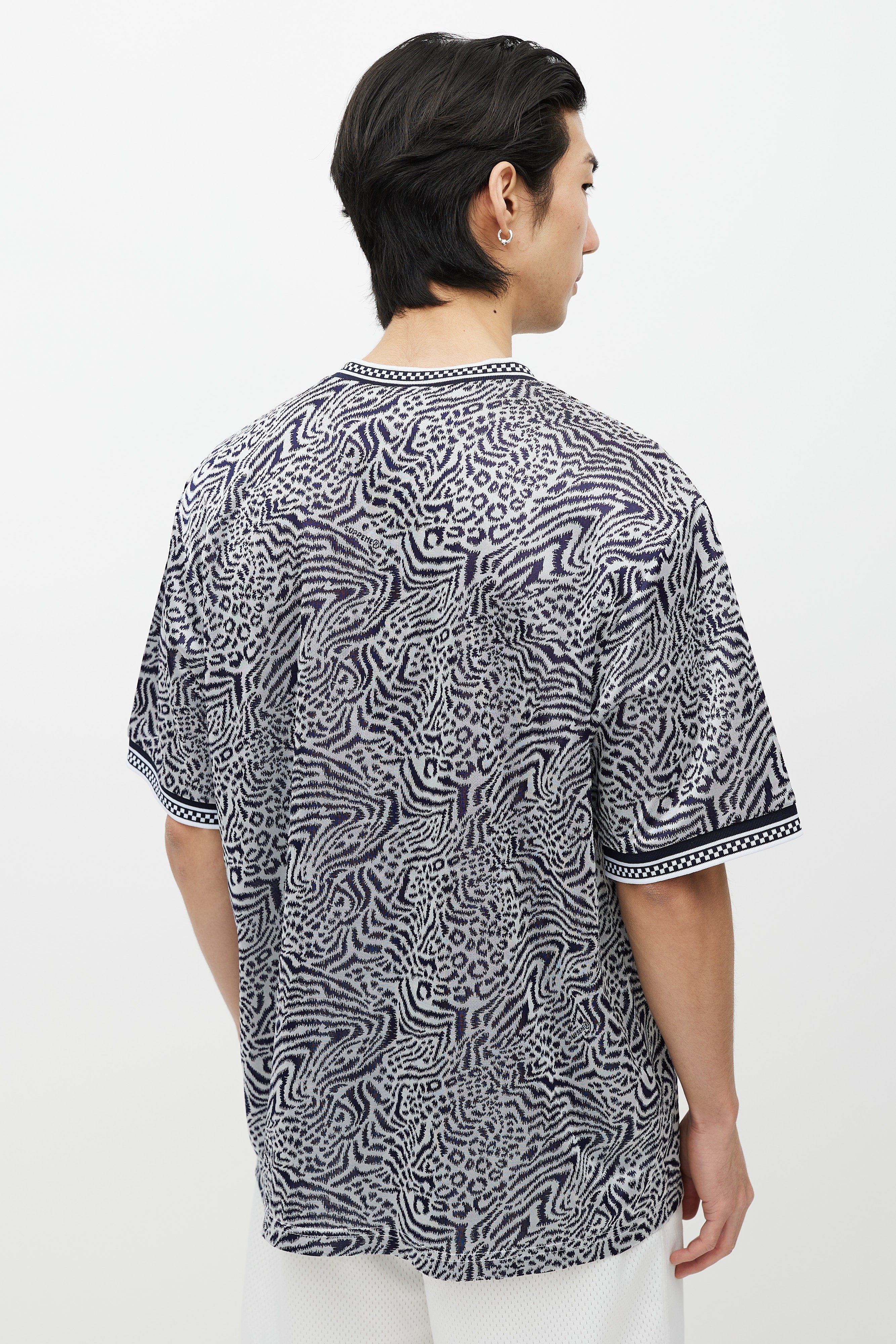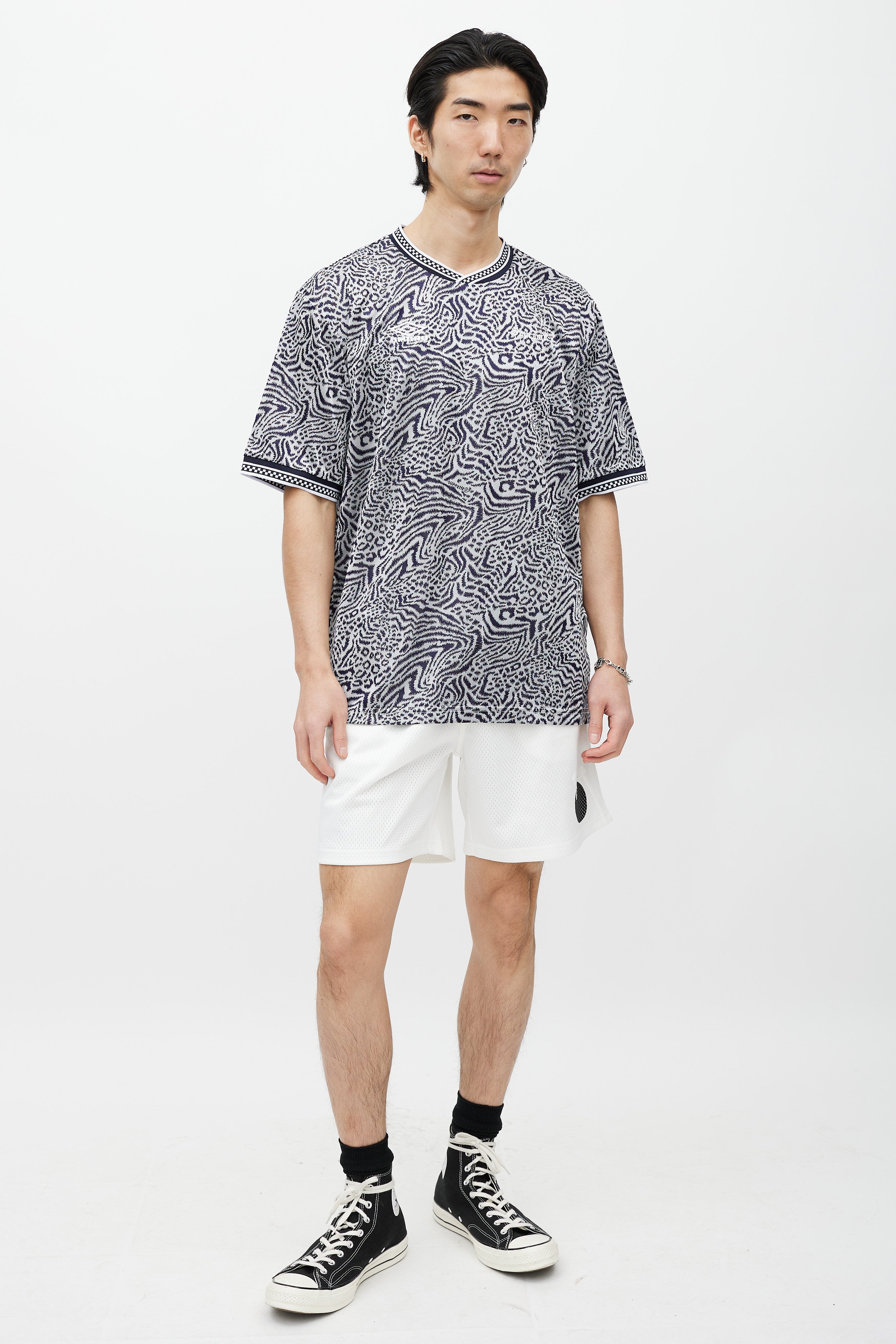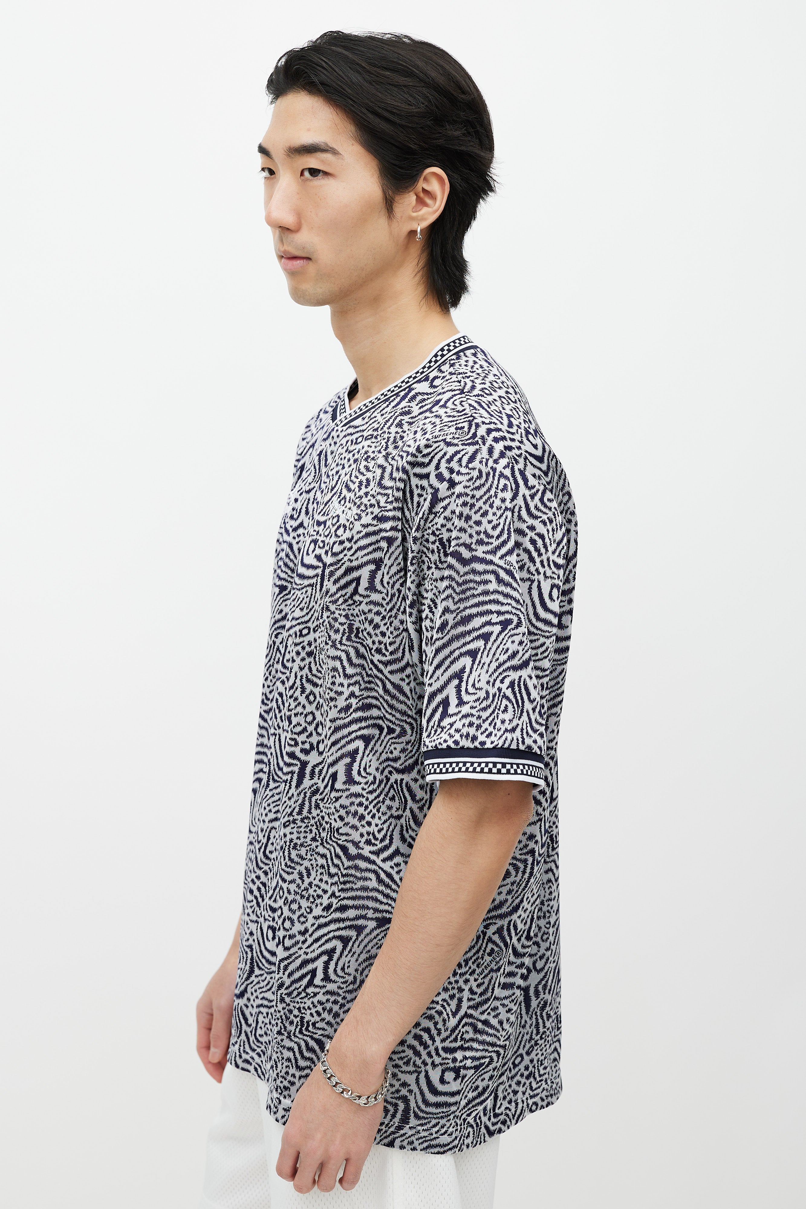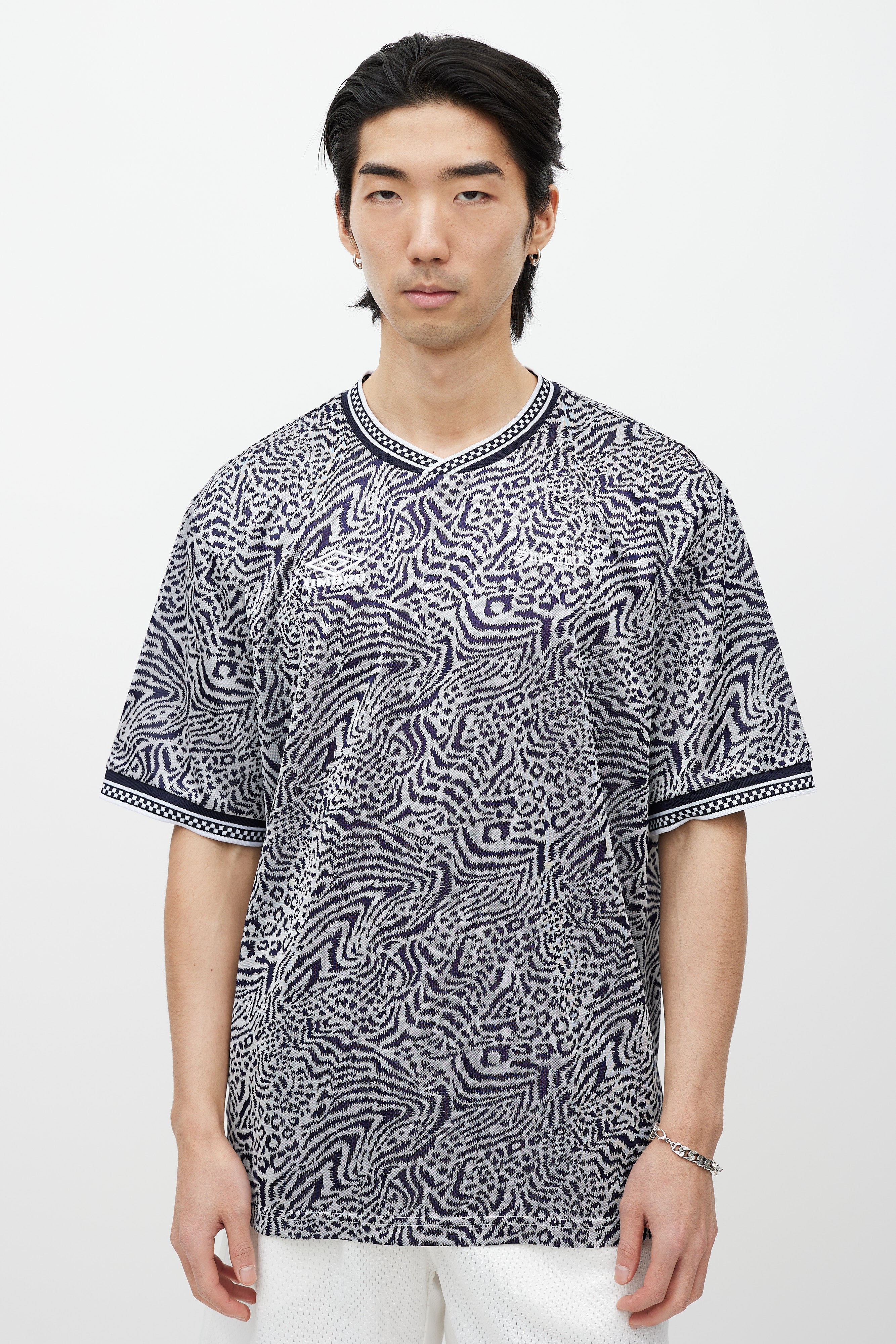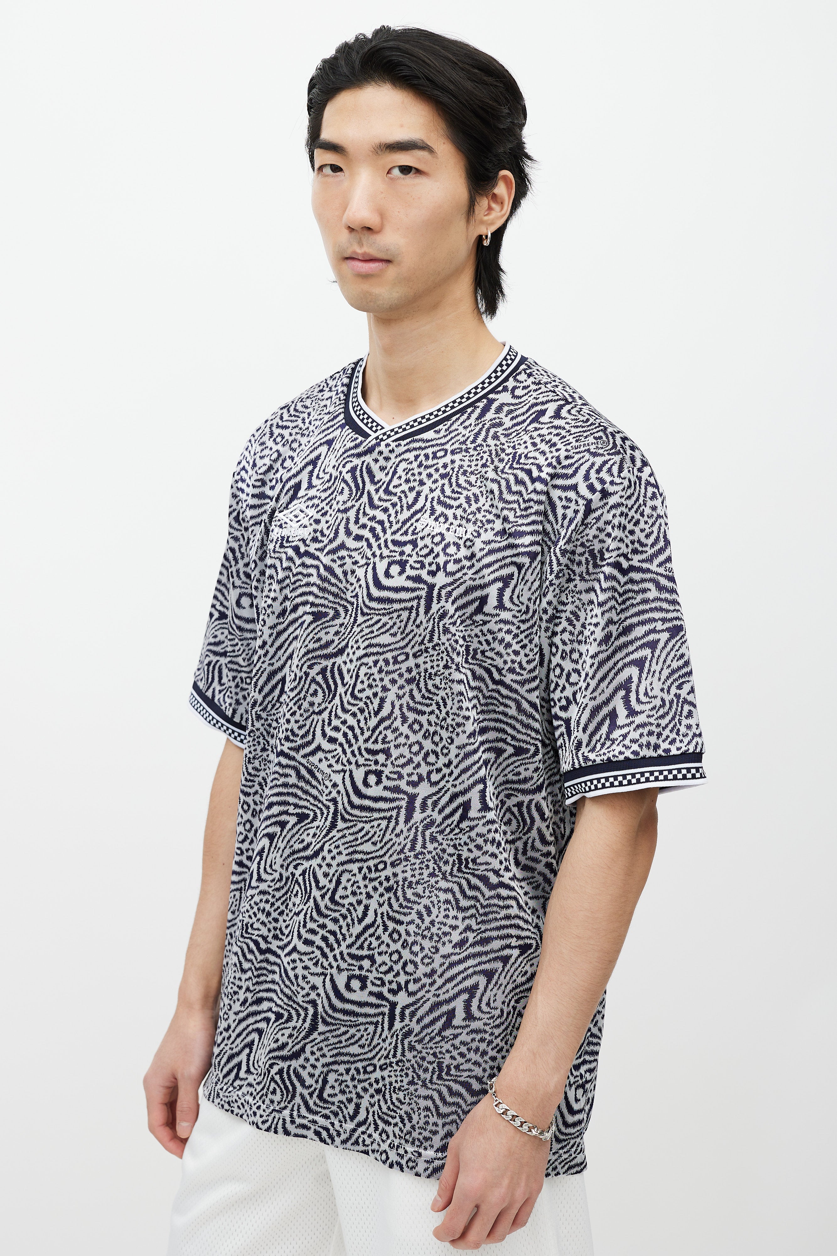 Pre-owned Supreme x Umbro navy and white tiger printed jersey T-shirt featuring embroidered white logo at chest, V-neck, and ribbed cuffs.