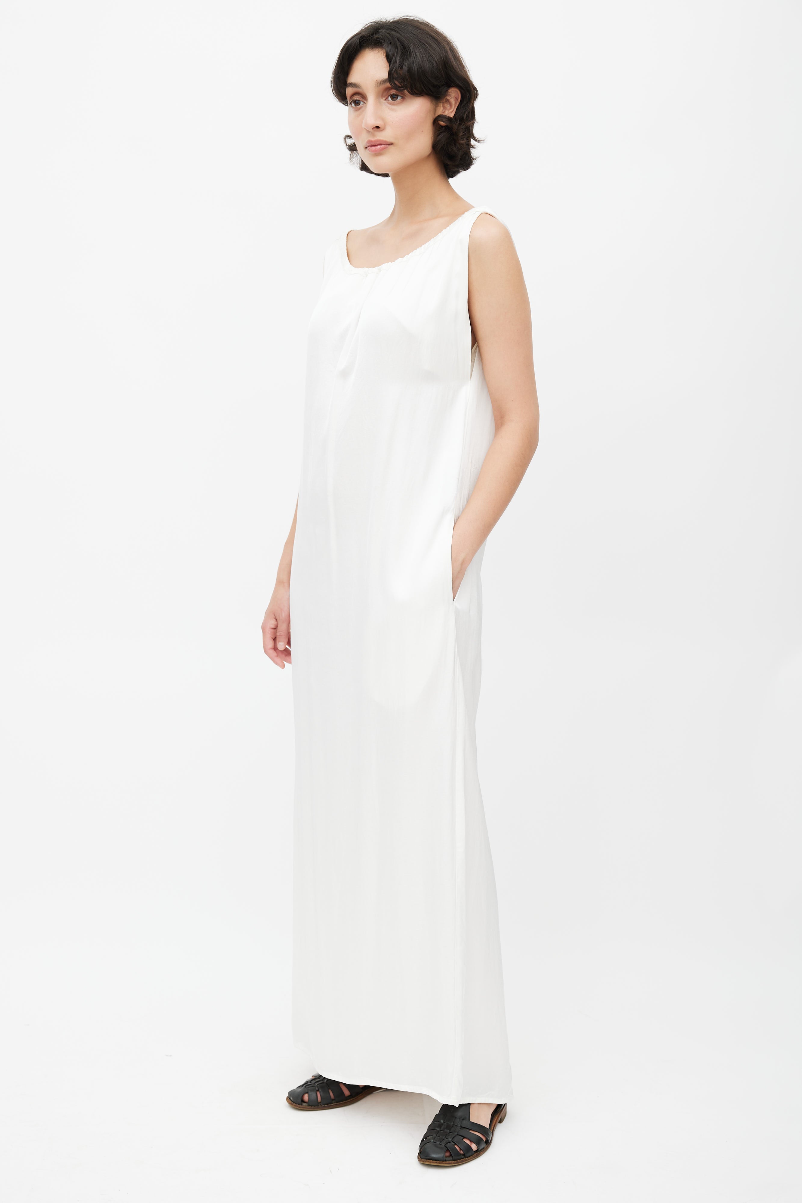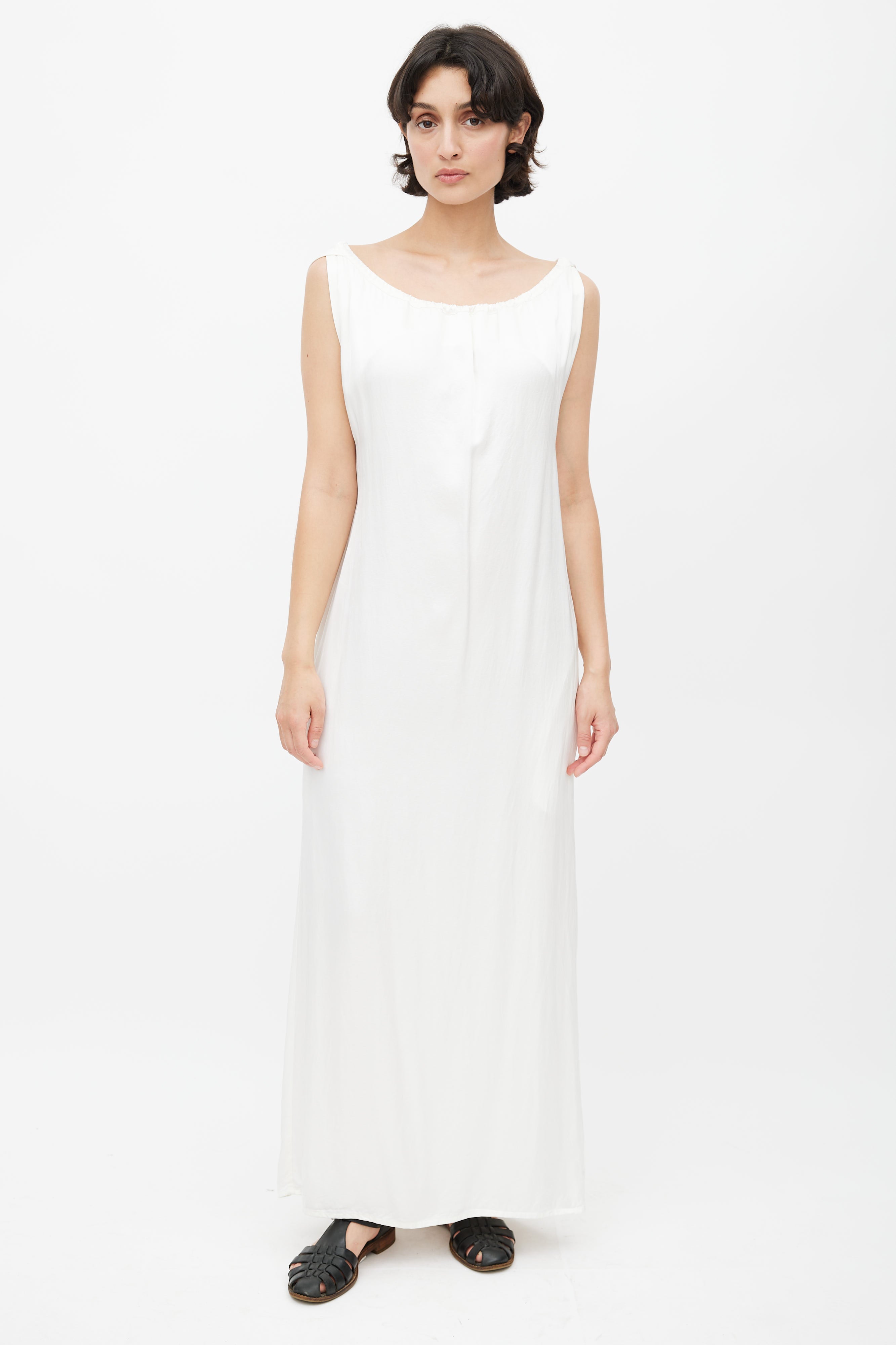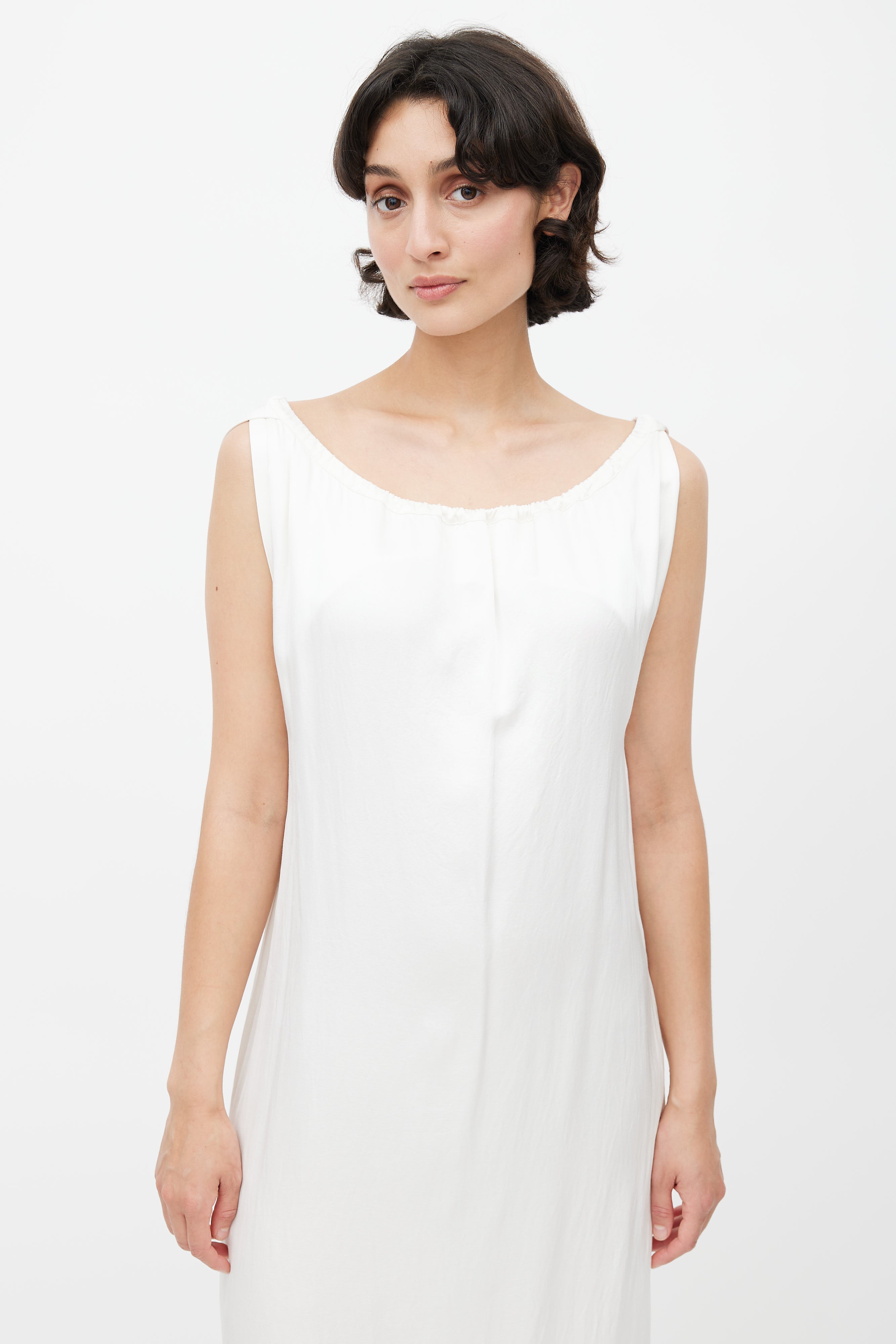 Pre-owned Yves Salomon white satin dress featuring adjustable neckline with drawstring fastening, back vent, and concealed hip pockets. Unlined.