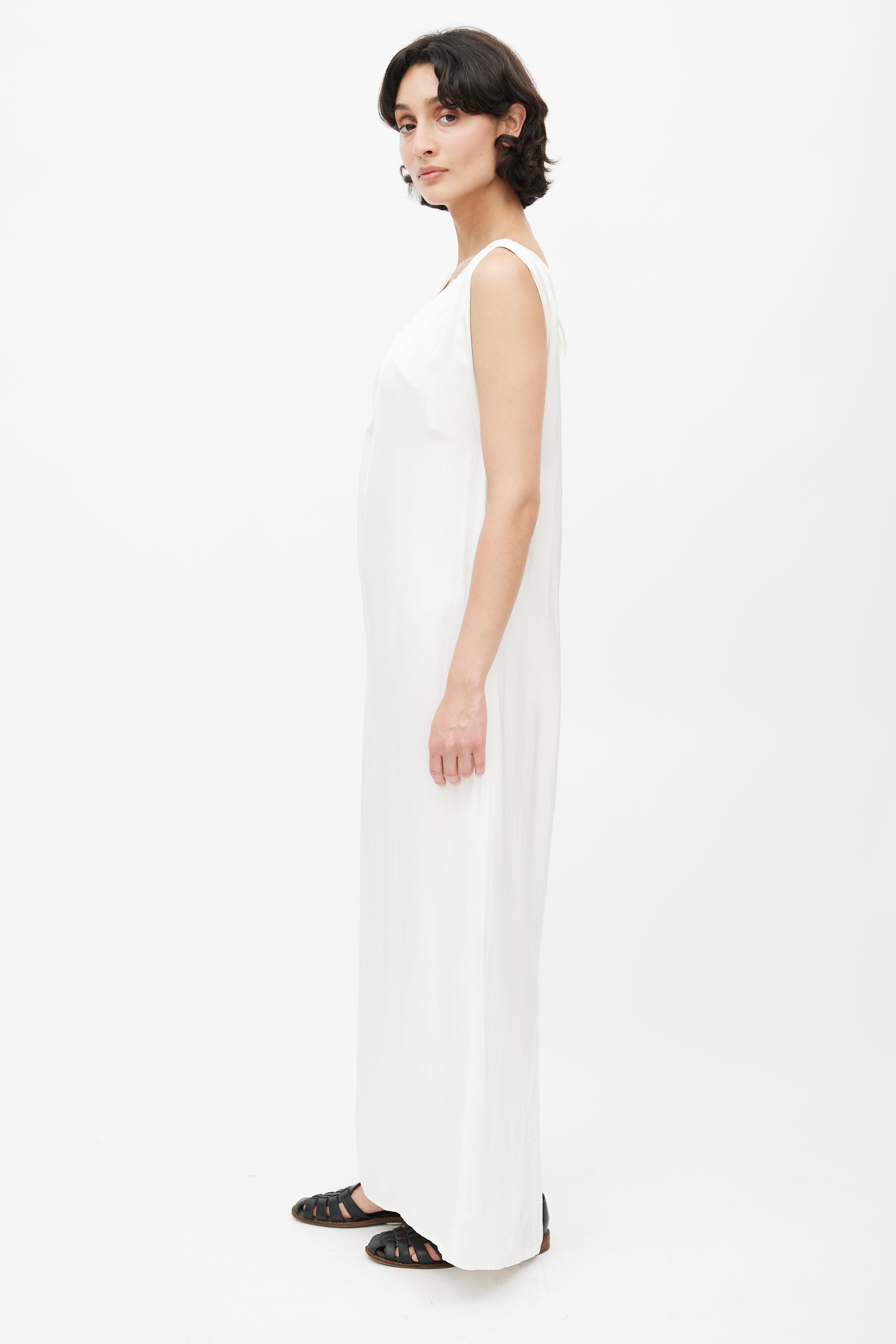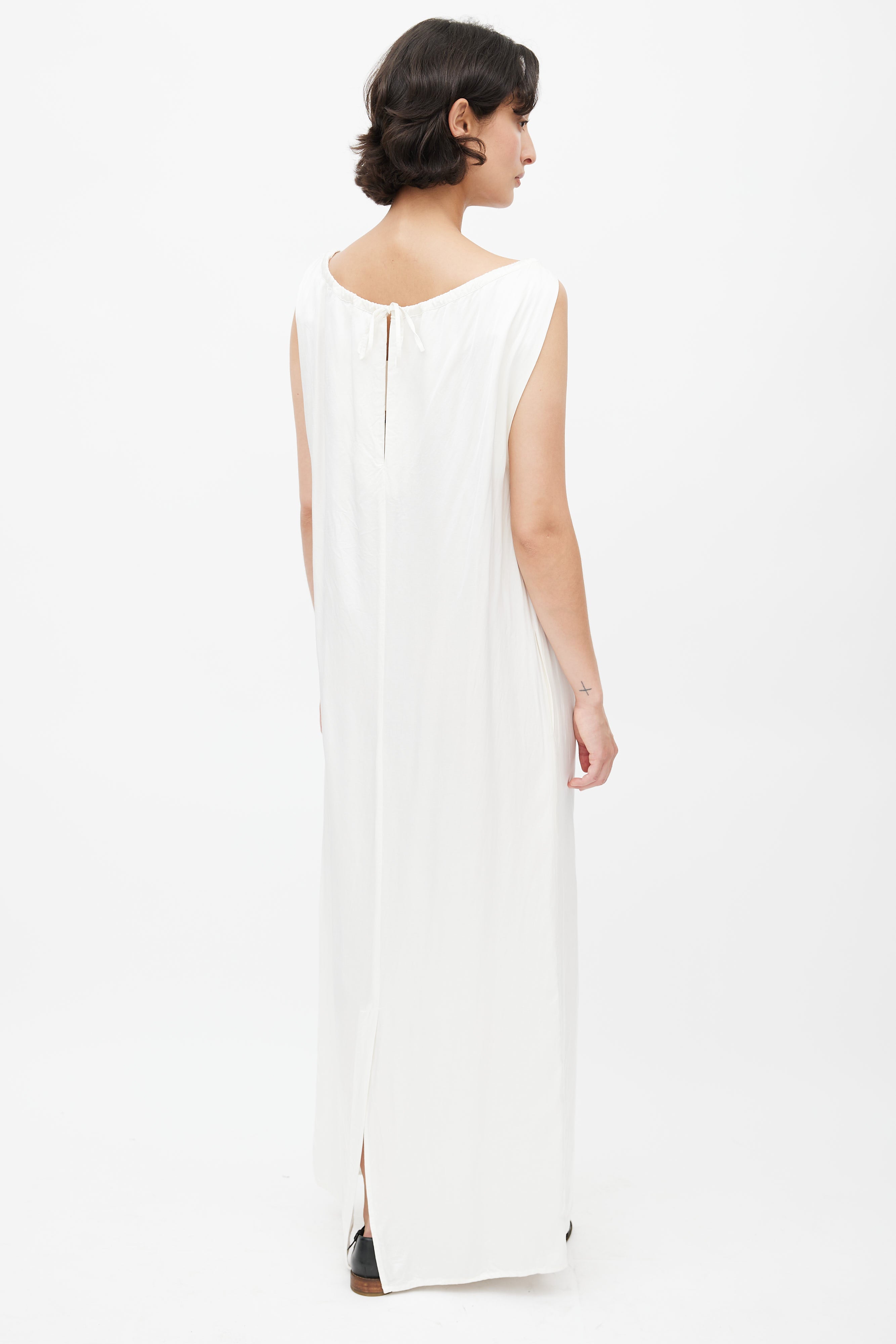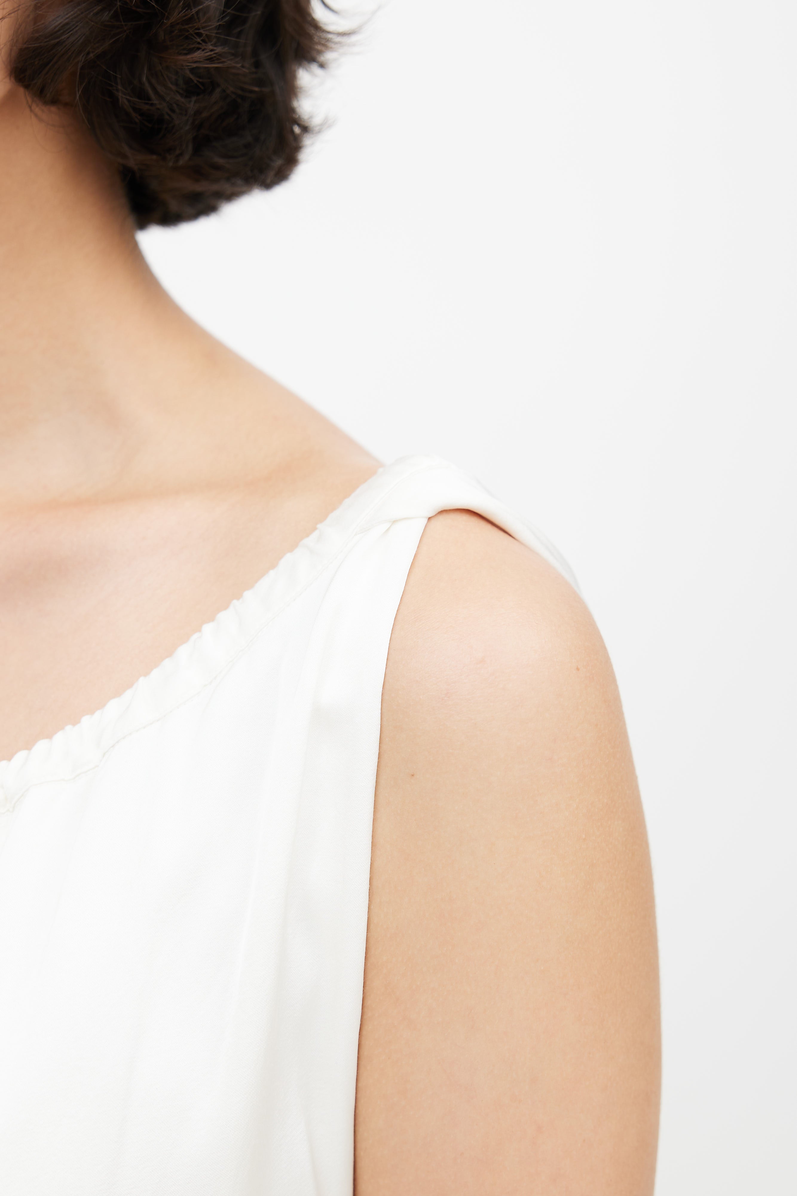 Pre-owned Yves Salomon white satin dress featuring adjustable neckline with drawstring fastening, back vent, and concealed hip pockets. Unlined.