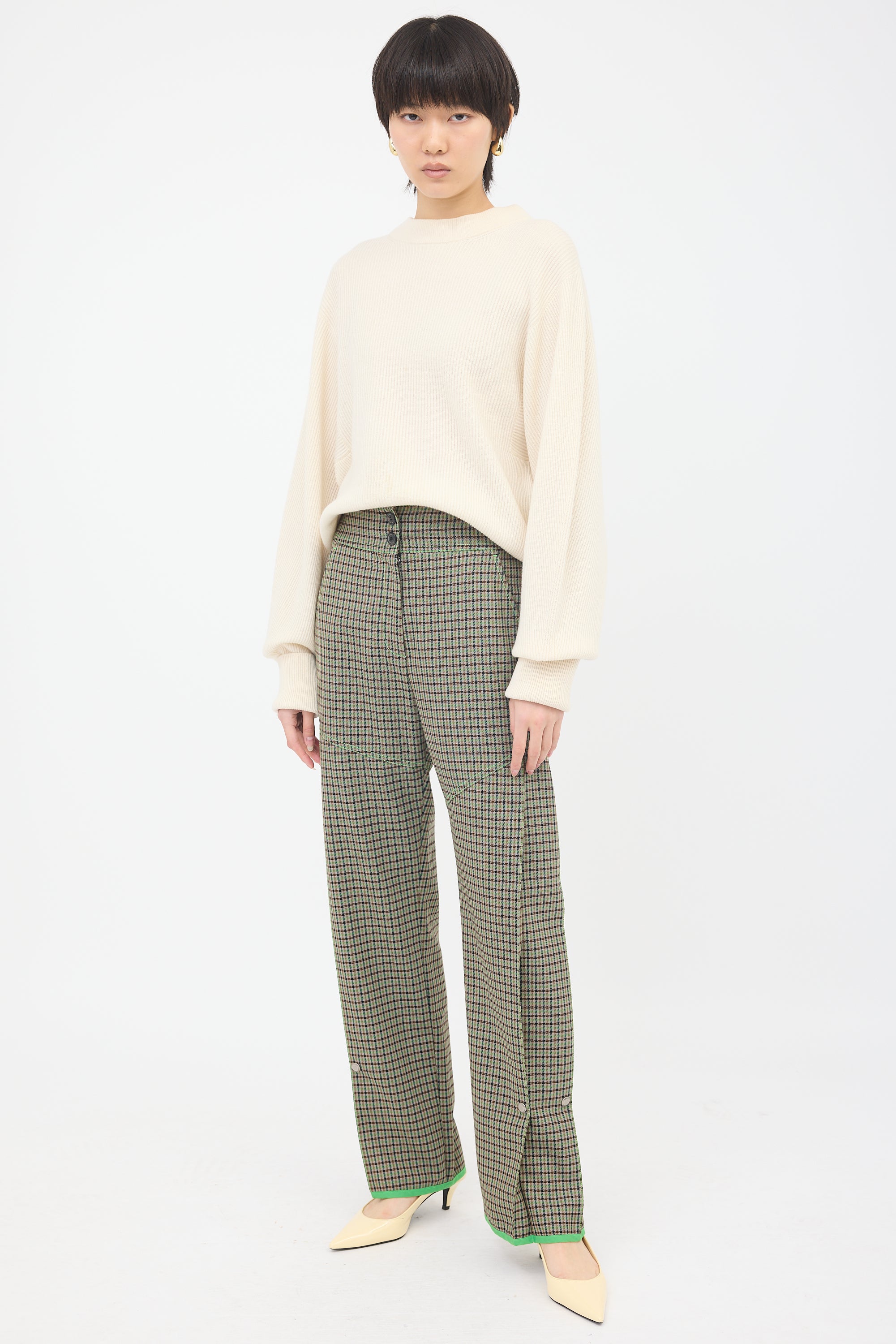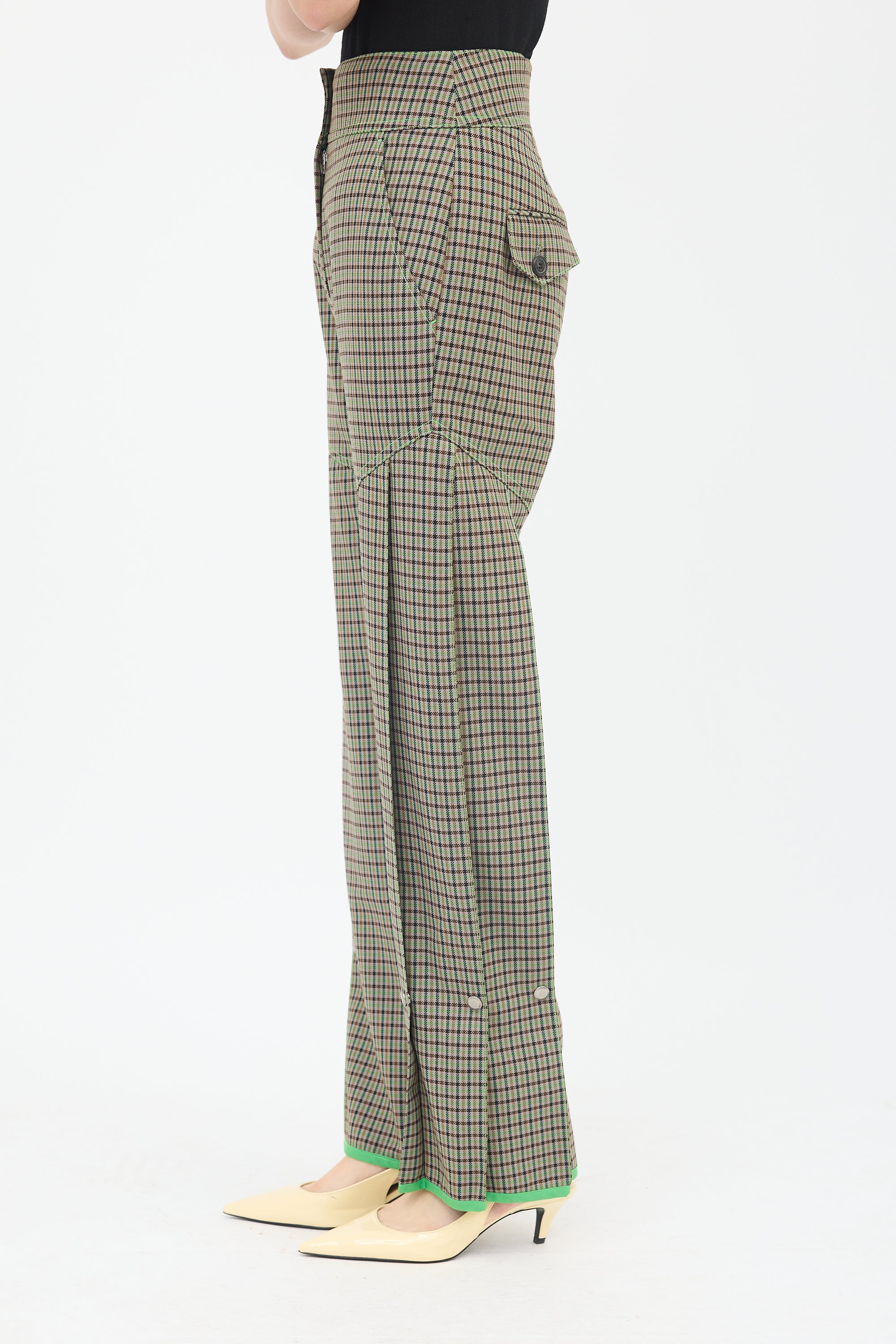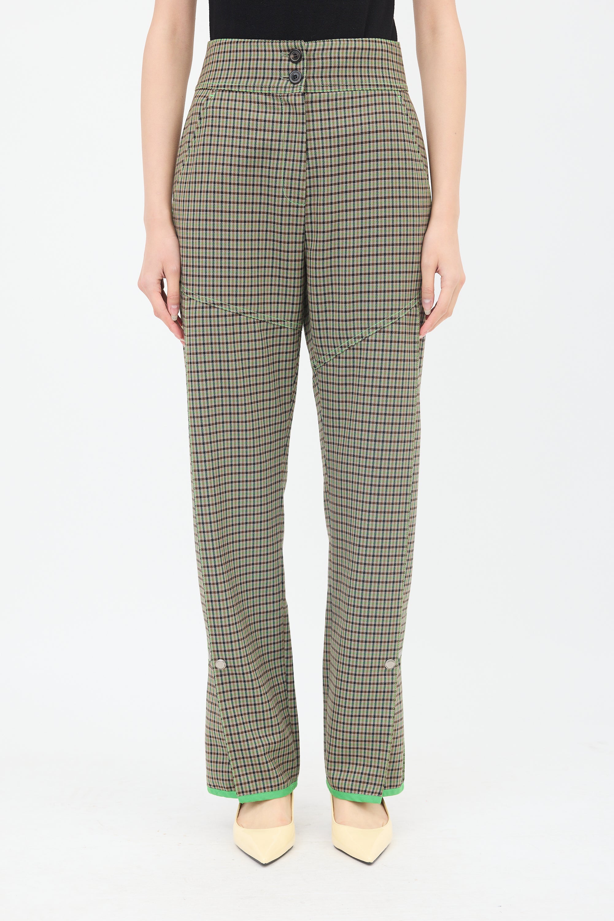 Pre-owned Andersson Bell wool blend Celina trousers featuring a multicolour check pattern, high rise, zip fly with button fastenings, four pocket styling, tonal stitching, pleated legs with snap fastenings, and straight leg with green trim at hems. Unlined.