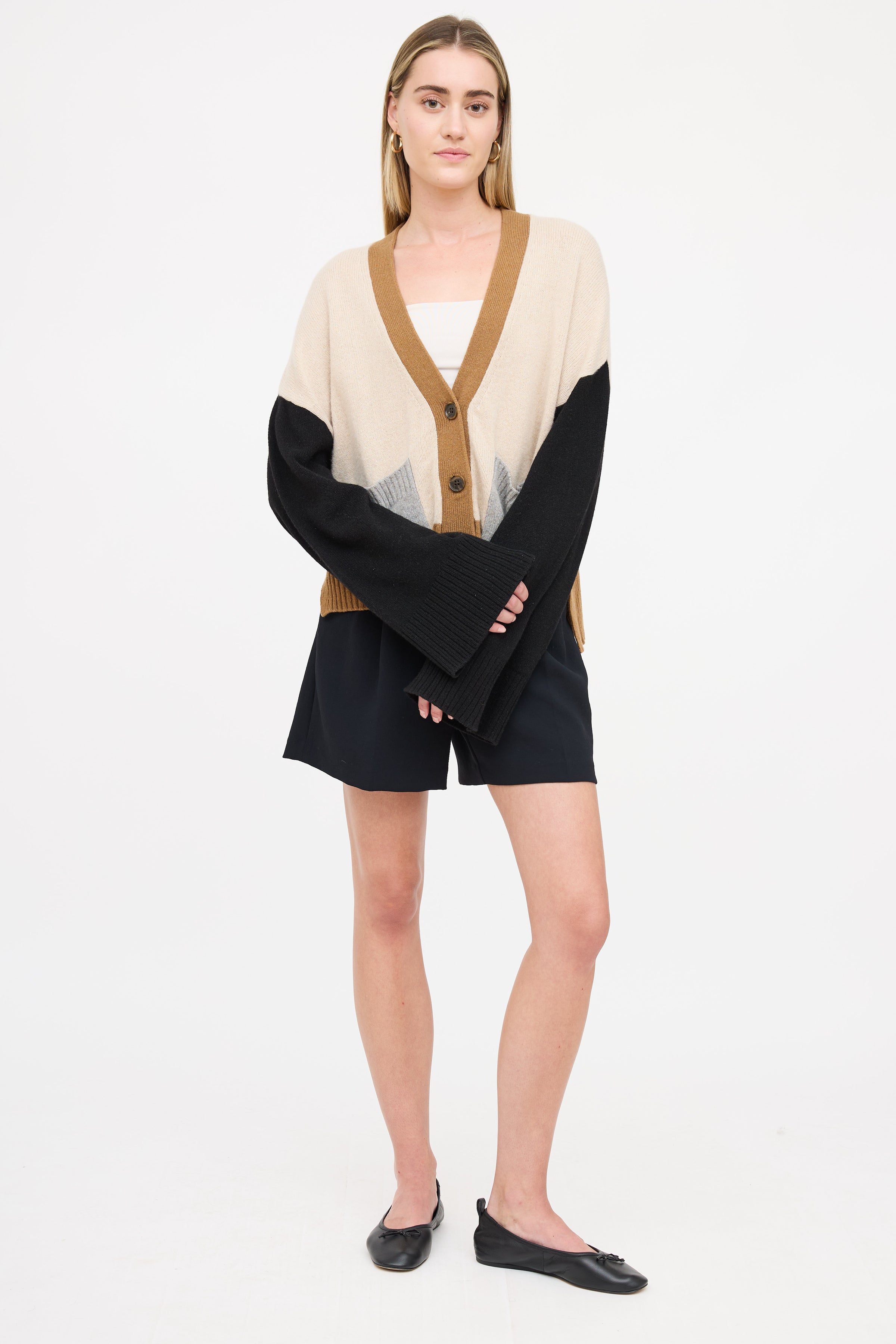 Pre-owned Frame beige and multicolor long sleeve cardigan featuring v-neckline, button front, and patch pockets at front.