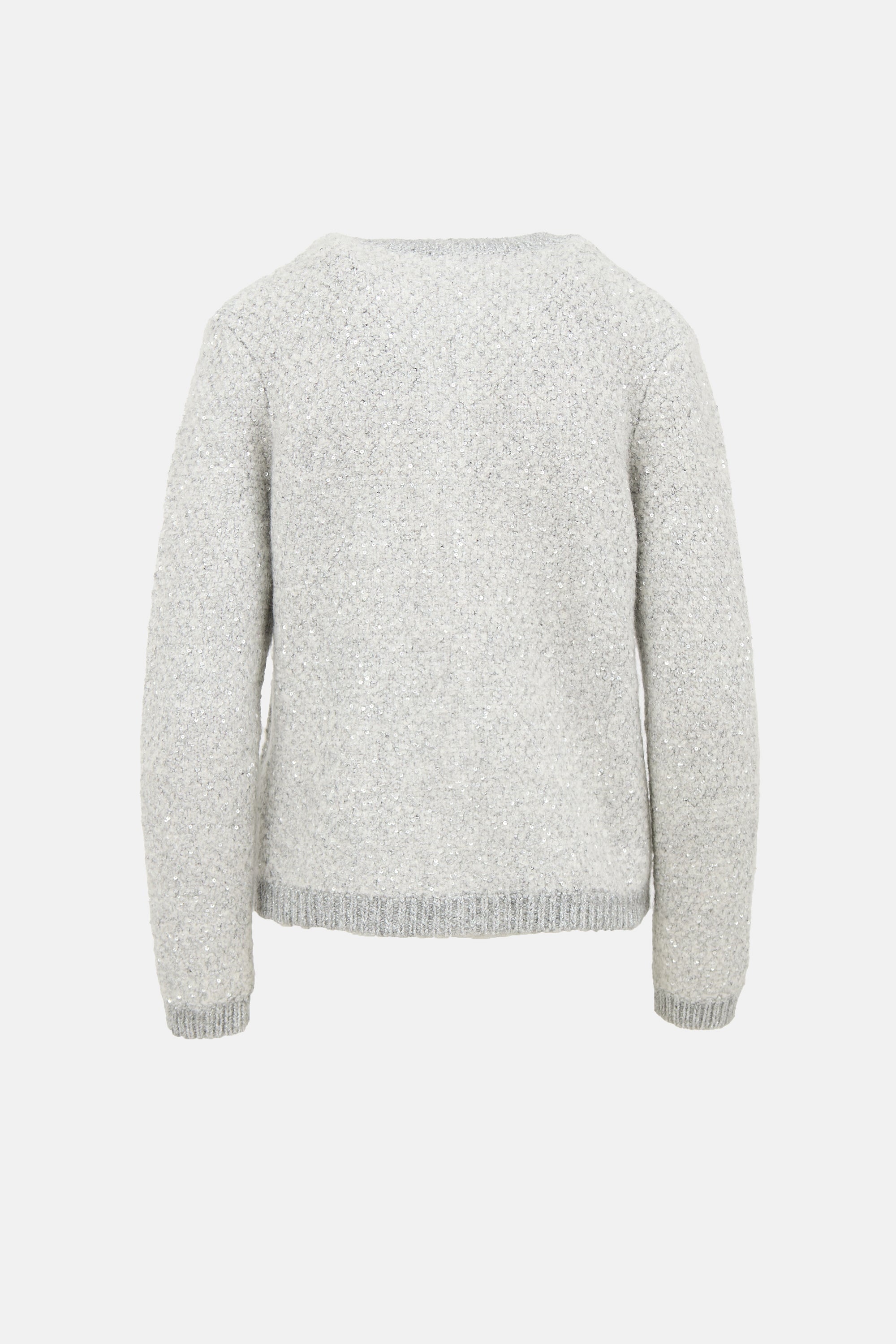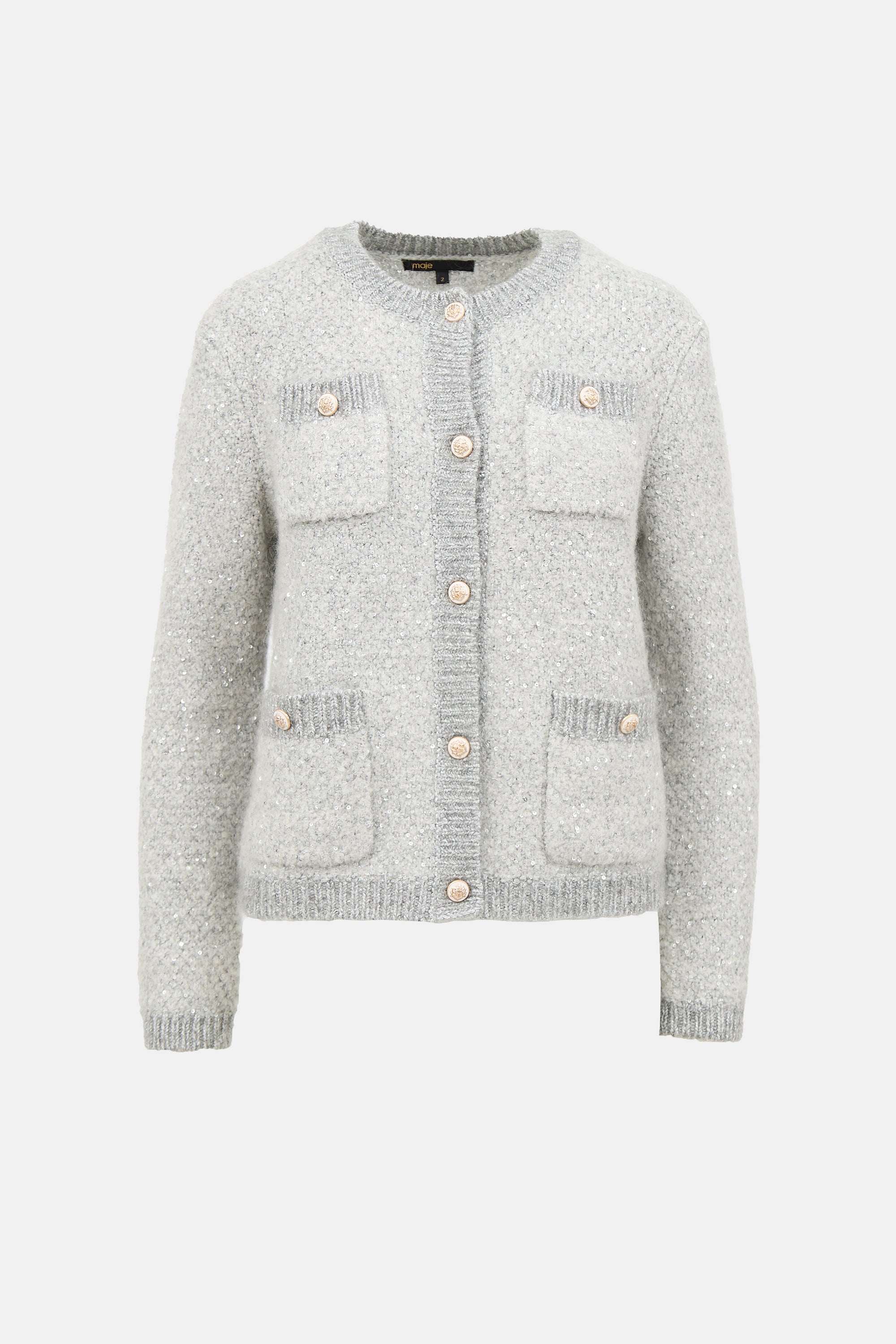 Pre-owned Maje grey knit sequin cardigan featuring a ribbed crew neckline, button front with gold tone embellished hardware, four buttoned patch pockets, and a ribbed hem and cuffs.