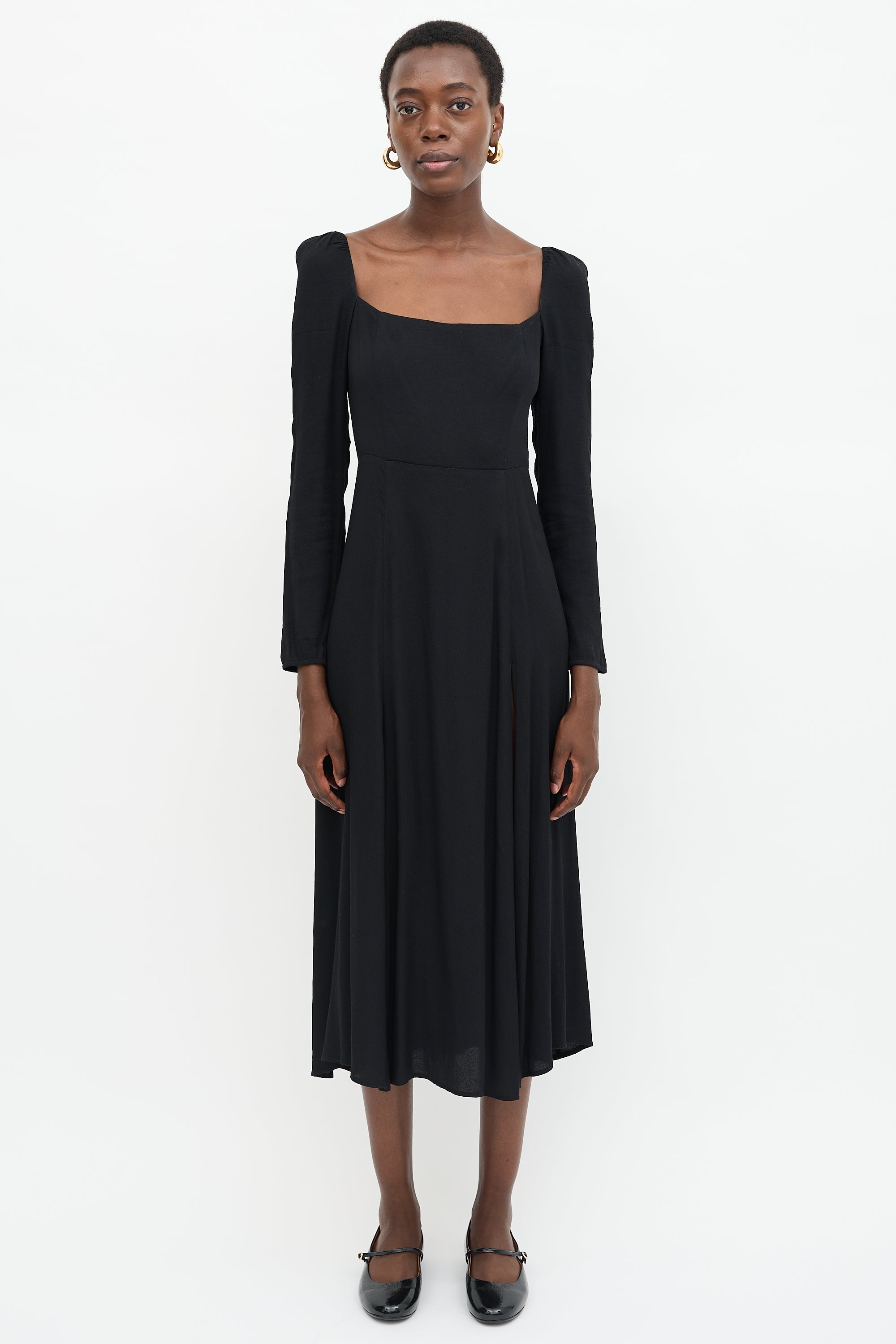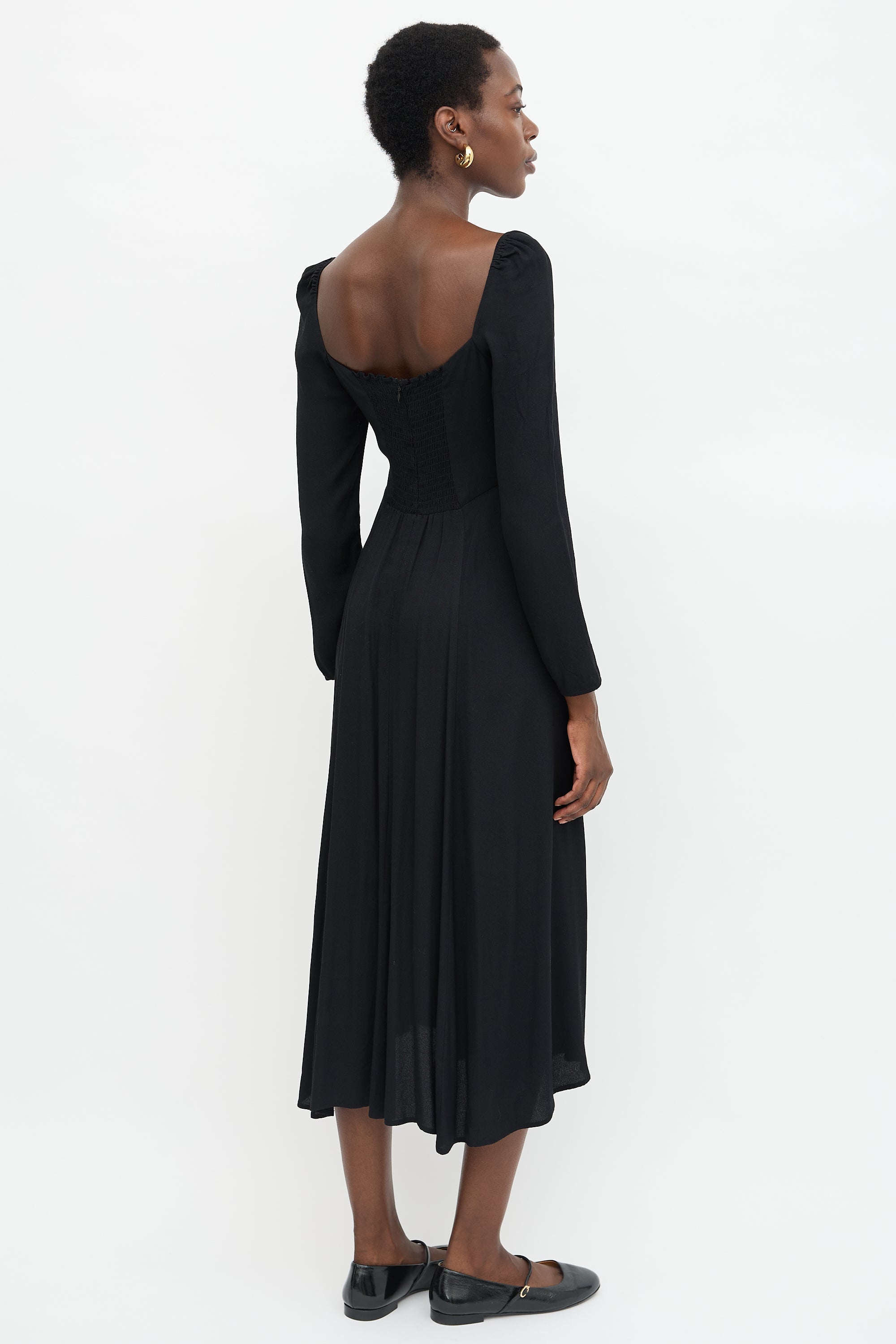 Pre-owned Reformation black Elly midi dress featuring square neckline, smocked back, leg slit, elasticized cuffs, and concealed back zip.