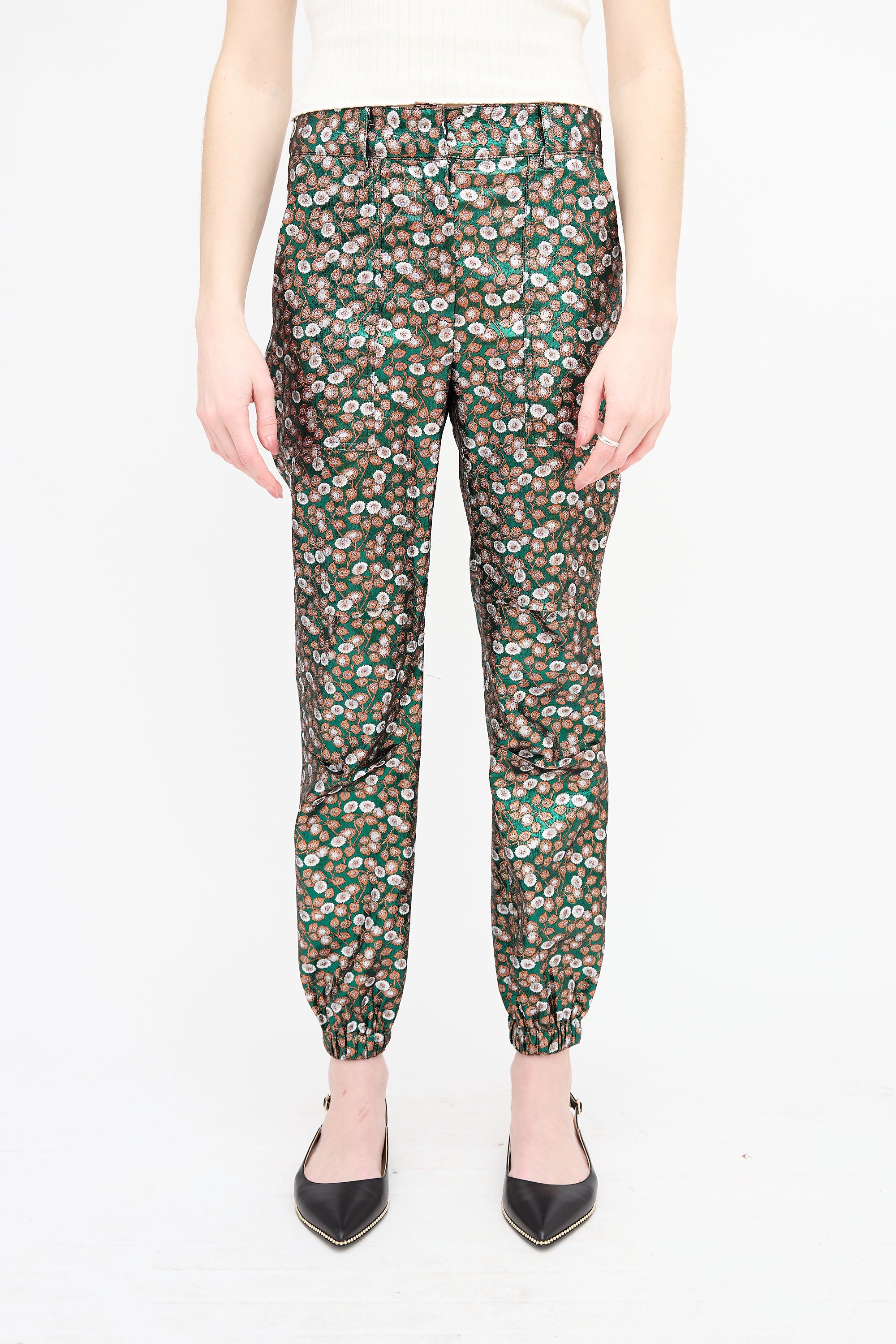 Pre-owned Sea green metallic joggers featuring a brocade floral print, four pocket styling, belt loops, zip fly with hook closure, knee panel, and elasticized cuffs.