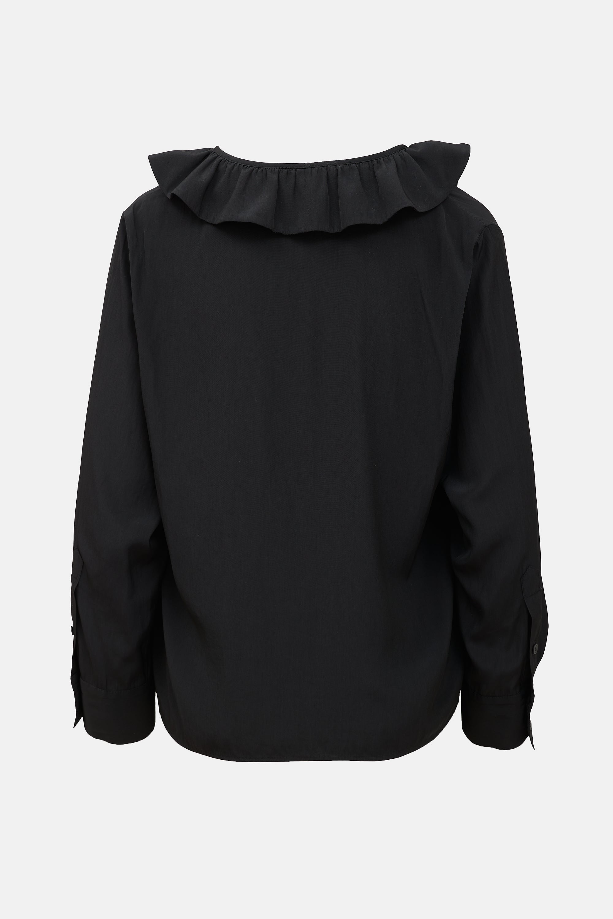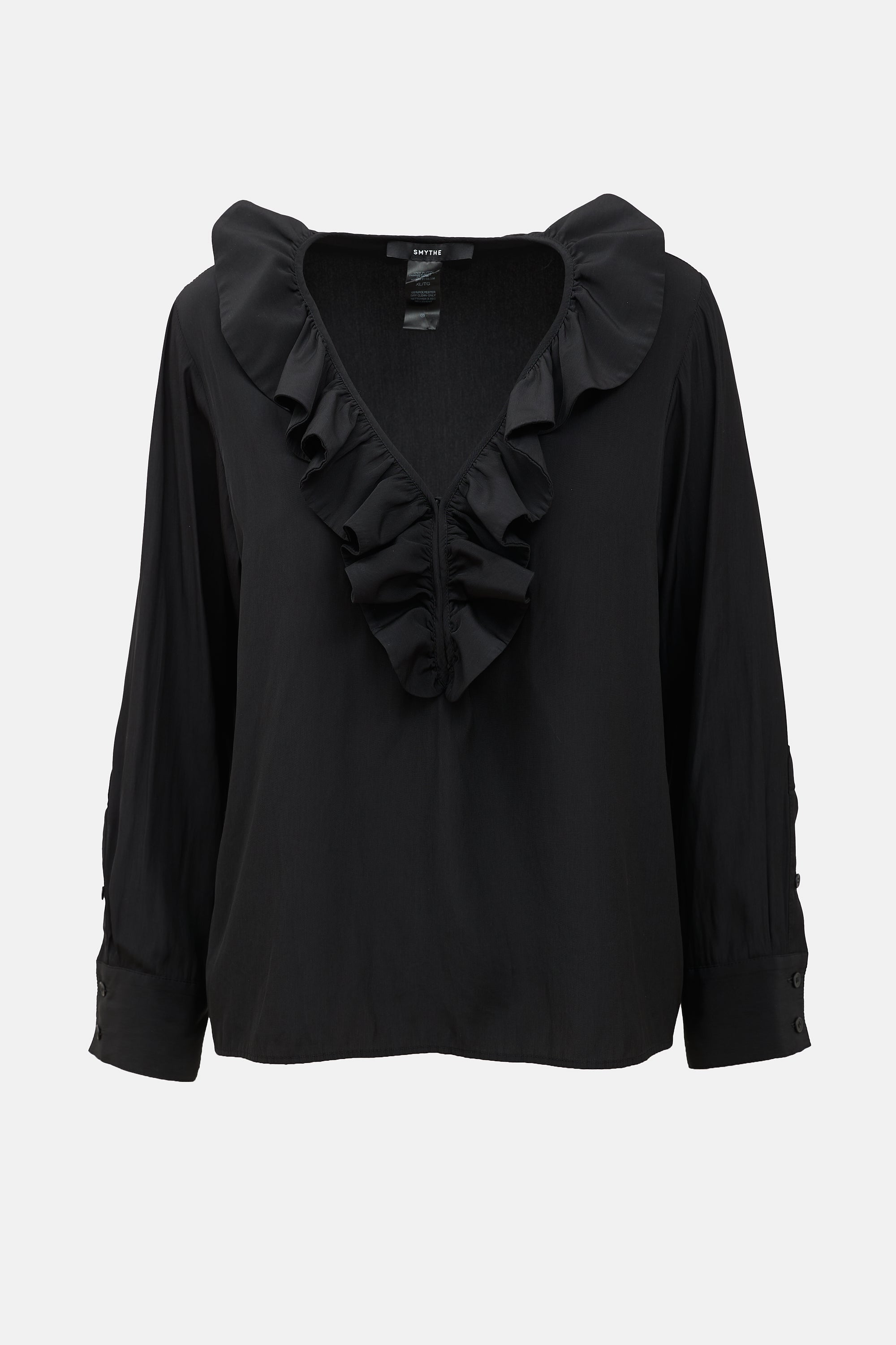 Pre-owned Smythe black Deep V Ruffle blouse featuring V-neckline with ruffled trim and button closure, and long sleeves with buttoned cuffs.