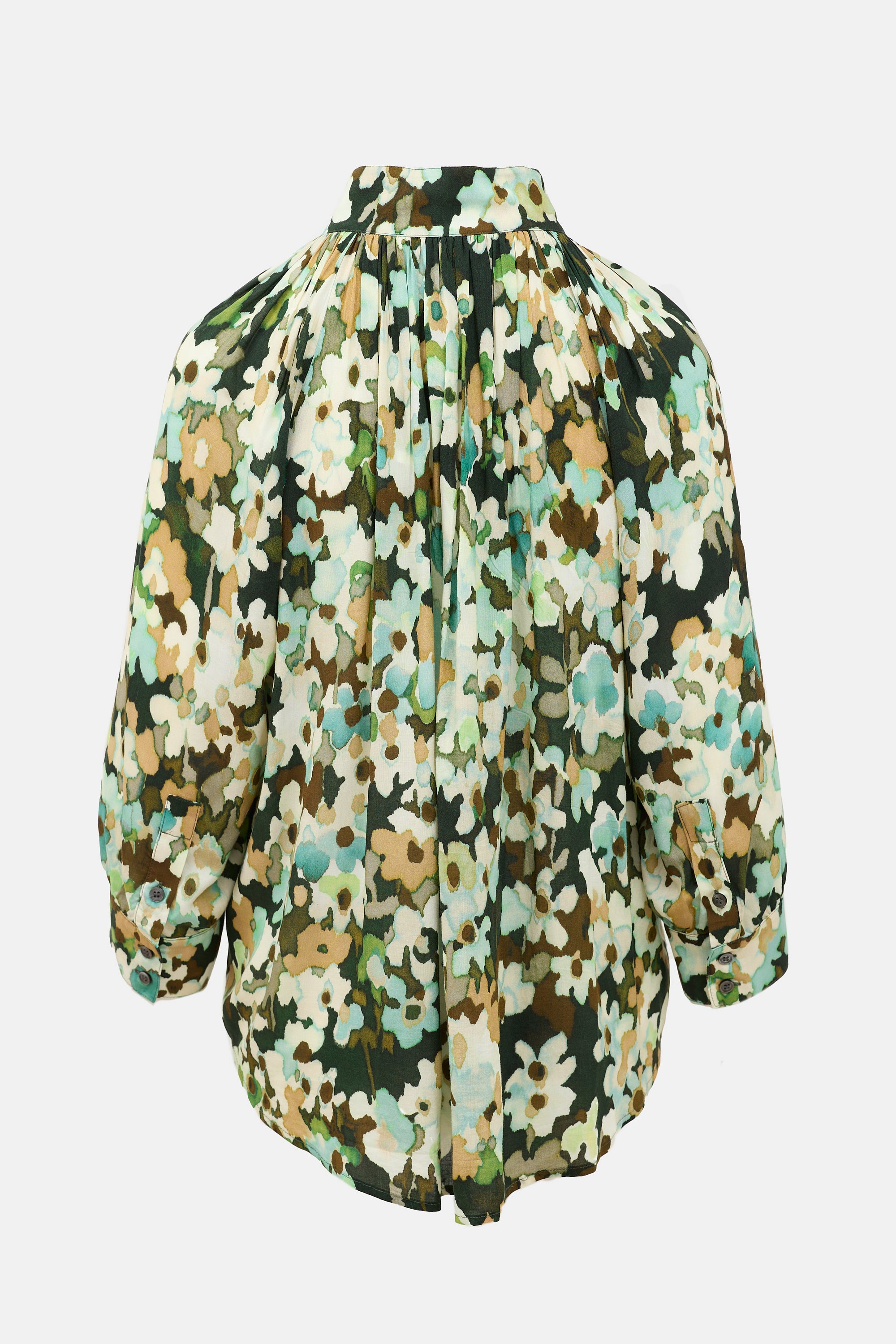 Pre-owned Smythe brown and green Forest Floral Gathered blouse featuring a stand collar, concealed button front, gathered yoke, and buttoned cuffs.