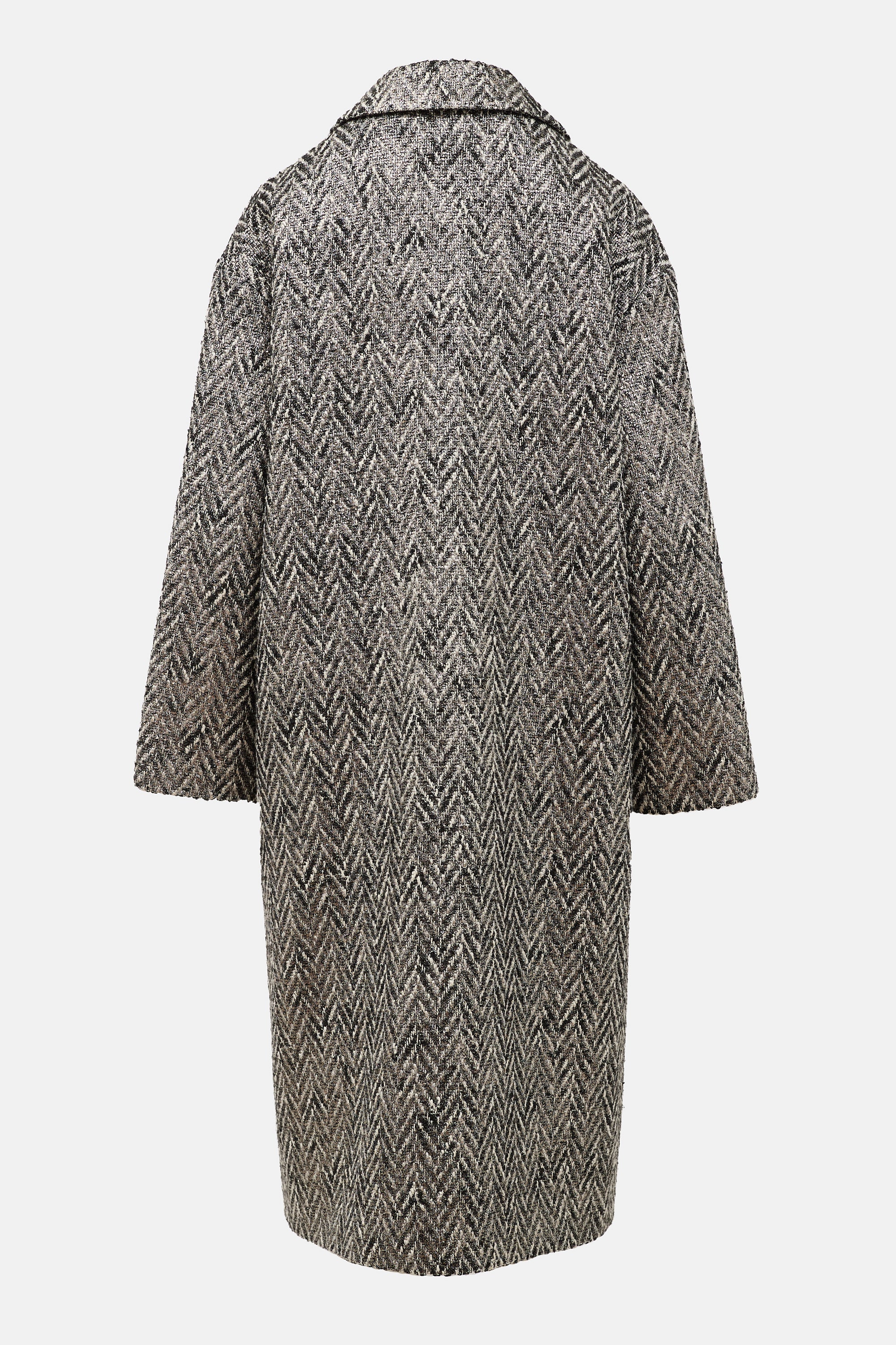 Pre-owned Smythe black and white tweed coat featuring silver tone metallic surface, notched lapel, single front button closure, and two front patch pockets. Lined.