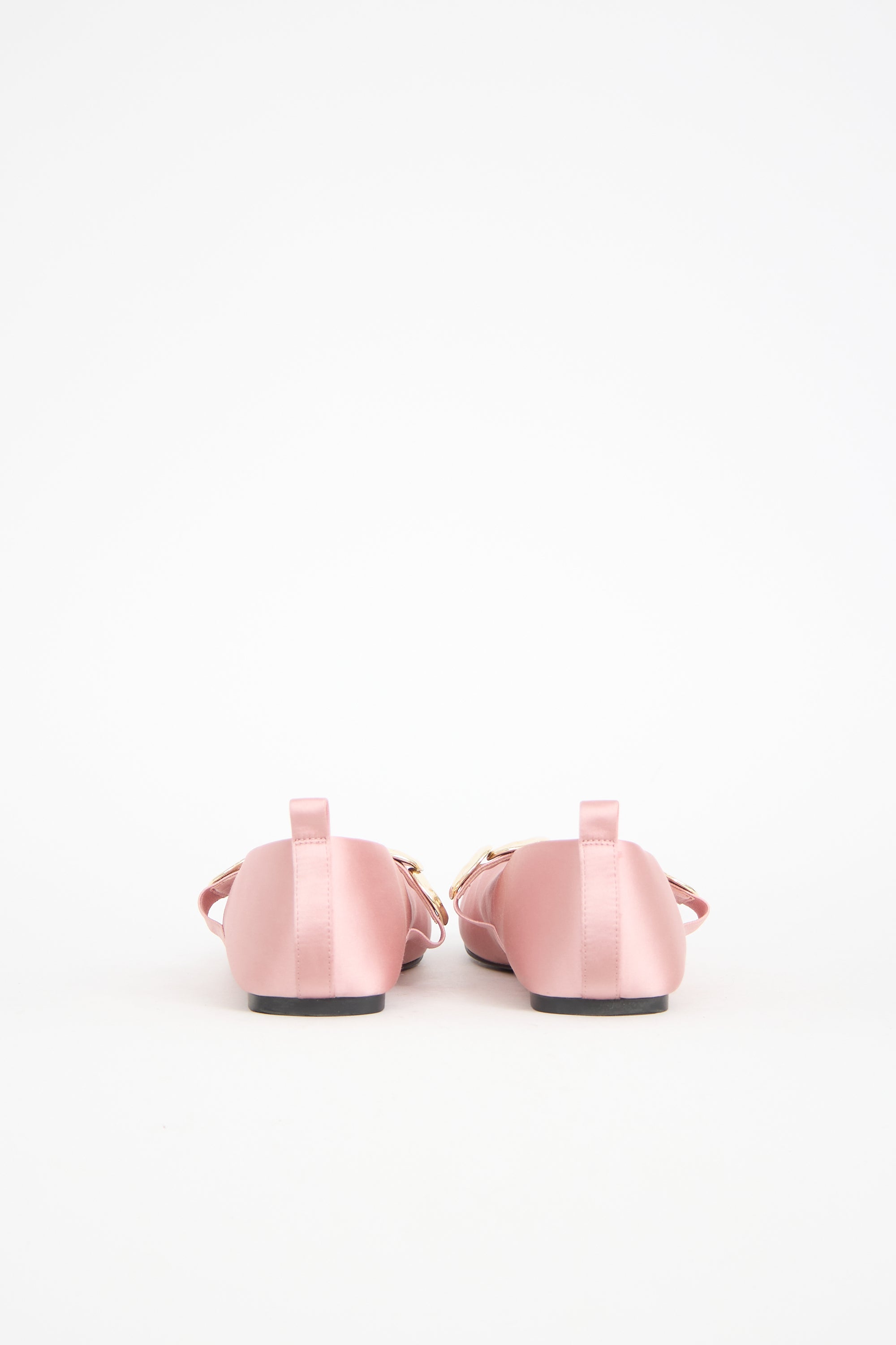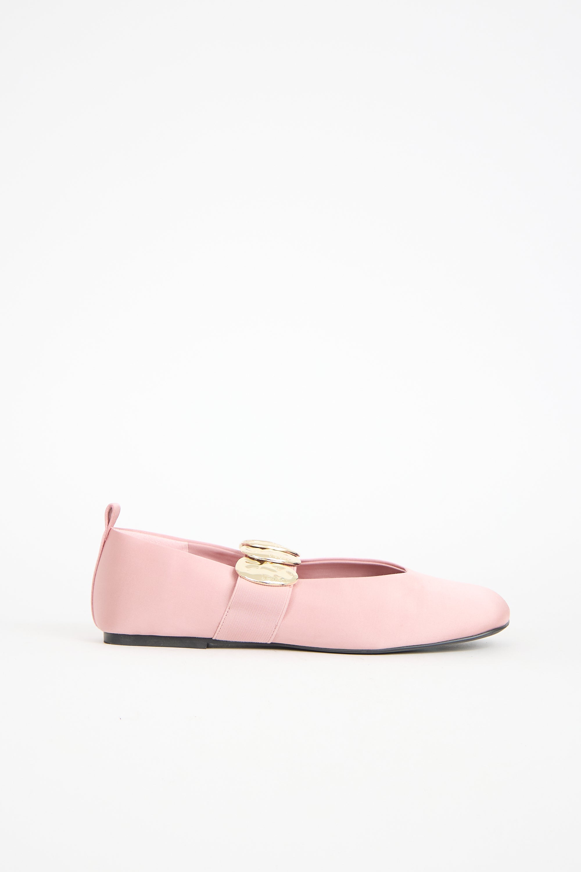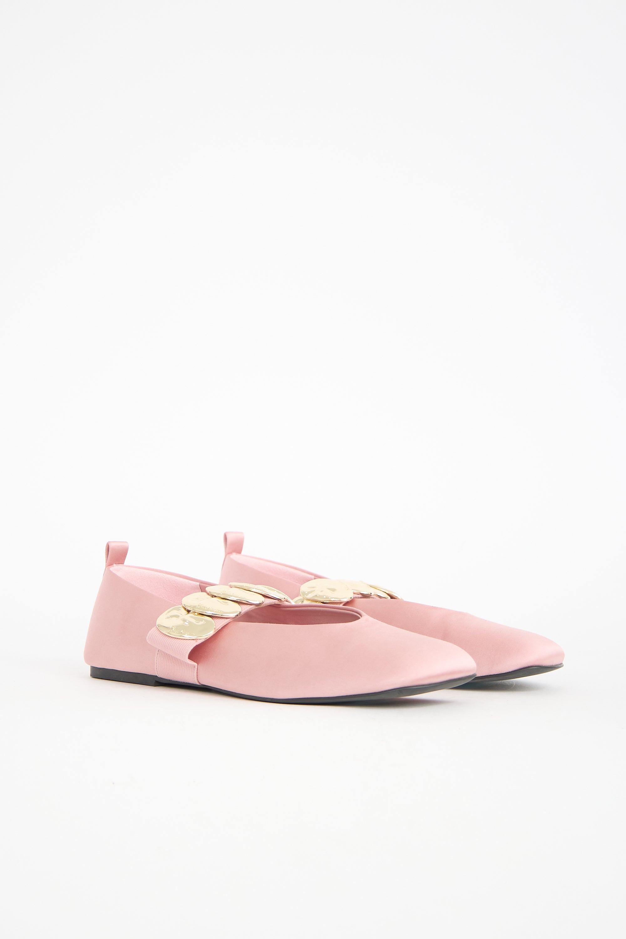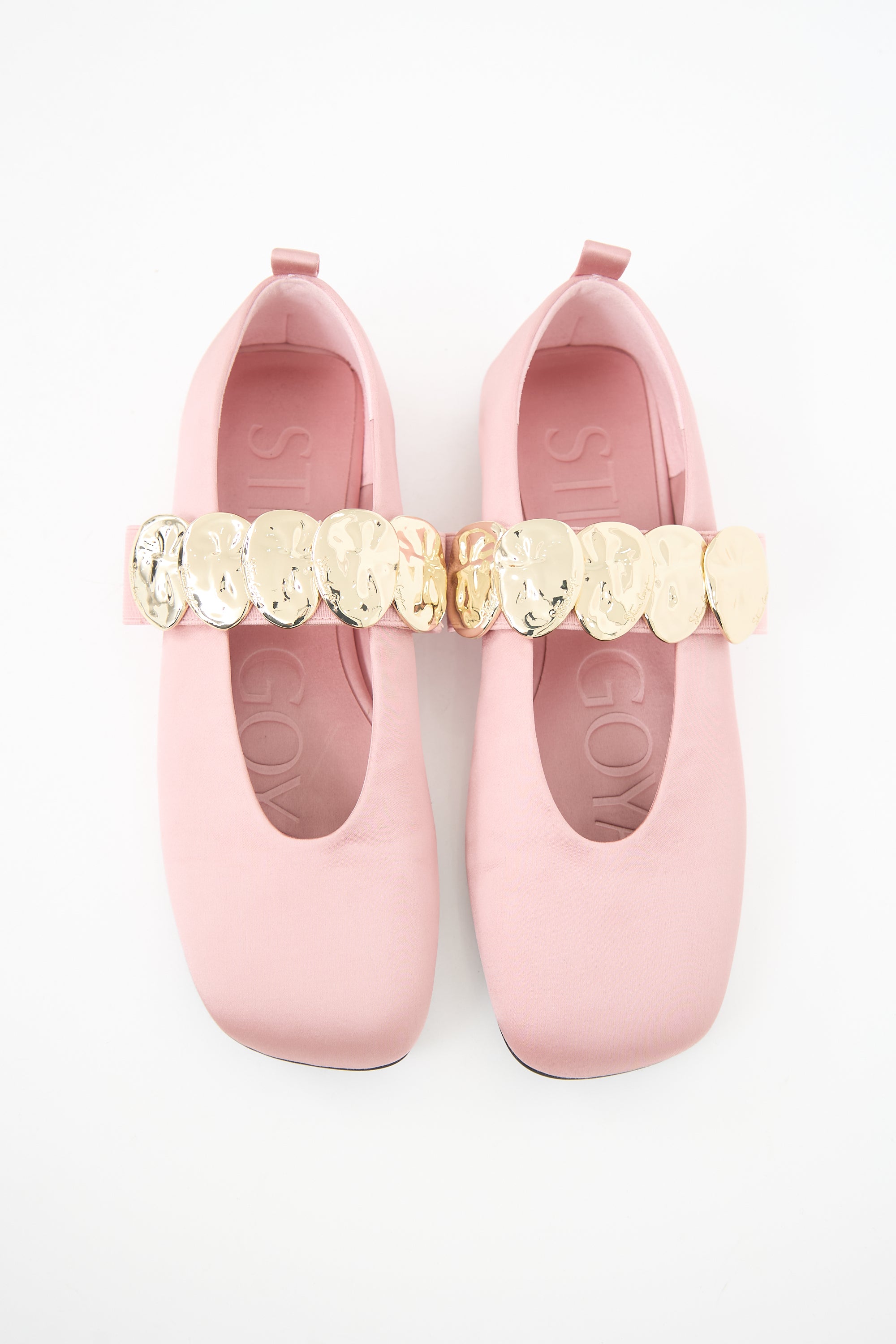 Pre-owned Stine Goya pink satin flats featuring square toe, elastic instep strap with abstract gold tone embellishments, and pull tab at counter.