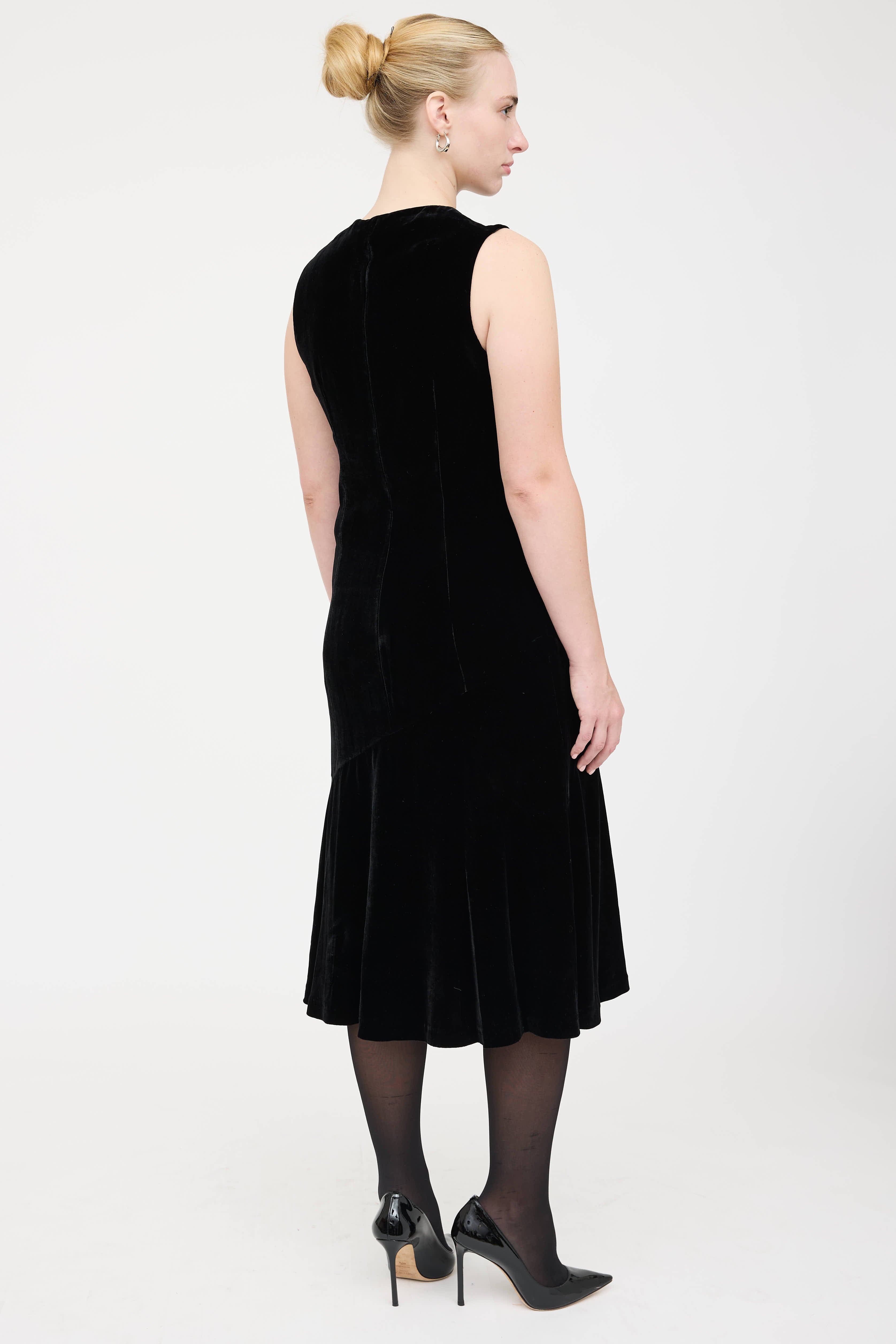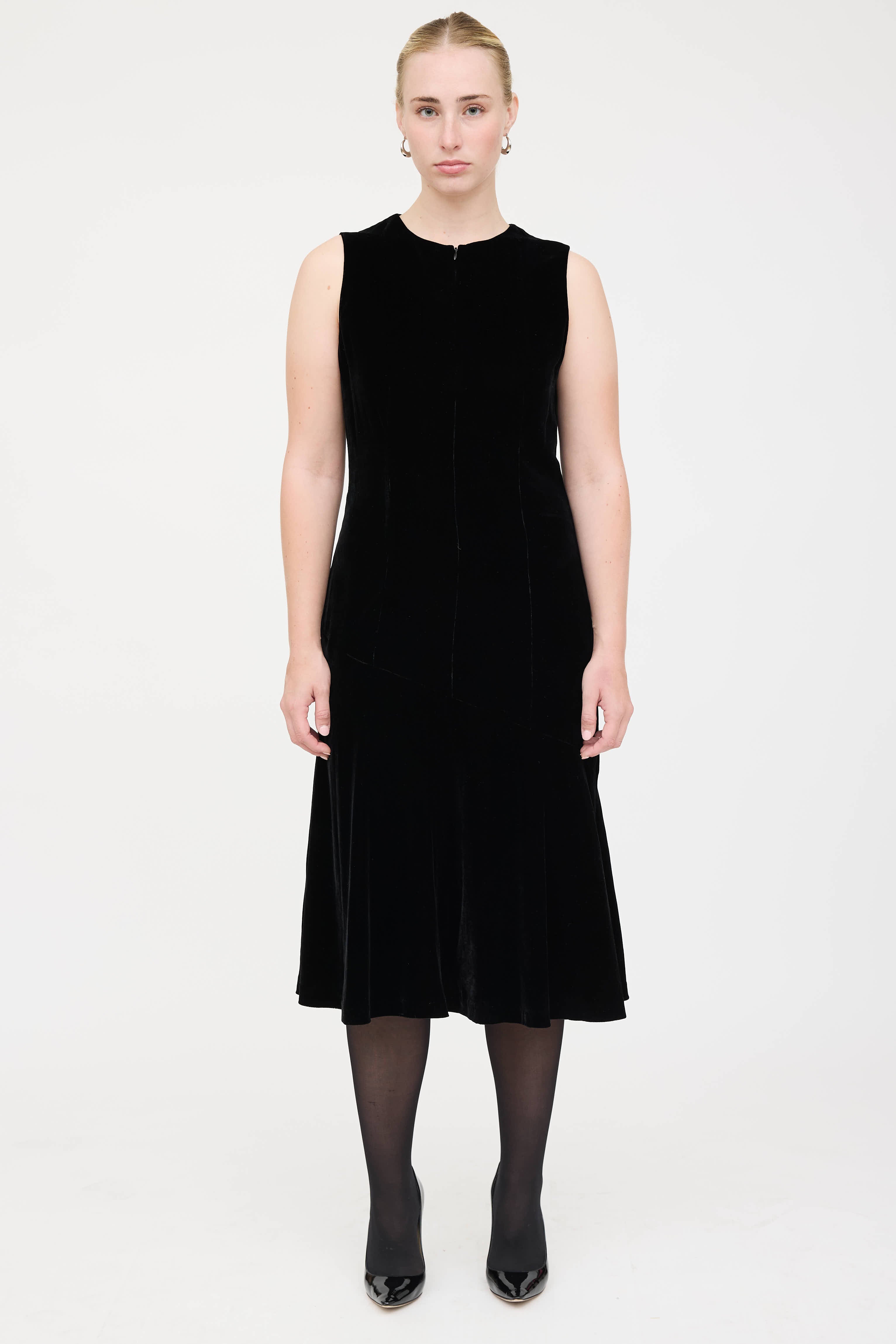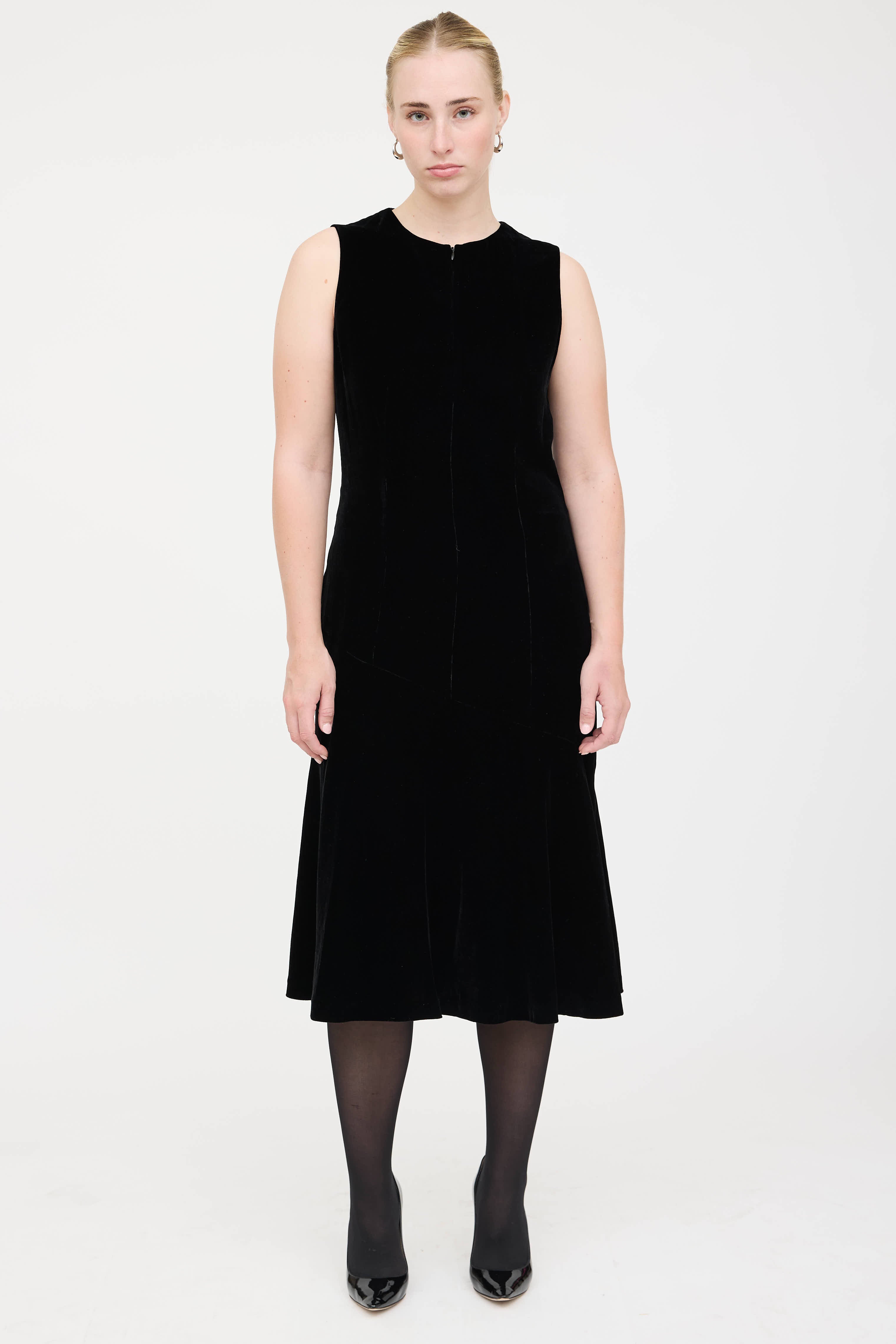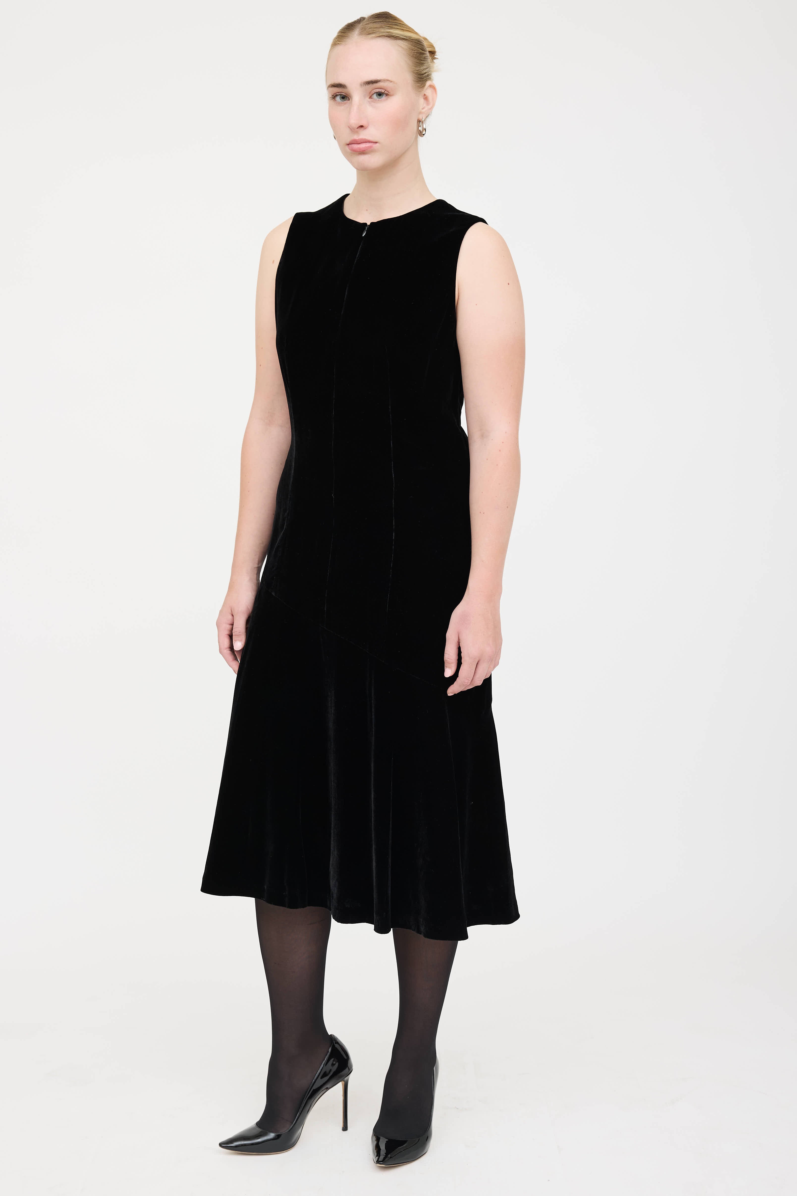 Pre-owned T by Alexander Wang black sleeveless velvet dress featuring round neckline, darted waist, front zip, and concealed zip at side. Lined.