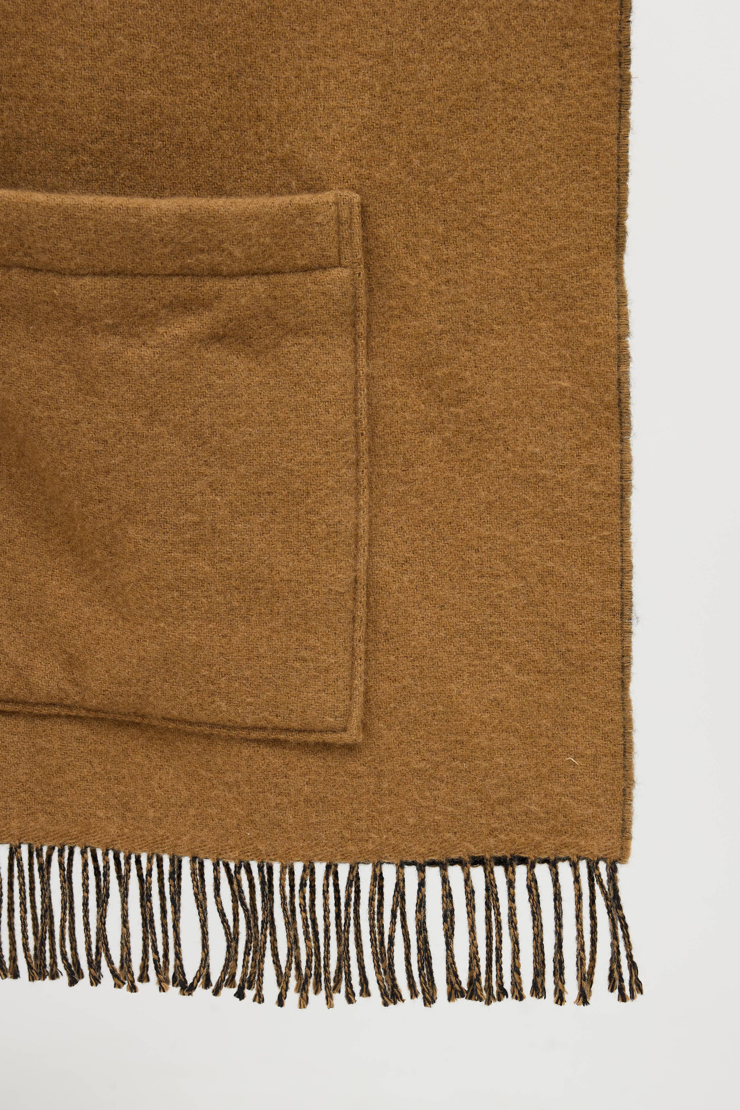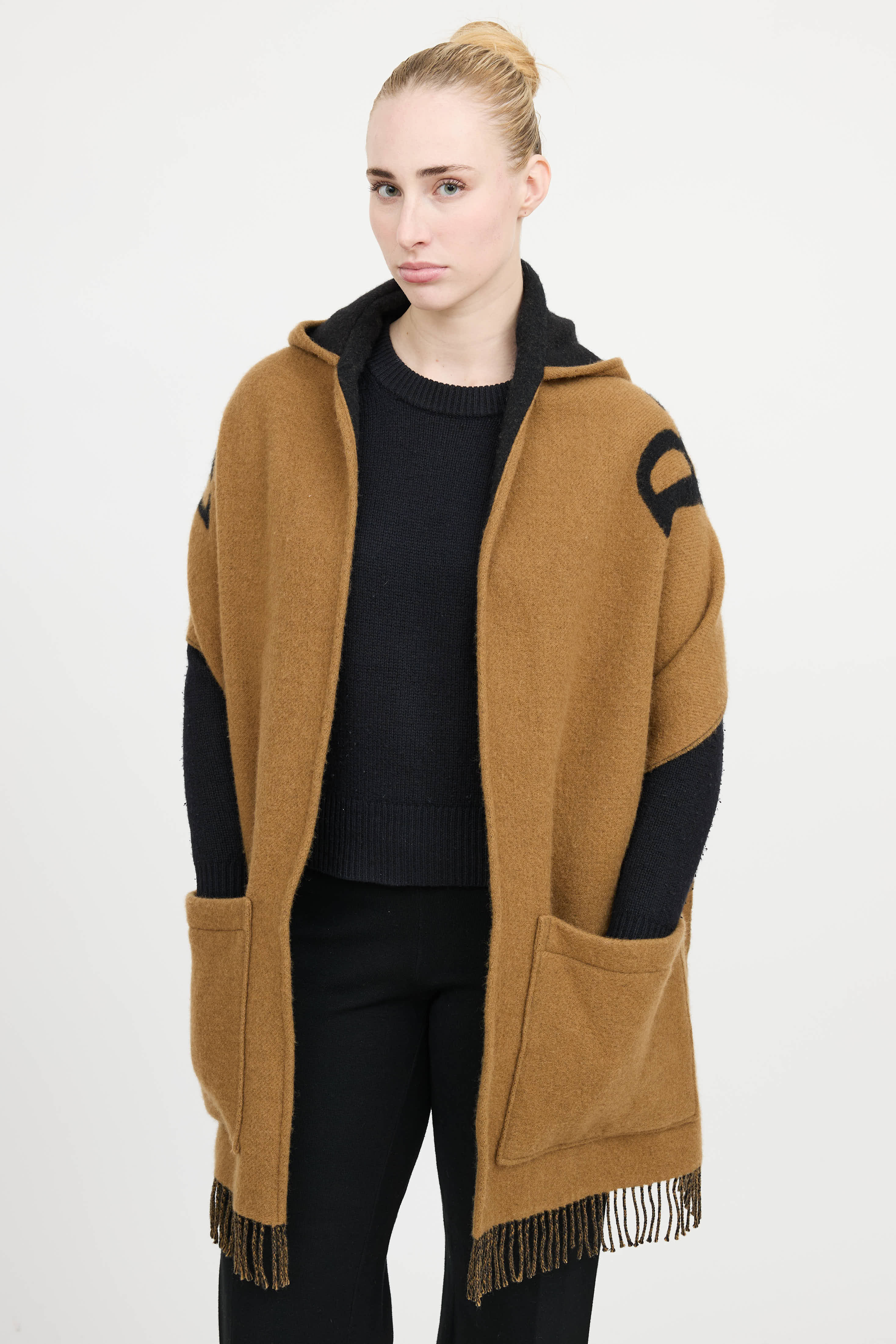 Pre-owned Burberry black and brown wool Archive Logo scarf featuring hood, two slip pockets, and fringe edges.
