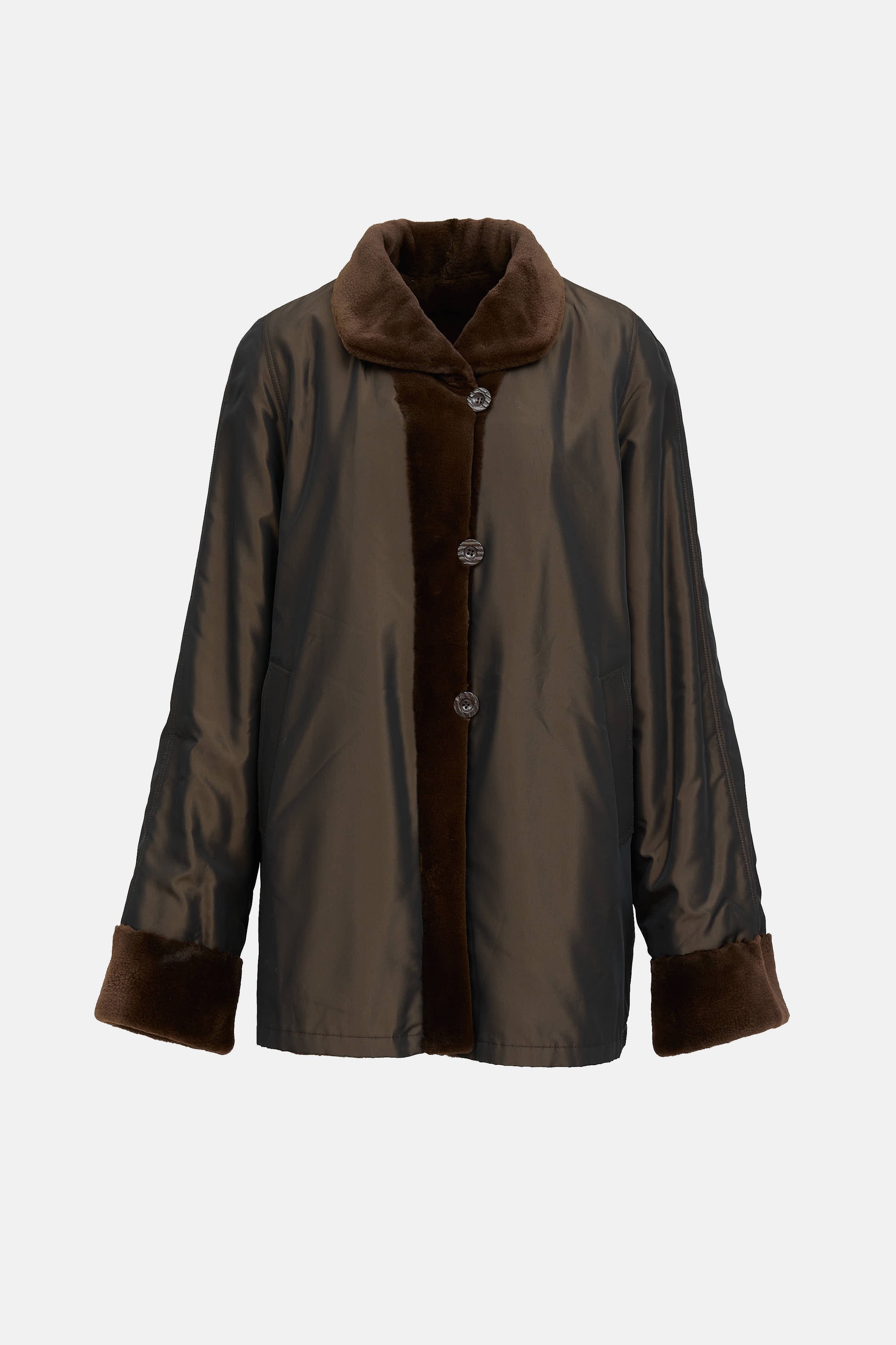 Pre-owned VSP Archive brown mink reversible coat featuring nylon lining, pointed collar, long sleeves, two slip pockets at hip, and button up closure.
