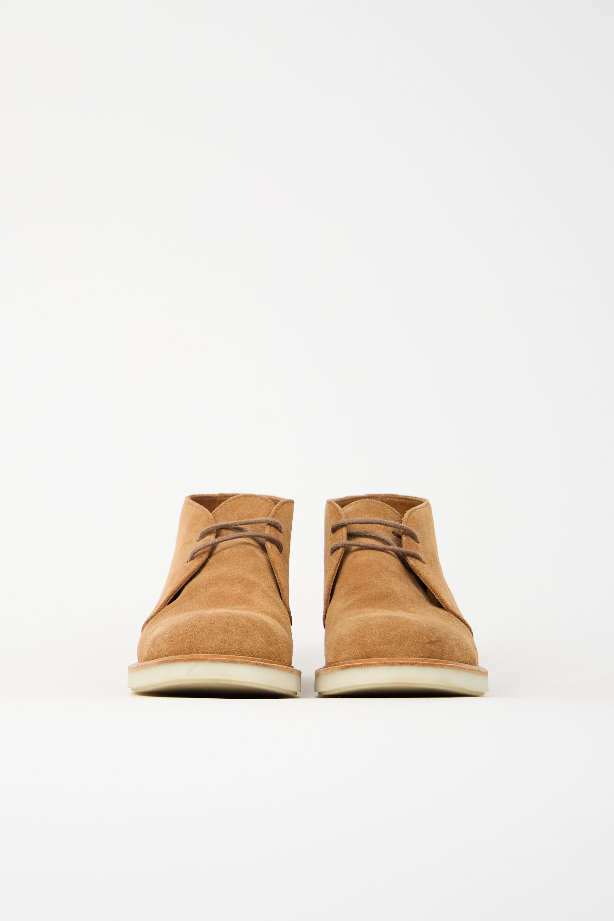 Pre-owned Brunello Cucinelli brown suede Desert boots featuring an almond toe, lace up front, and white crepe rubber sole.