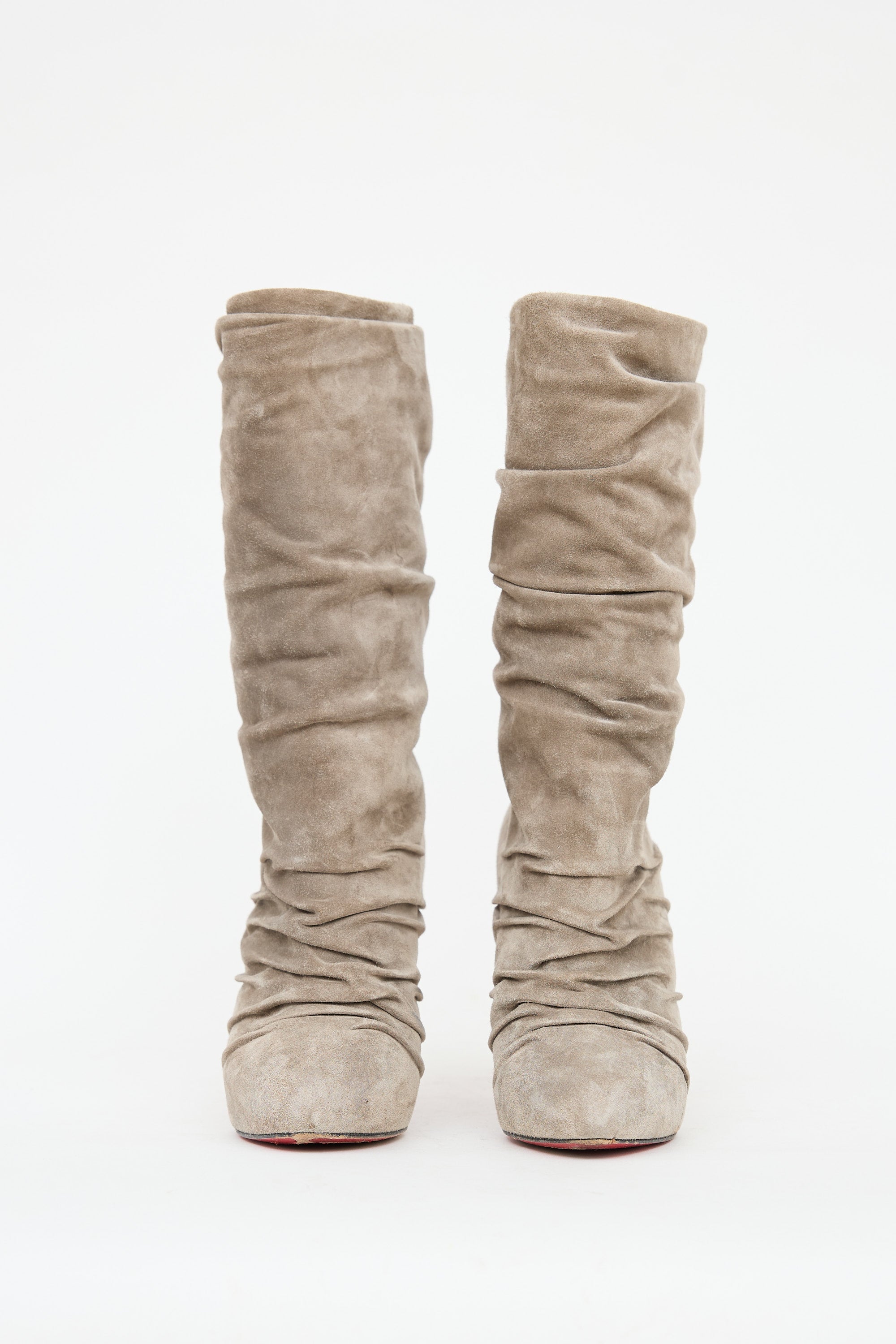 Pre-owned Christian Louboutin grey suede slouch boots featuring an almond toe, grey suede upper, intentional slouching, mid calf shaft, slip on entry and signature red laquard outsole.