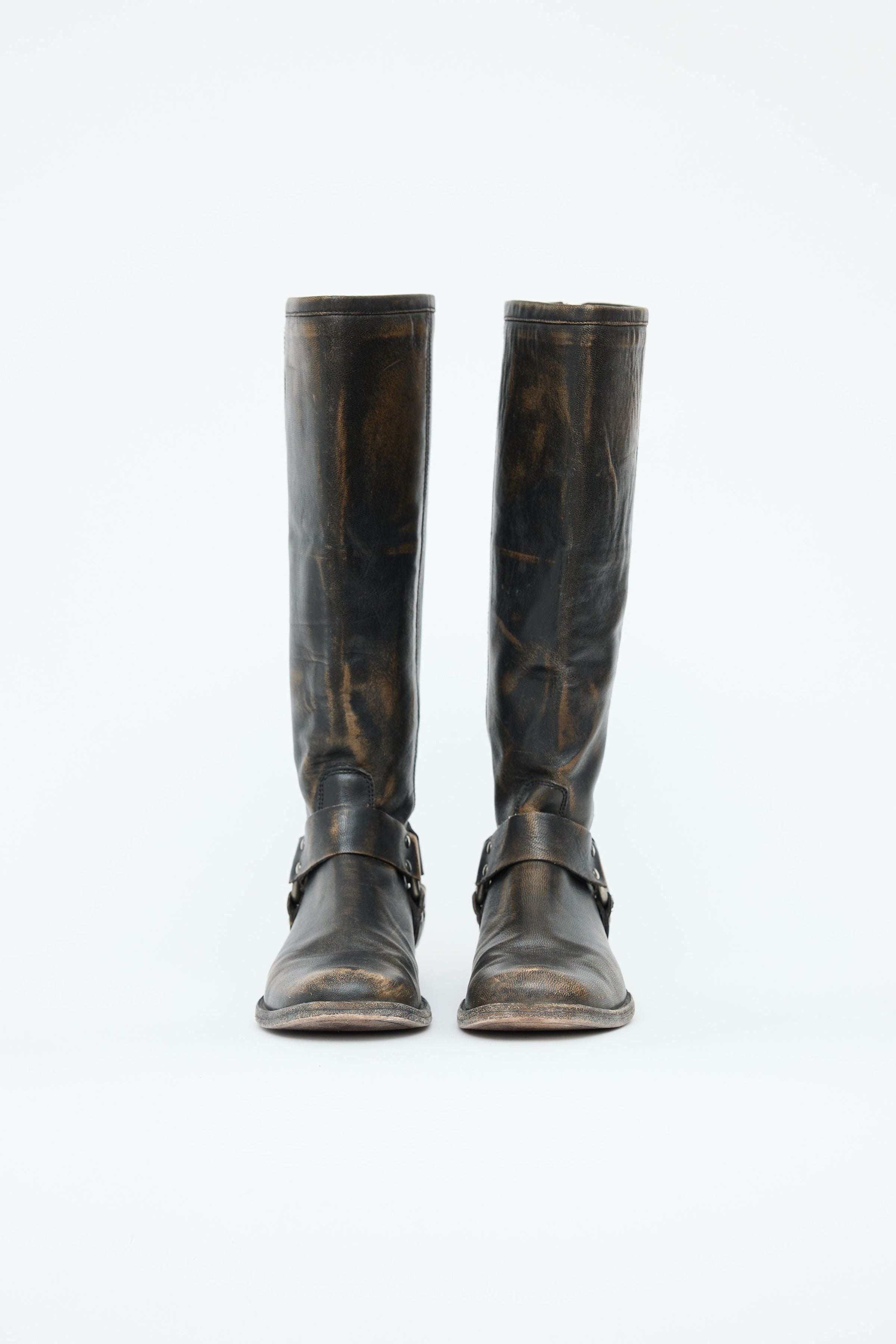 Pre-owned Frye brown Harness boots featuring rounded toe, harness strap on upper with silver tone hardware, zip closure at back, and stacked heel.