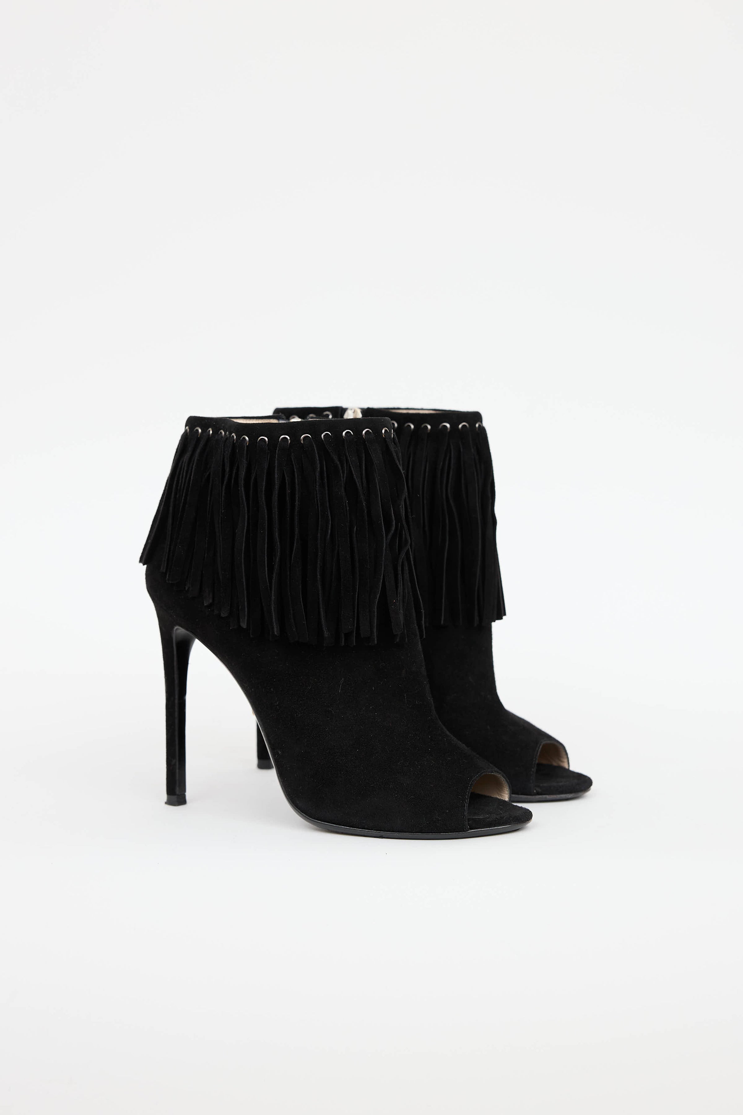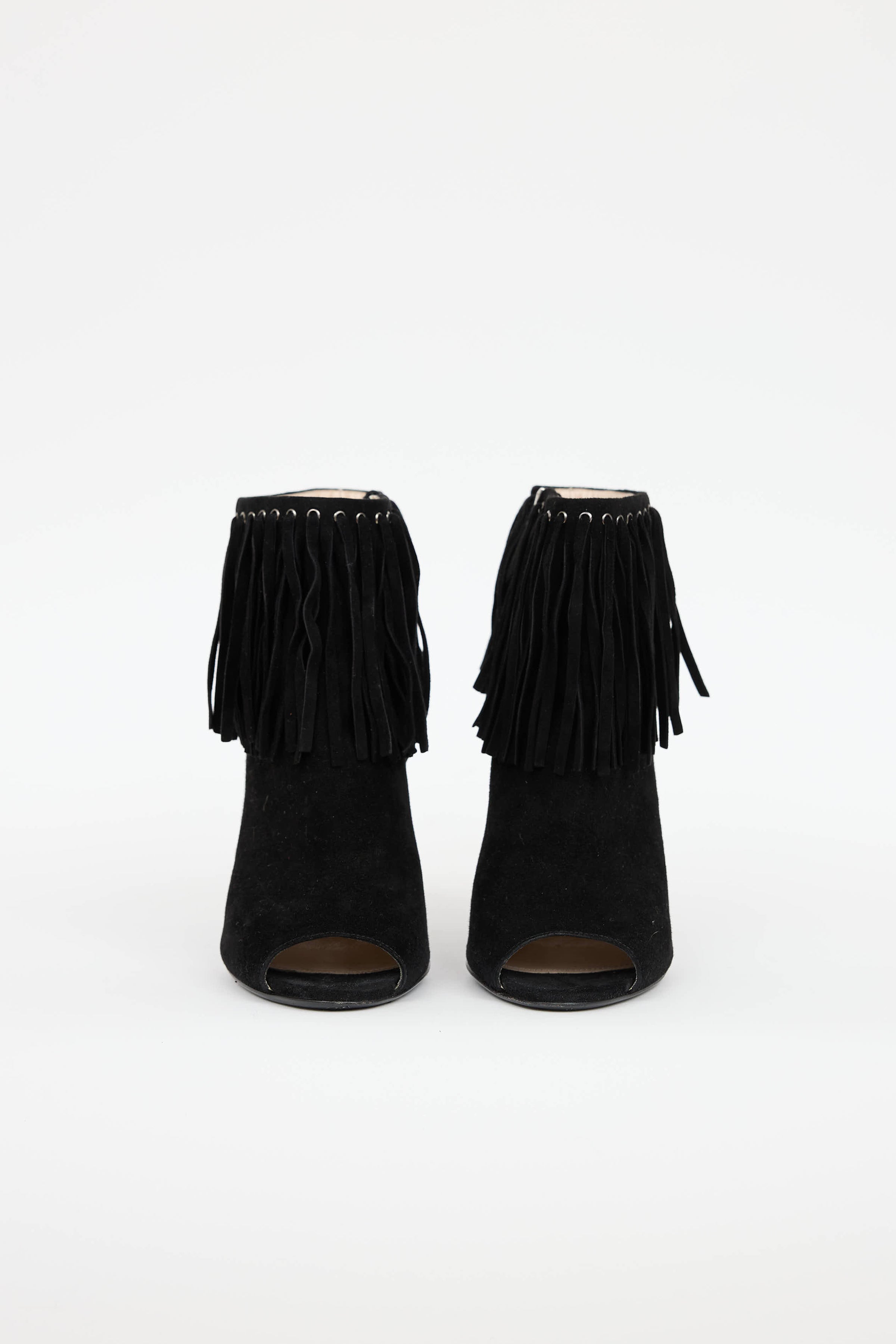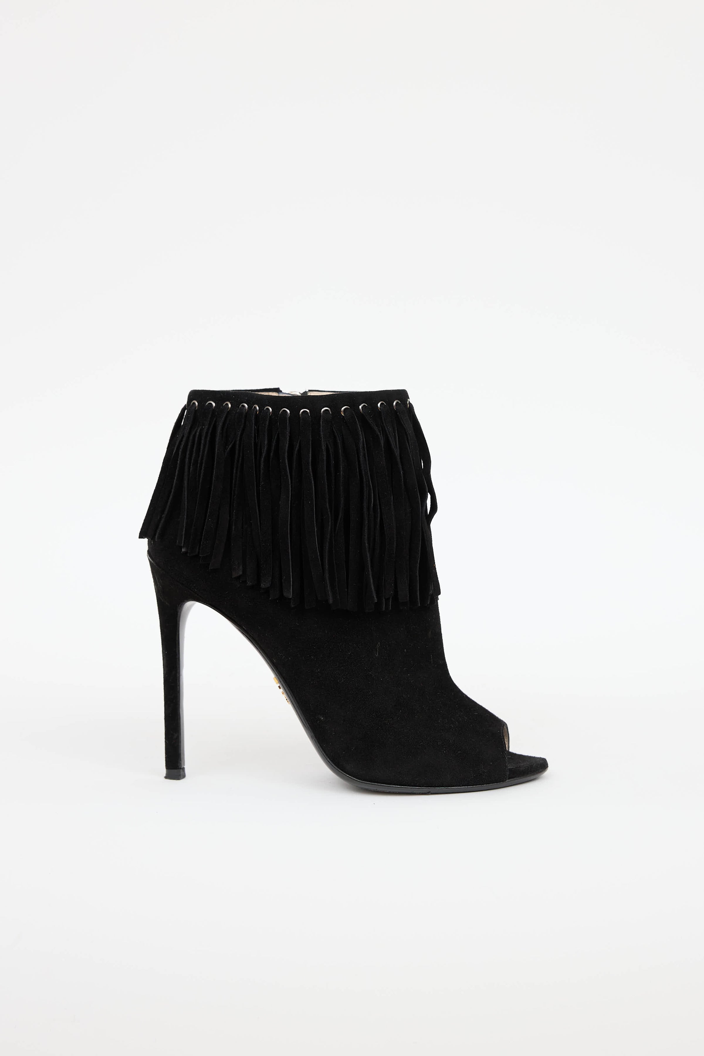 Pre-owned Prada black suede bootie featuring almond peep toe, fringe detail at ankle, silver tone zip at side, and covered heel.