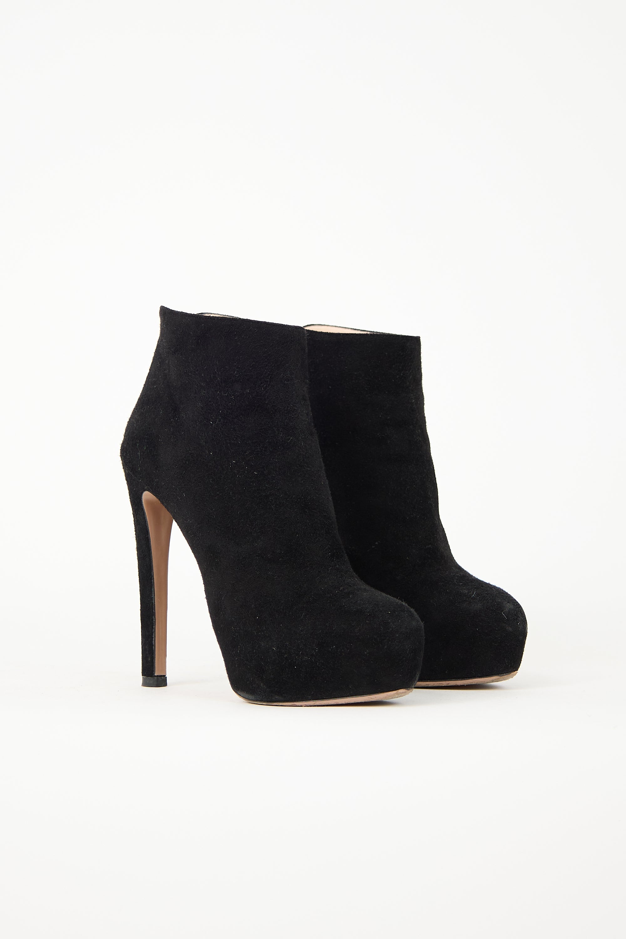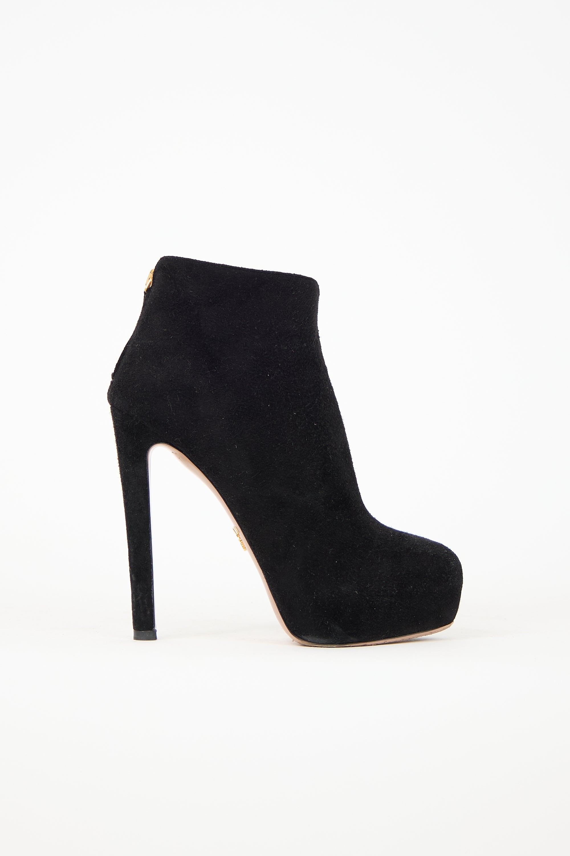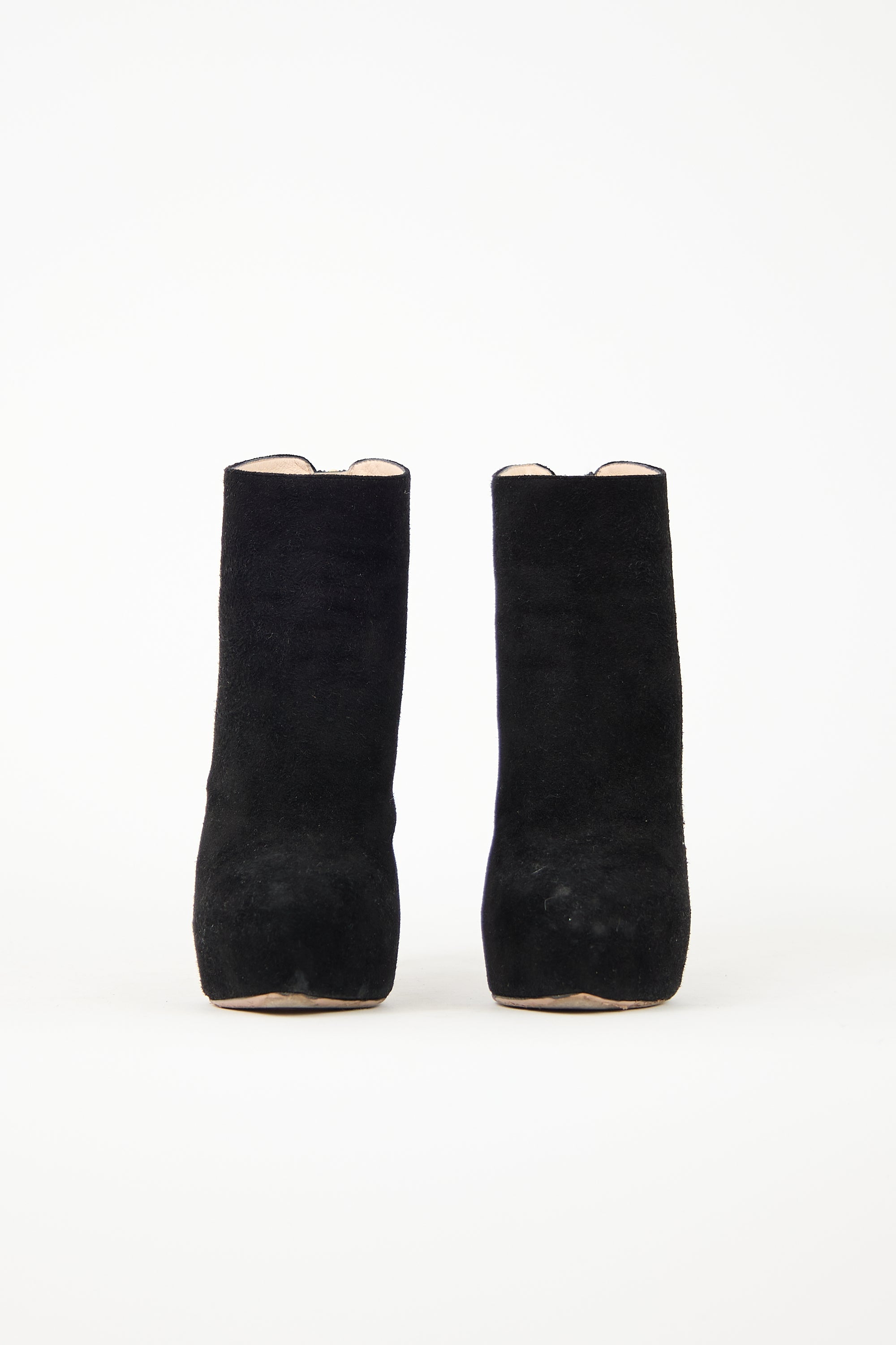 Pre-owned Prada black suede boots featuring almond toe, back zip closure, concealed platform, and covered stiletto heel. Comes with original dust bag.