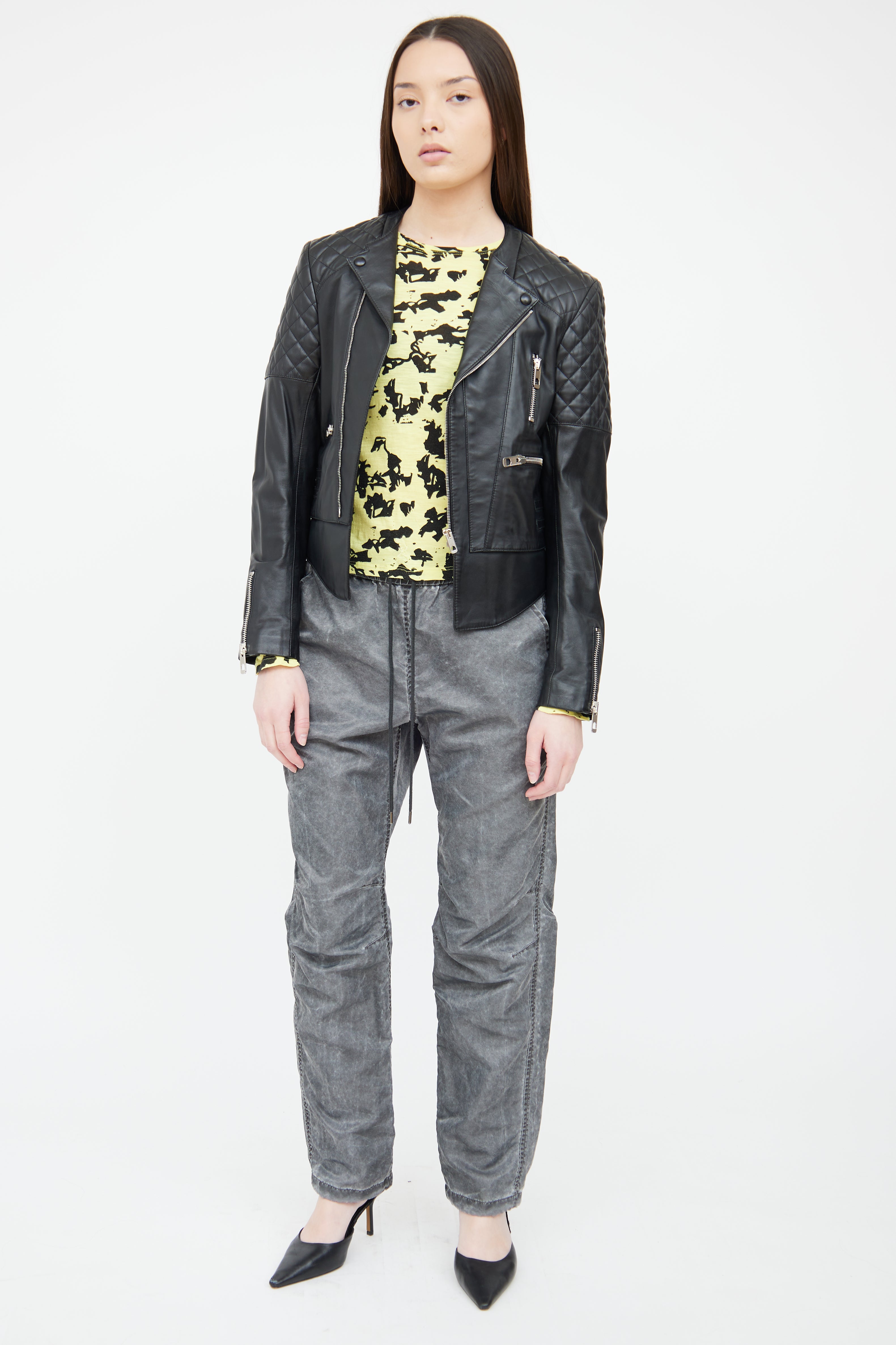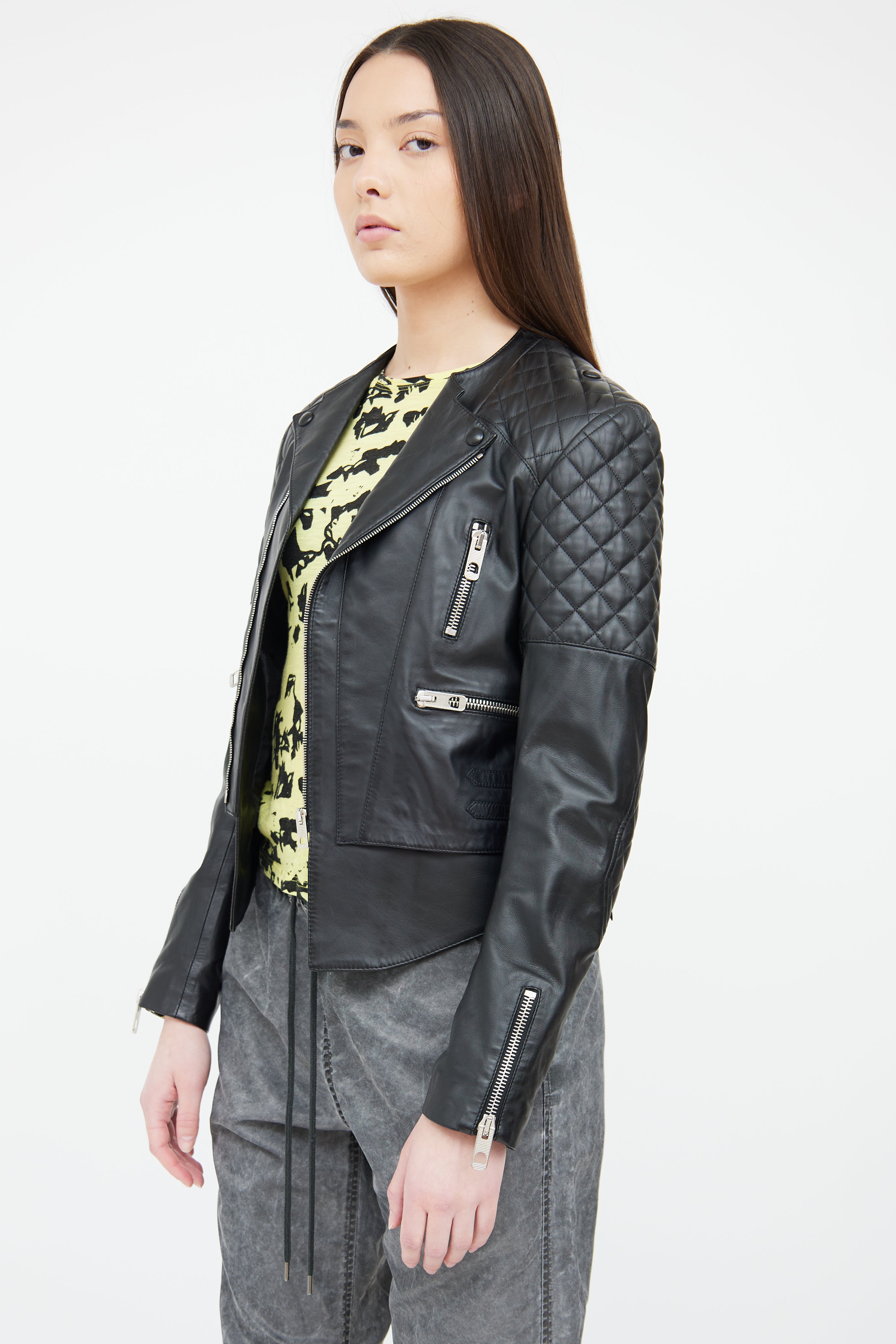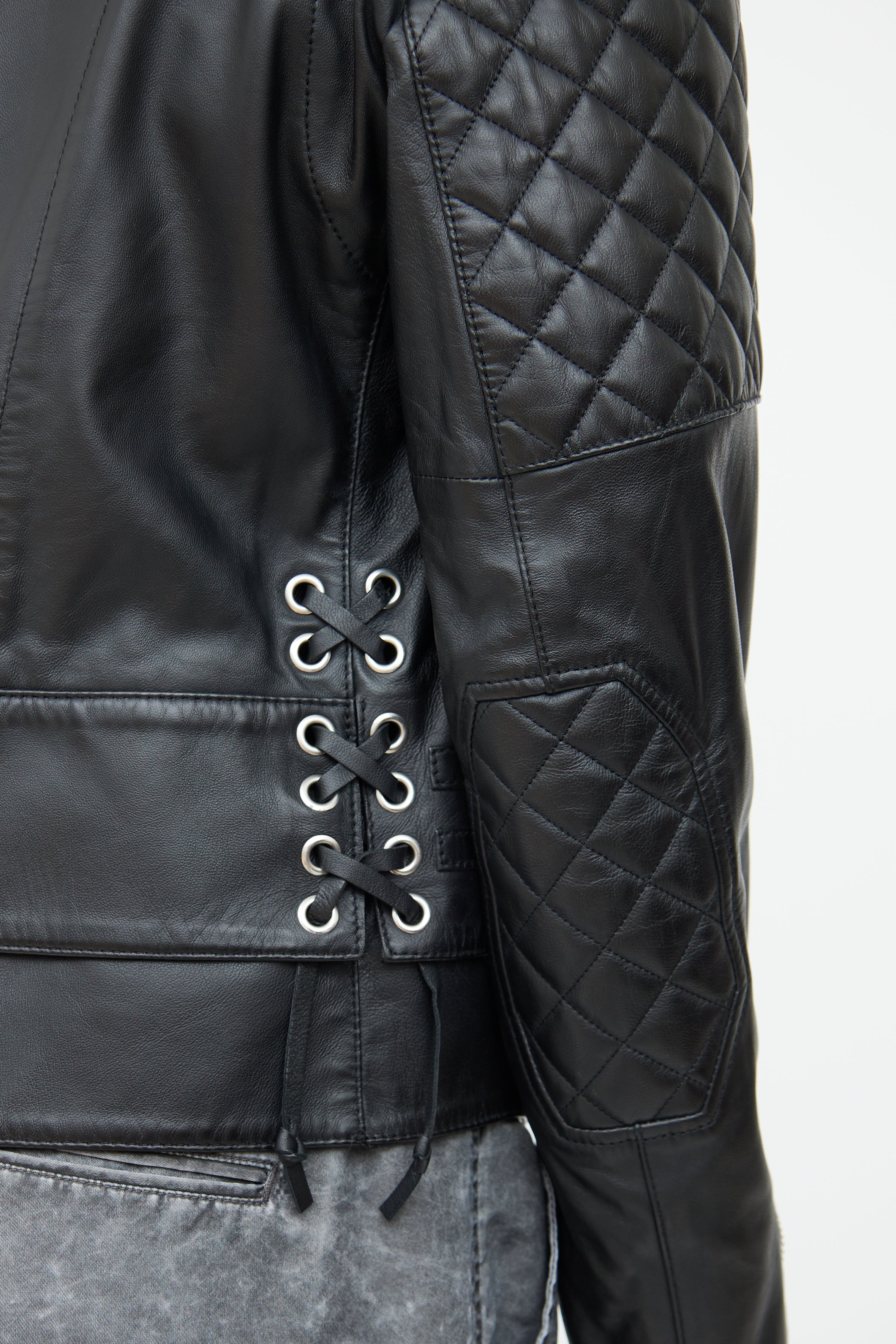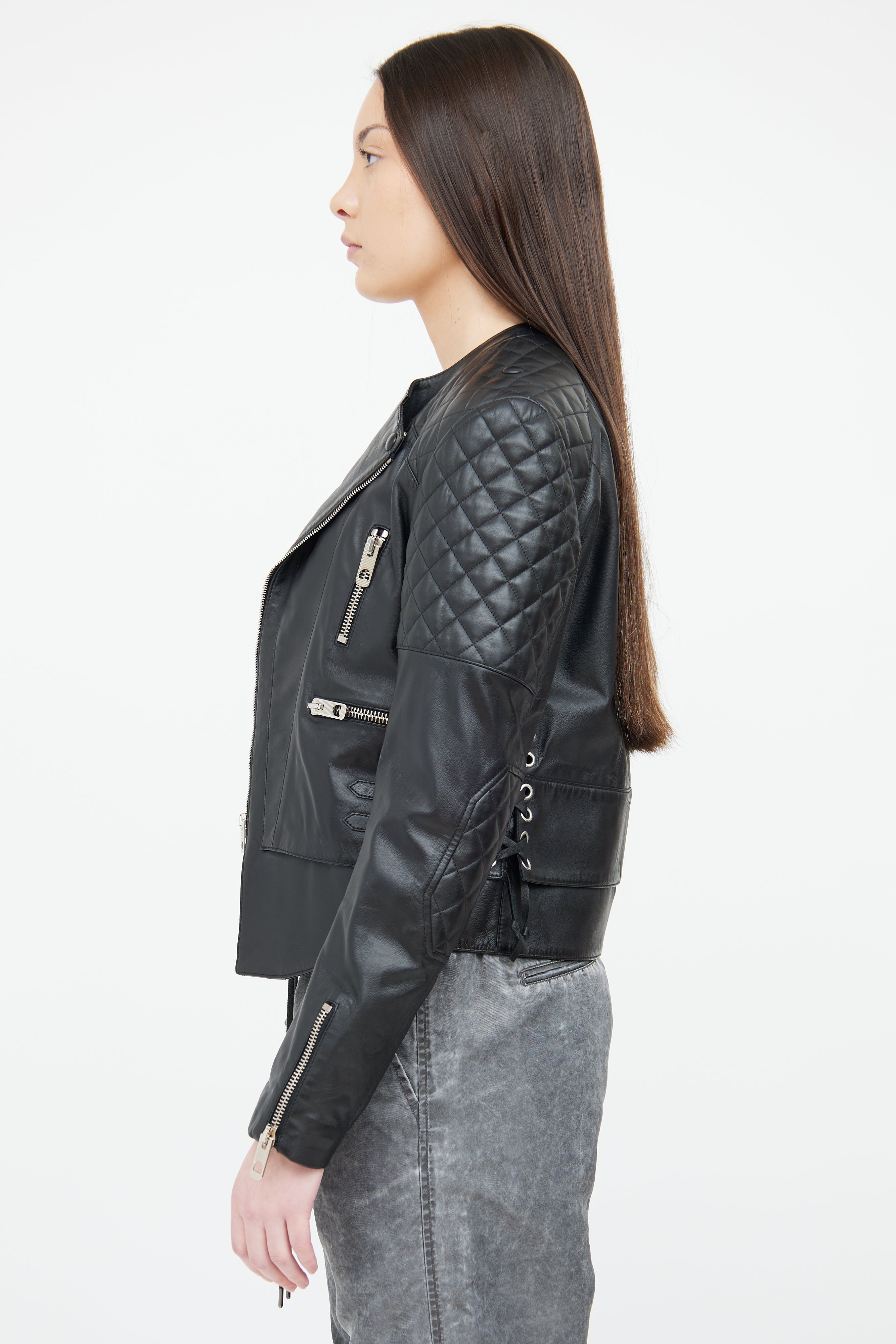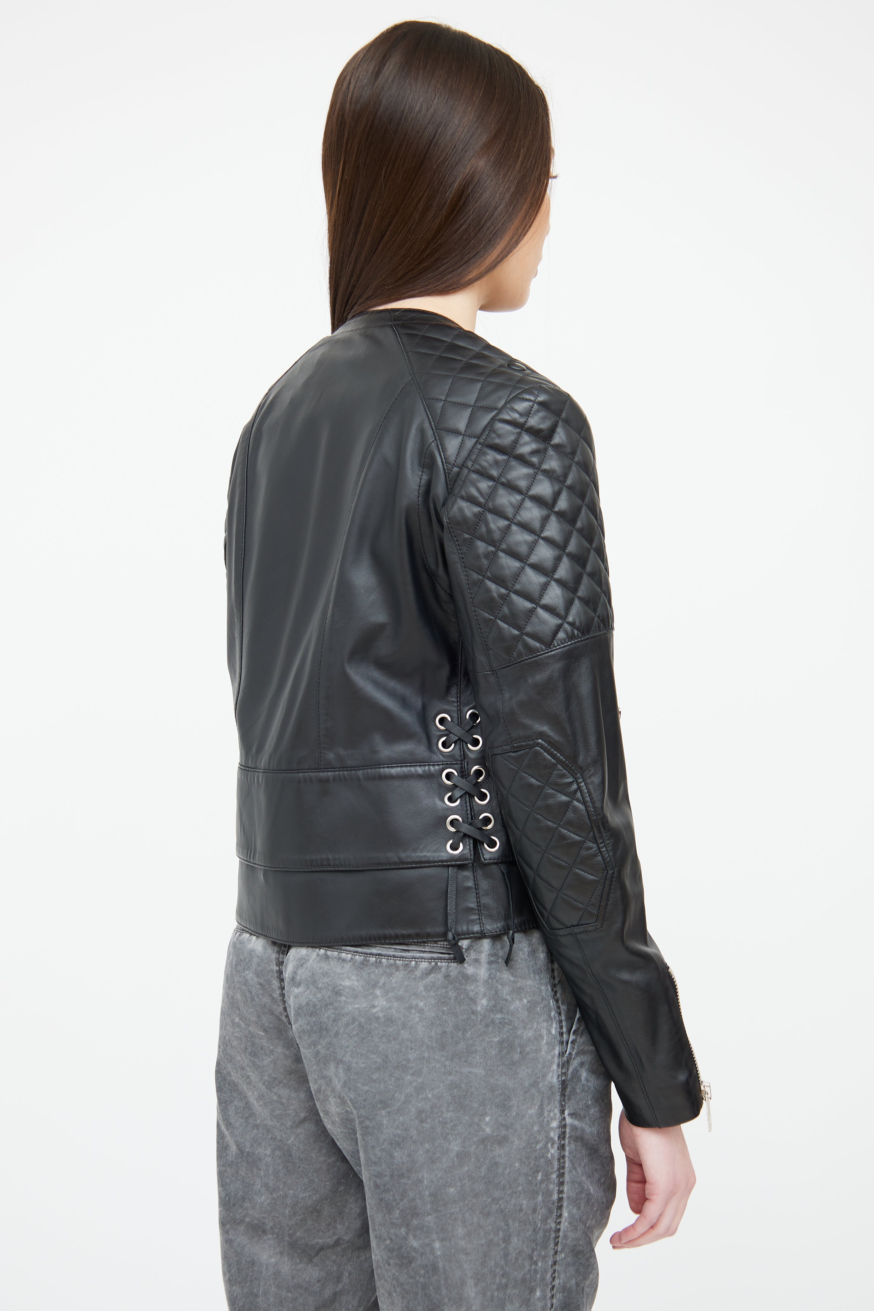 Pre-owned Balenciaga black leather moto jacket featuring asymmetric front zip closure, round neckline, quilted shoulder and elbow detailing, silver tone hardware, three front zip pockets, zip detailing at sleeves, lace up detailing at sides, and slight hi-low hemline. Fully lined.