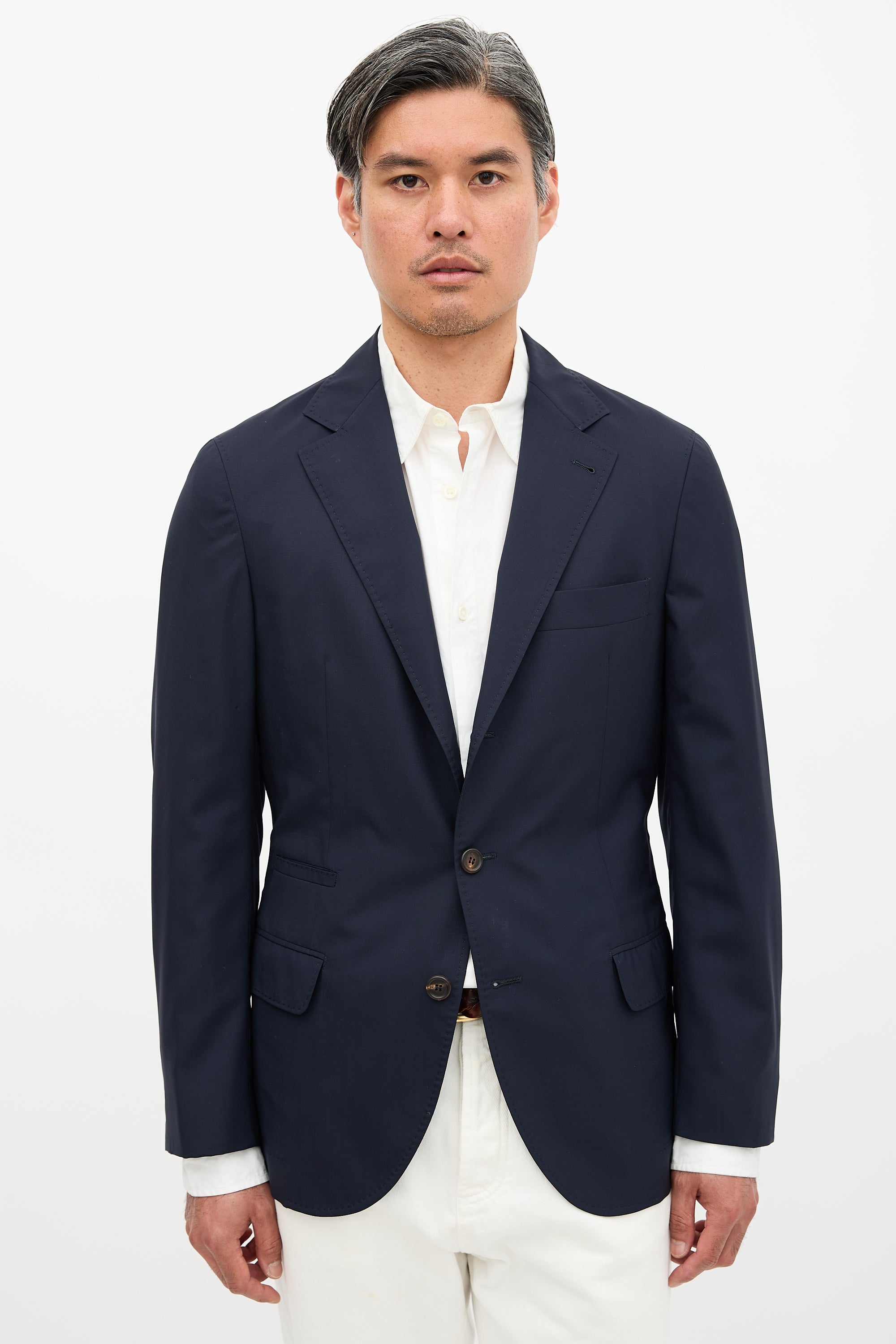 Pre-owned Brunello Cucinelli navy wool and silk blend blazer featuring notched lapel, button front, three front pockets, two double welt pockets and change slot at interior, back double vent, and buttoned cuffs. Partially lined.