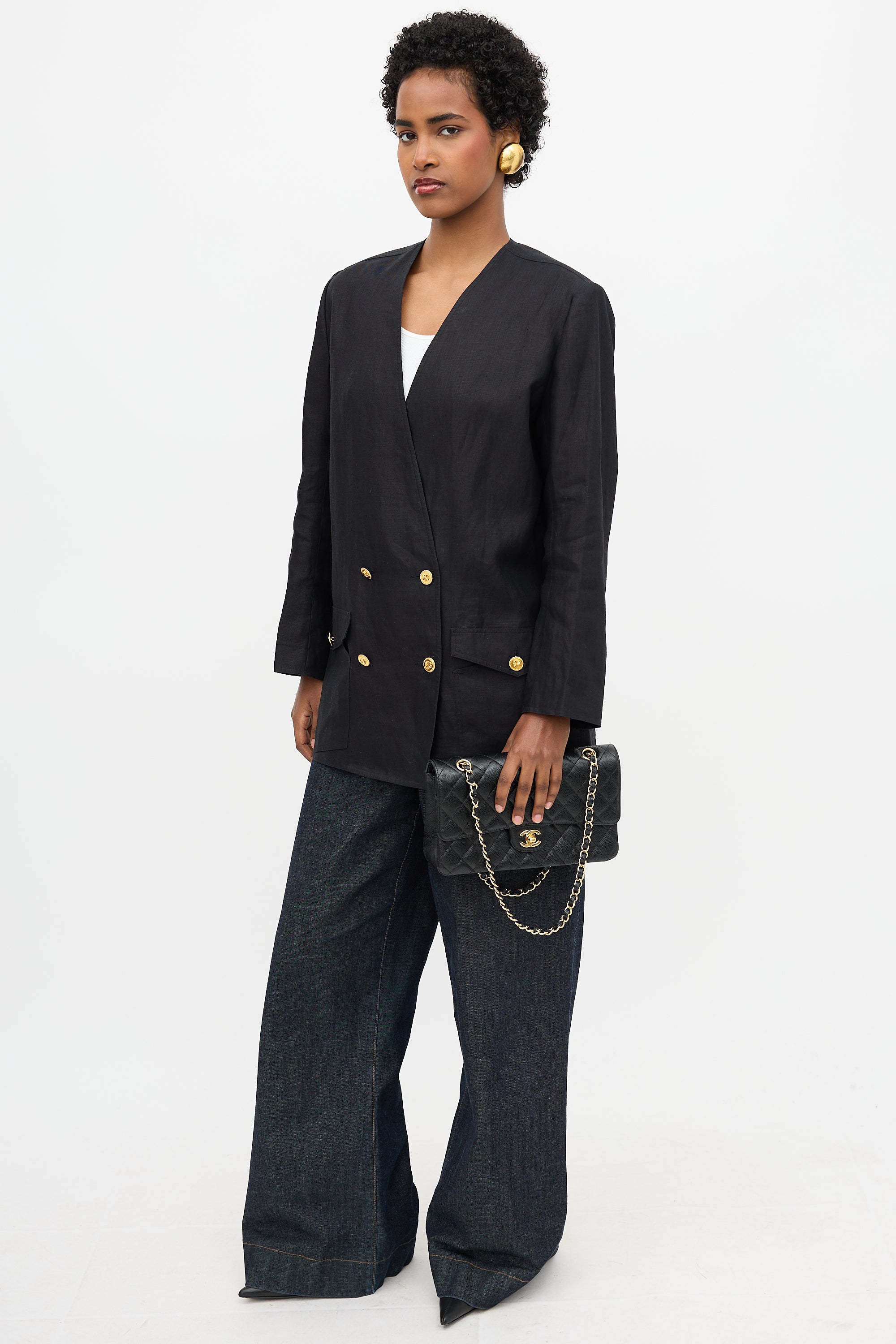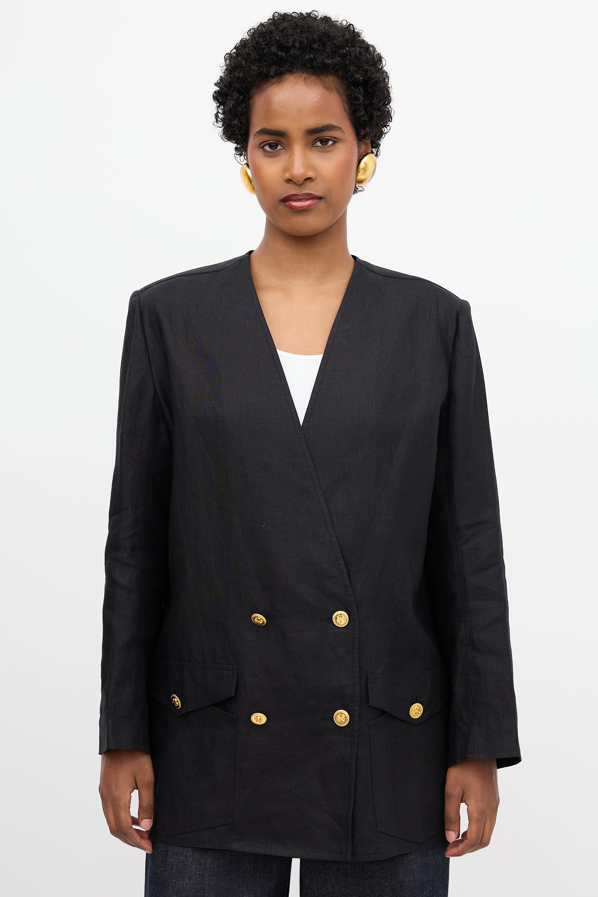 Pre-owned Chanel black linen blazer featuring surplice neckline, gold tone buttons with four leaf clover motif, double breasted button front, two front flap pockets, and buttoned cuffs.
