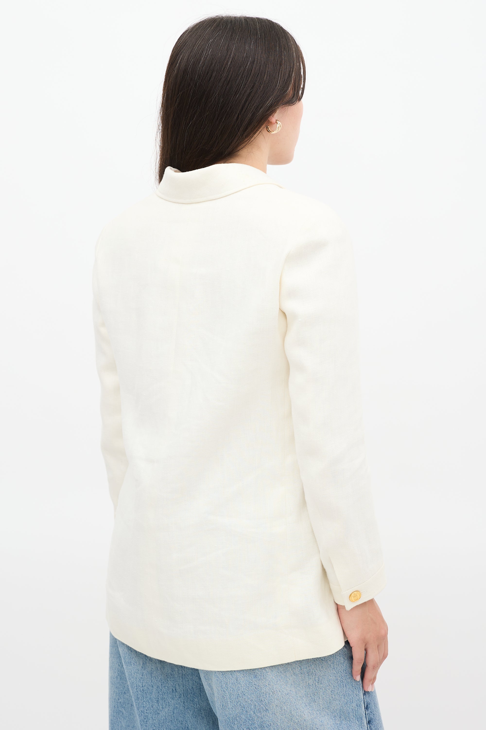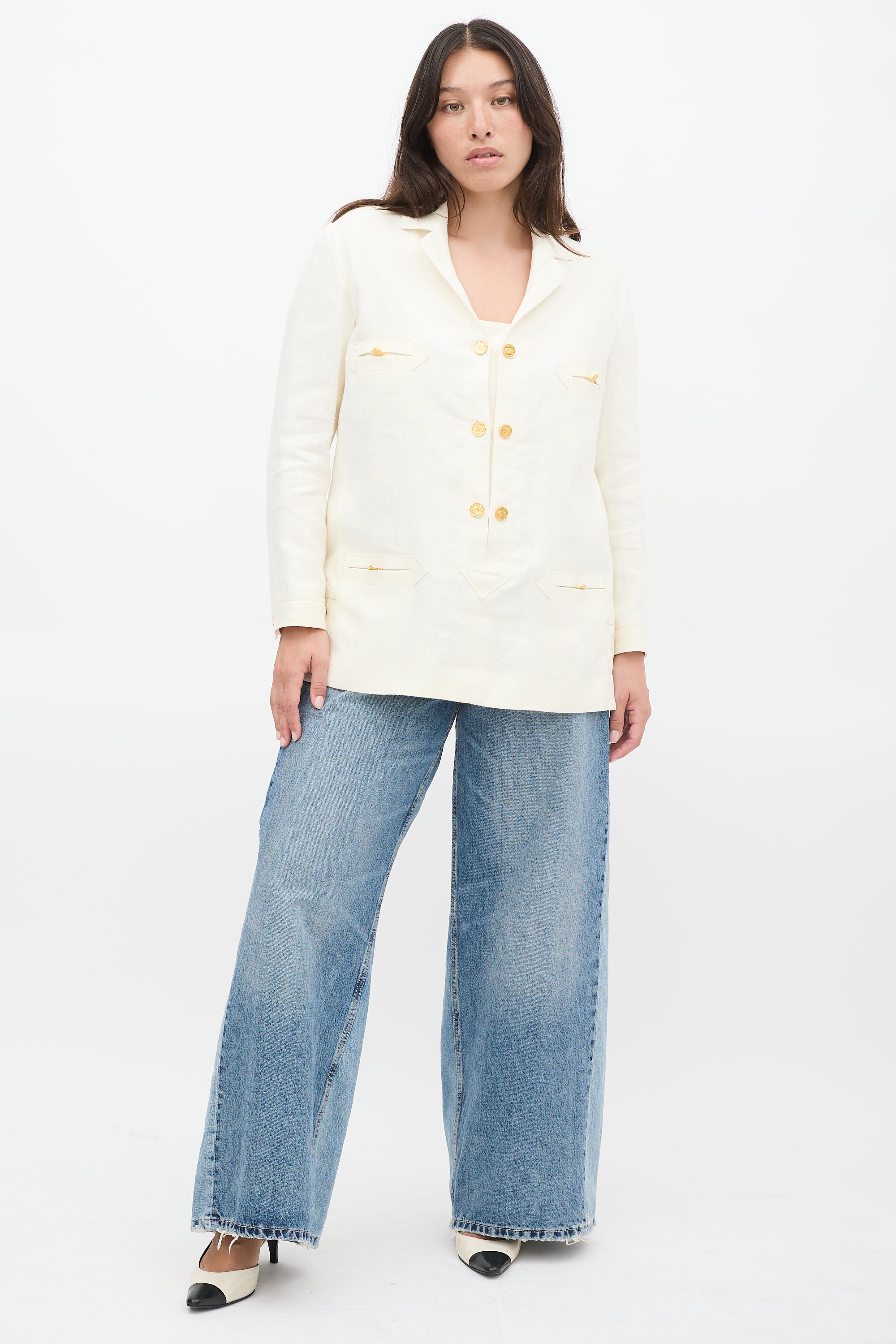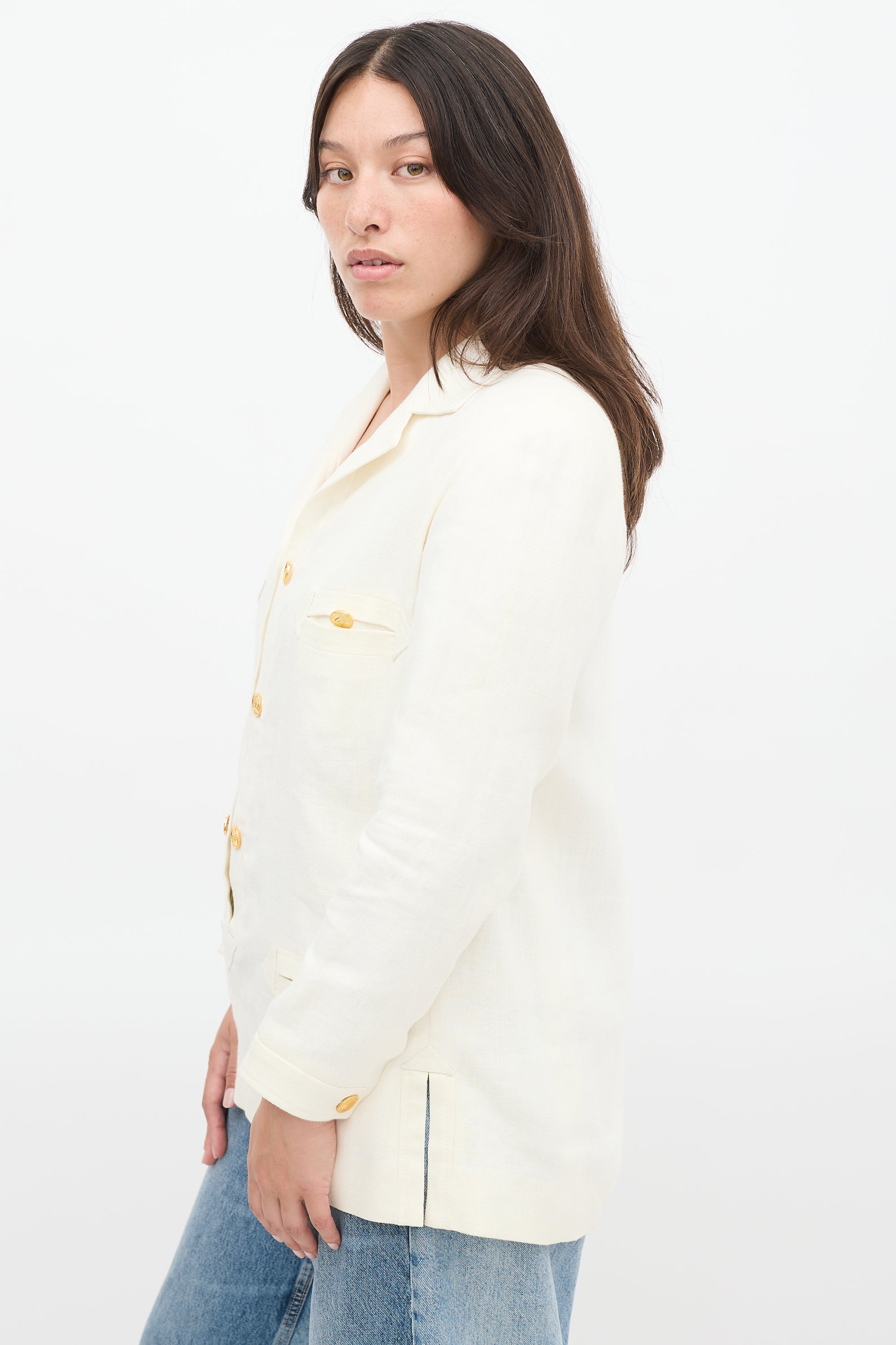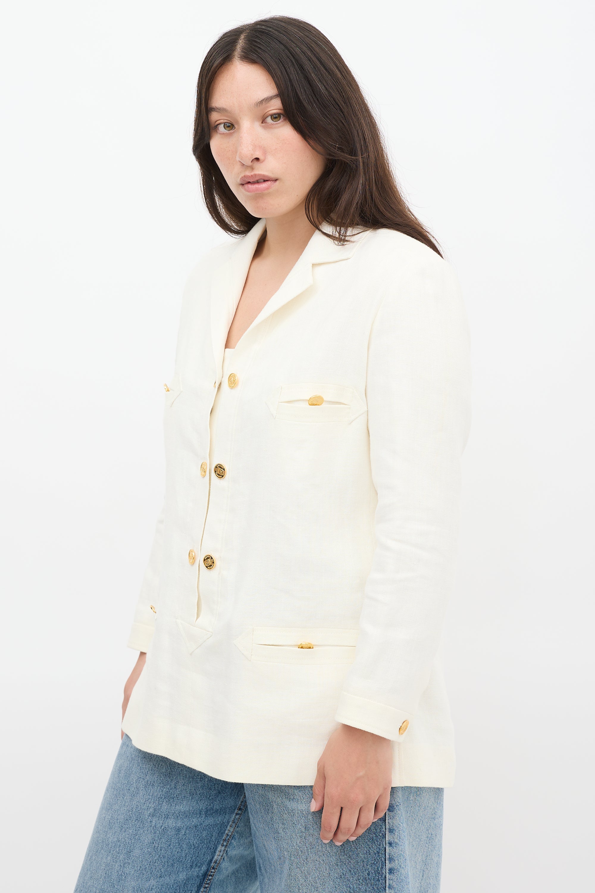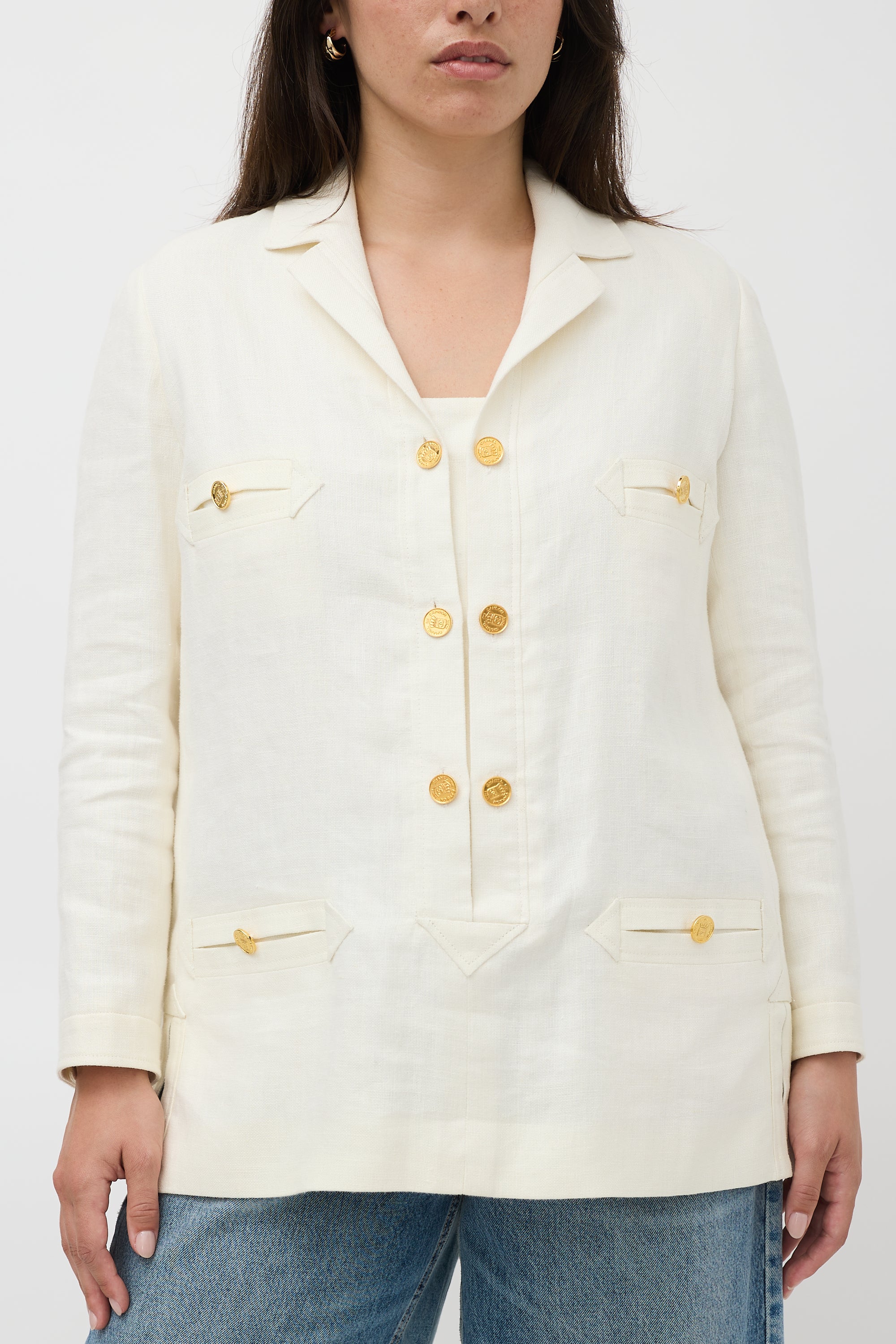 Pre-owned Chanel white linen tunic blazer featuring a convertible collar, decorative gold tone coin motif buttons, partial button up front, four front wide double welt pockets, side slits, padded shoulders, and long sleeves with buttoned cuffs.
