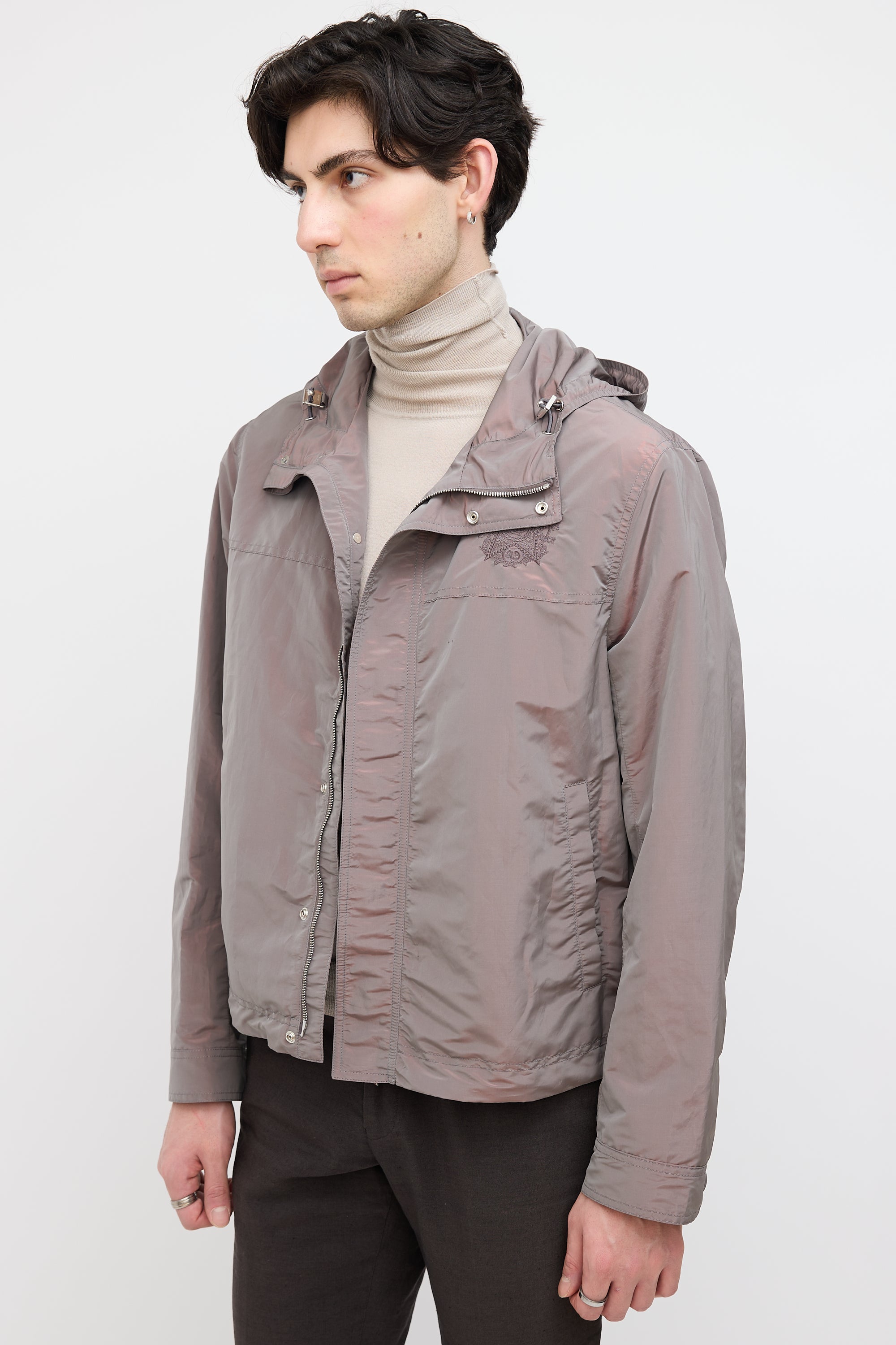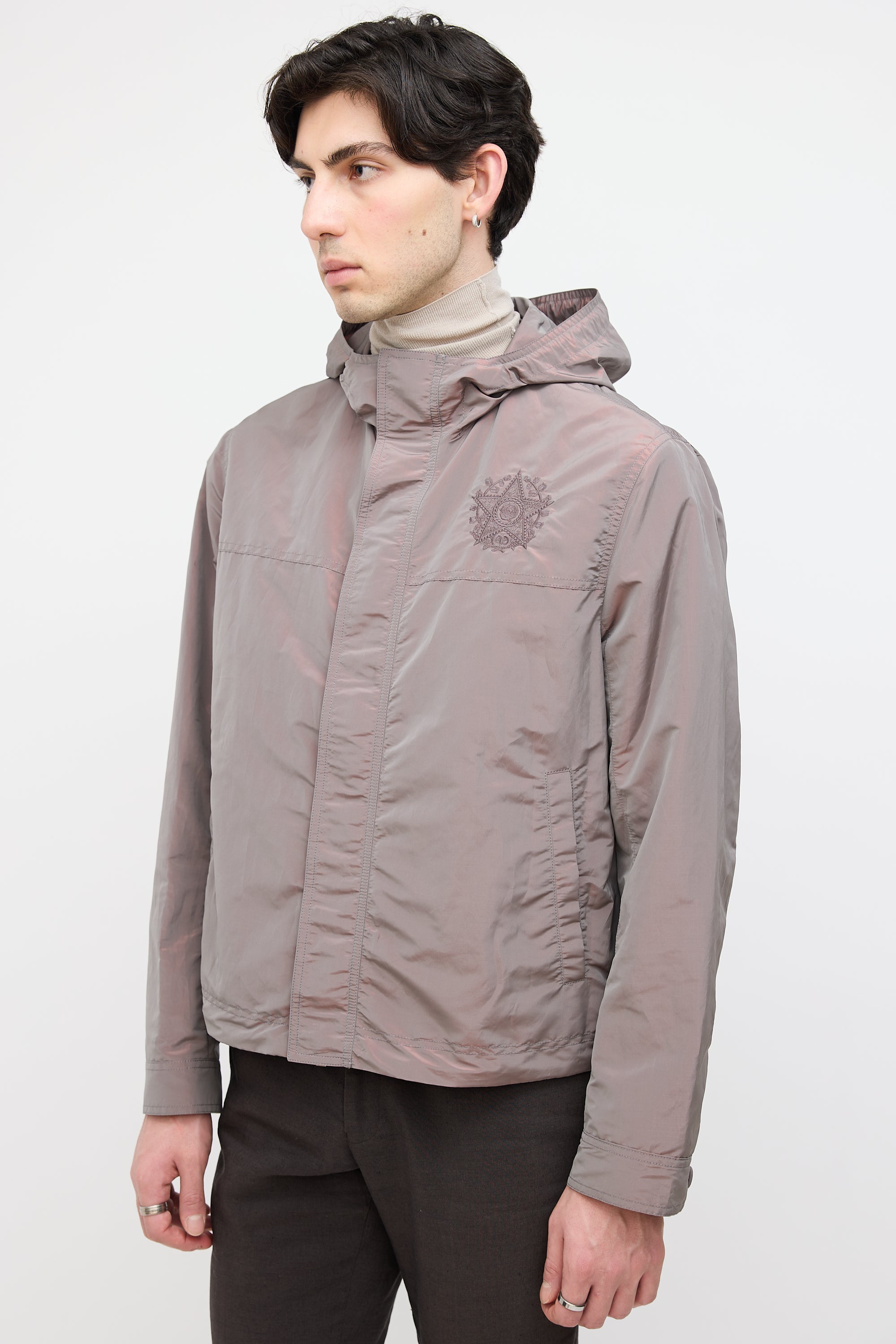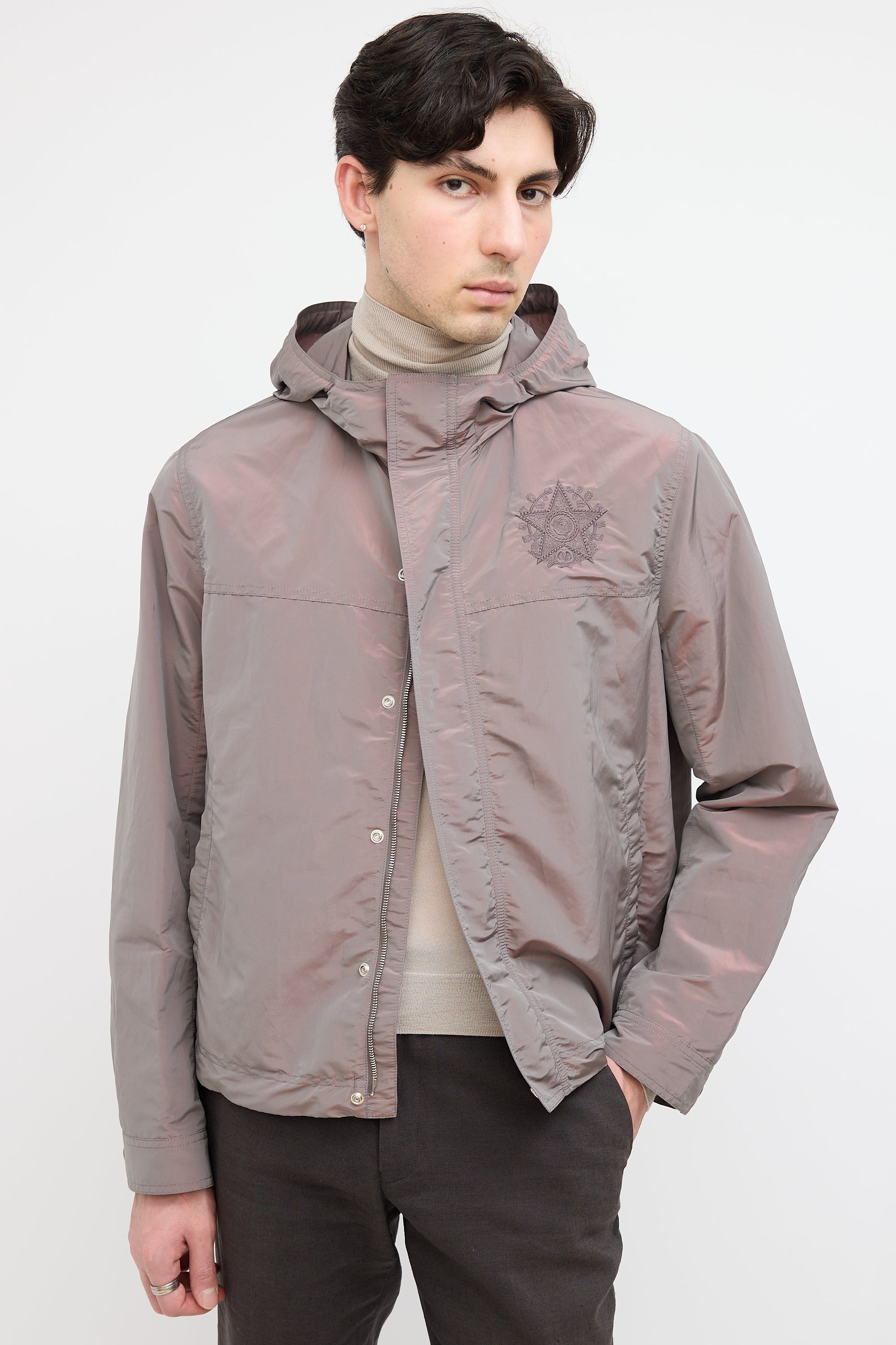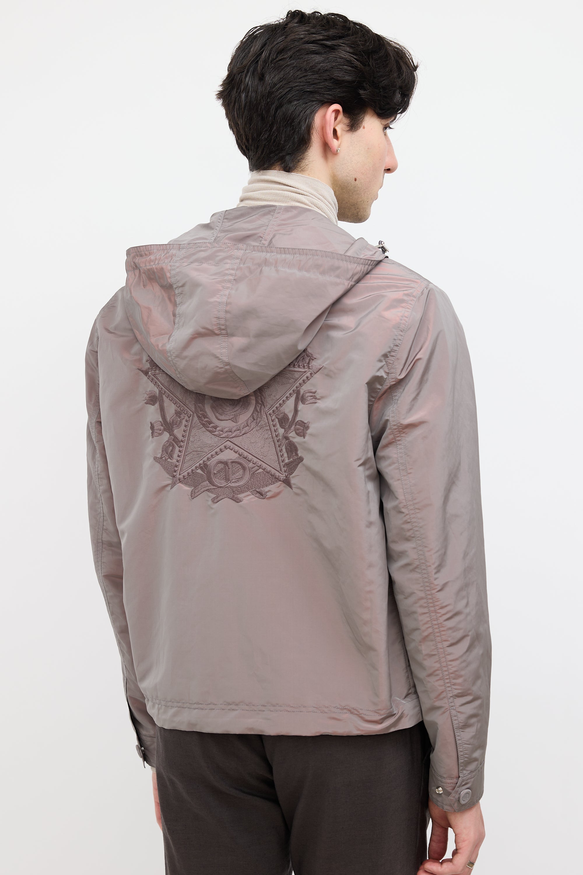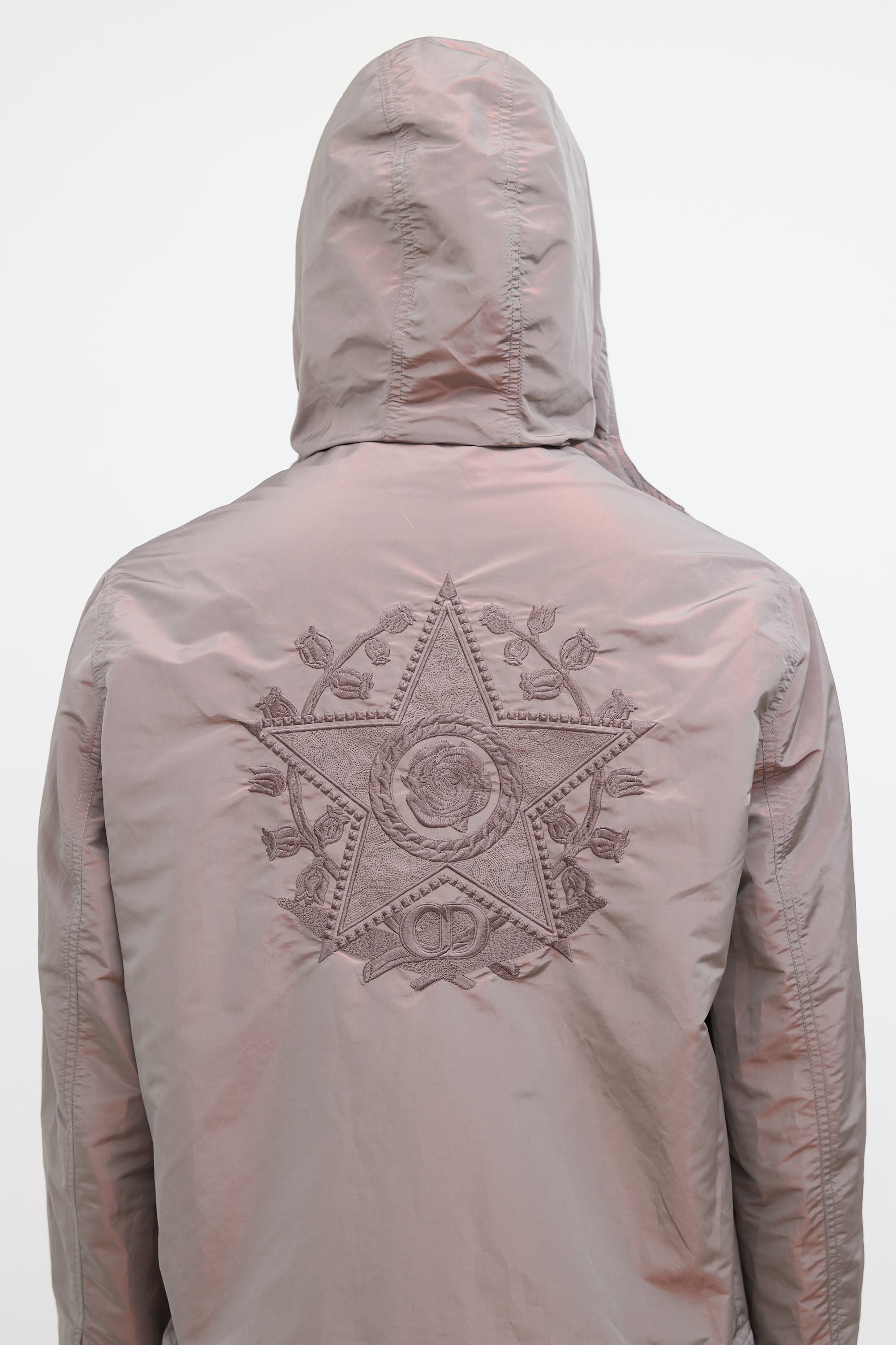 Pre-owned Dior silver iridescent jacket featuring attached drawstring hood, zip up front with snap buttoned placket, star and rose embroidery motif at left chest and back, two slip pockets at waist, two interior chest pockets, snap buttoned cuffs, and drawstring hem. Lined. Comes with original garment bag.