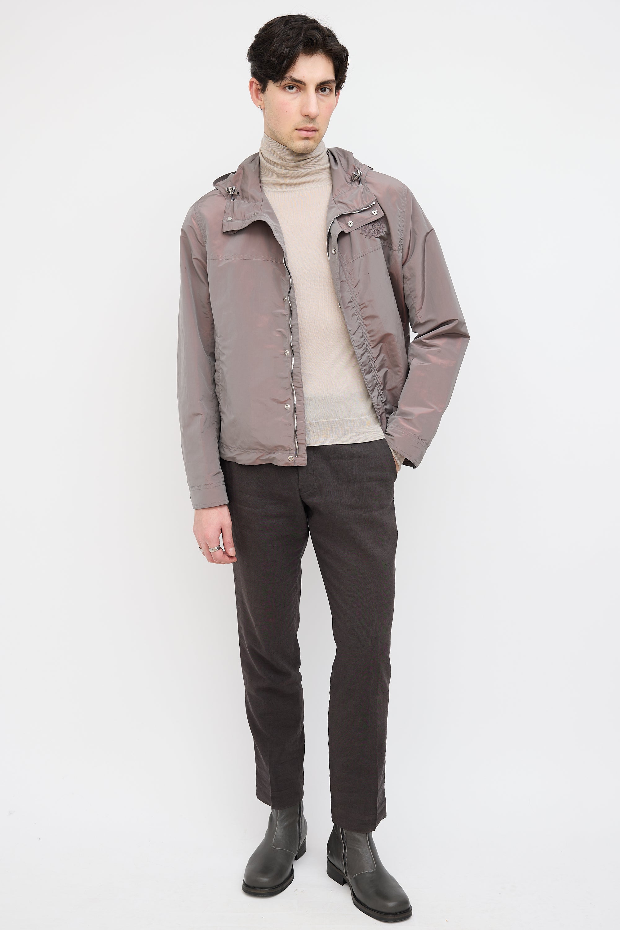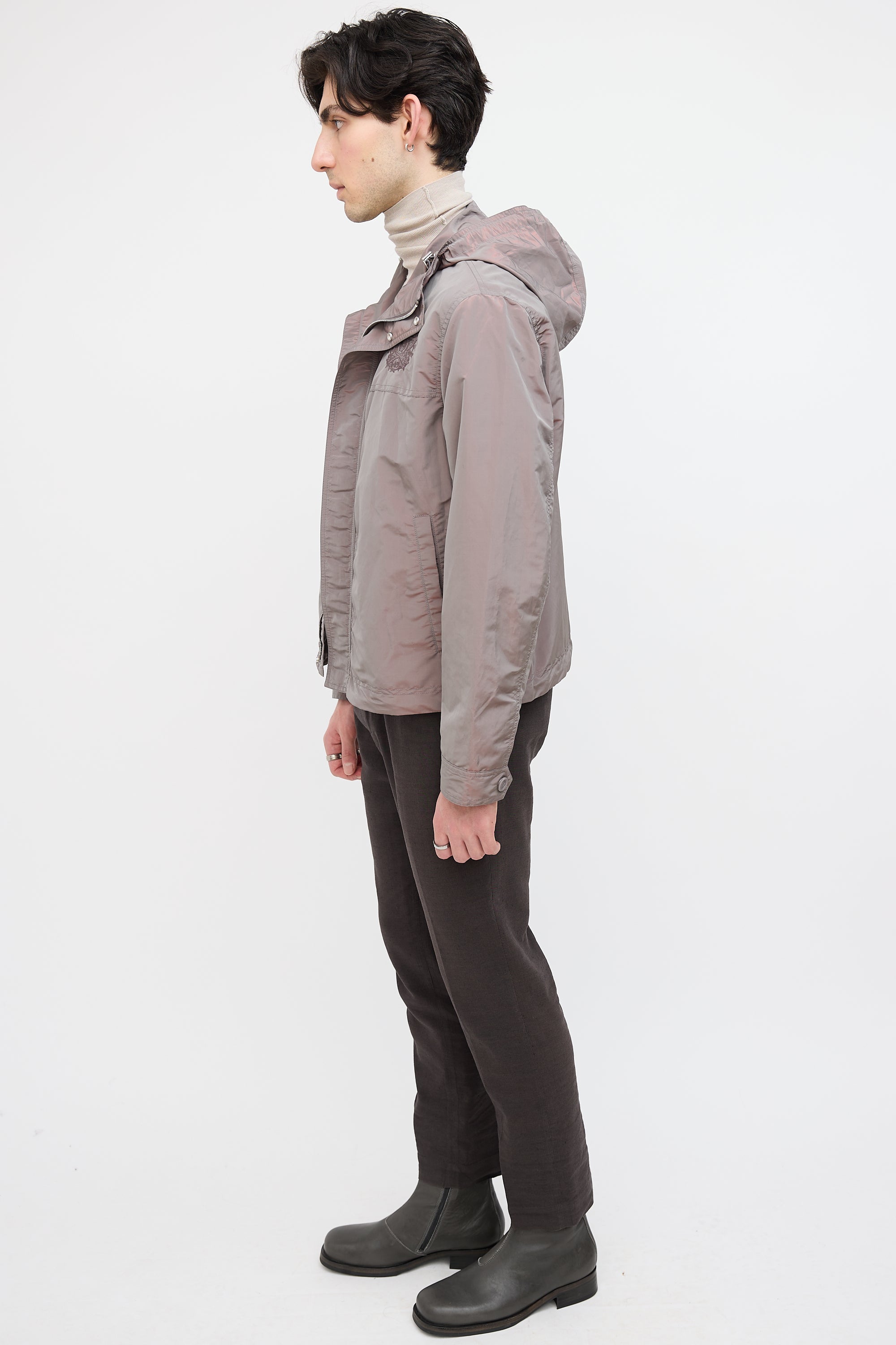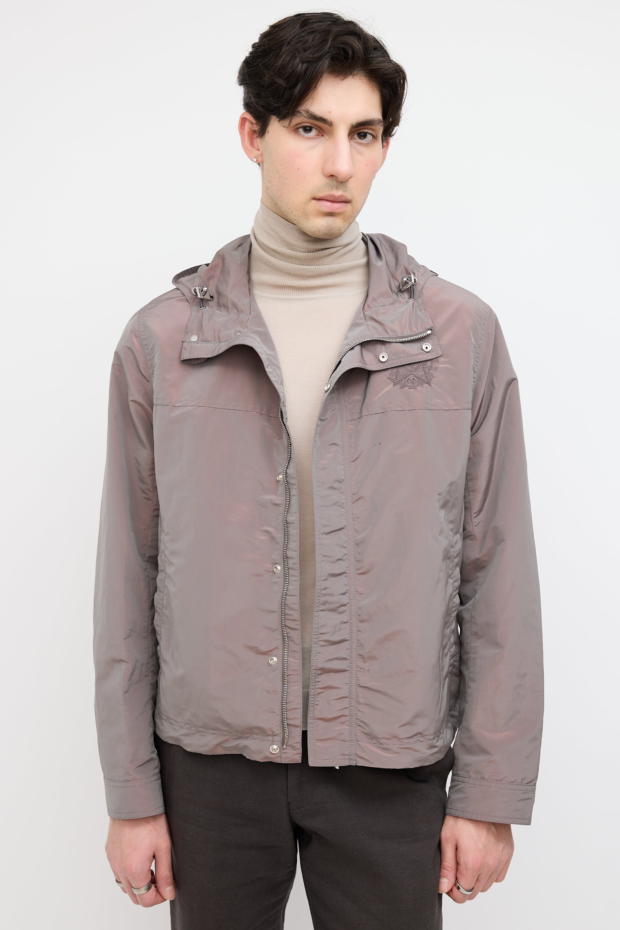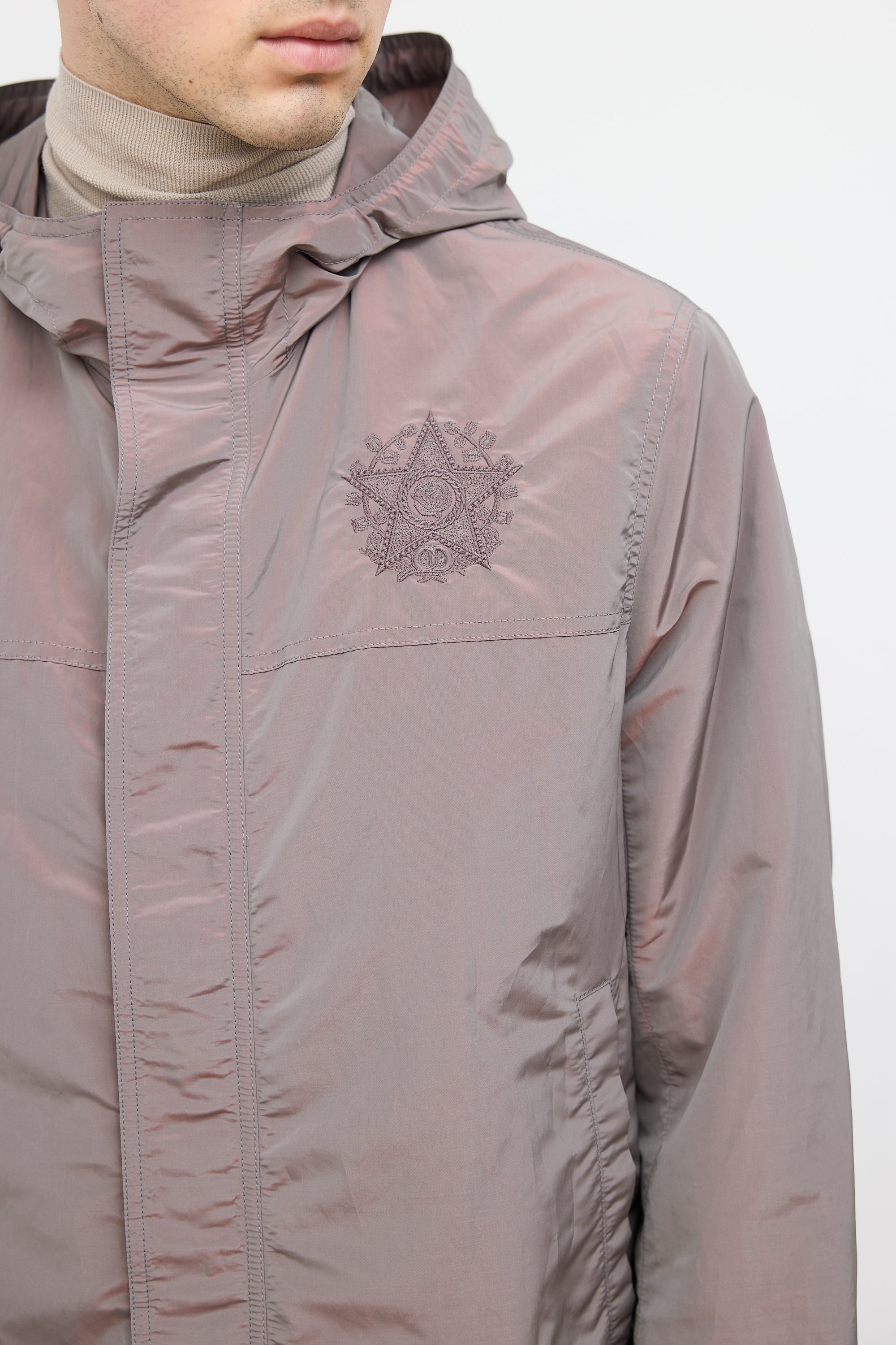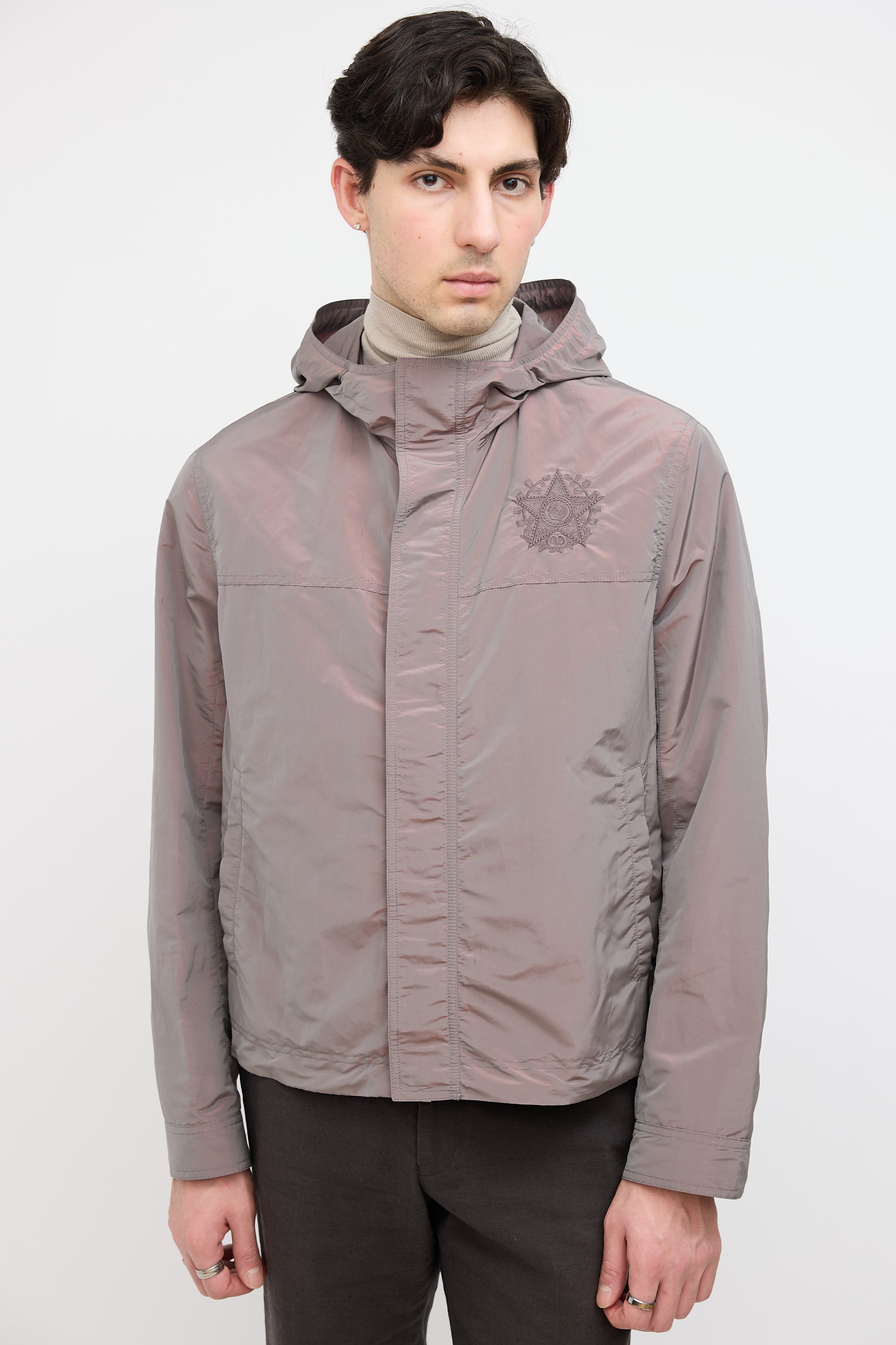 Pre-owned Dior silver iridescent jacket featuring attached drawstring hood, zip up front with snap buttoned placket, star and rose embroidery motif at left chest and back, two slip pockets at waist, two interior chest pockets, snap buttoned cuffs, and drawstring hem. Lined. Comes with original garment bag.