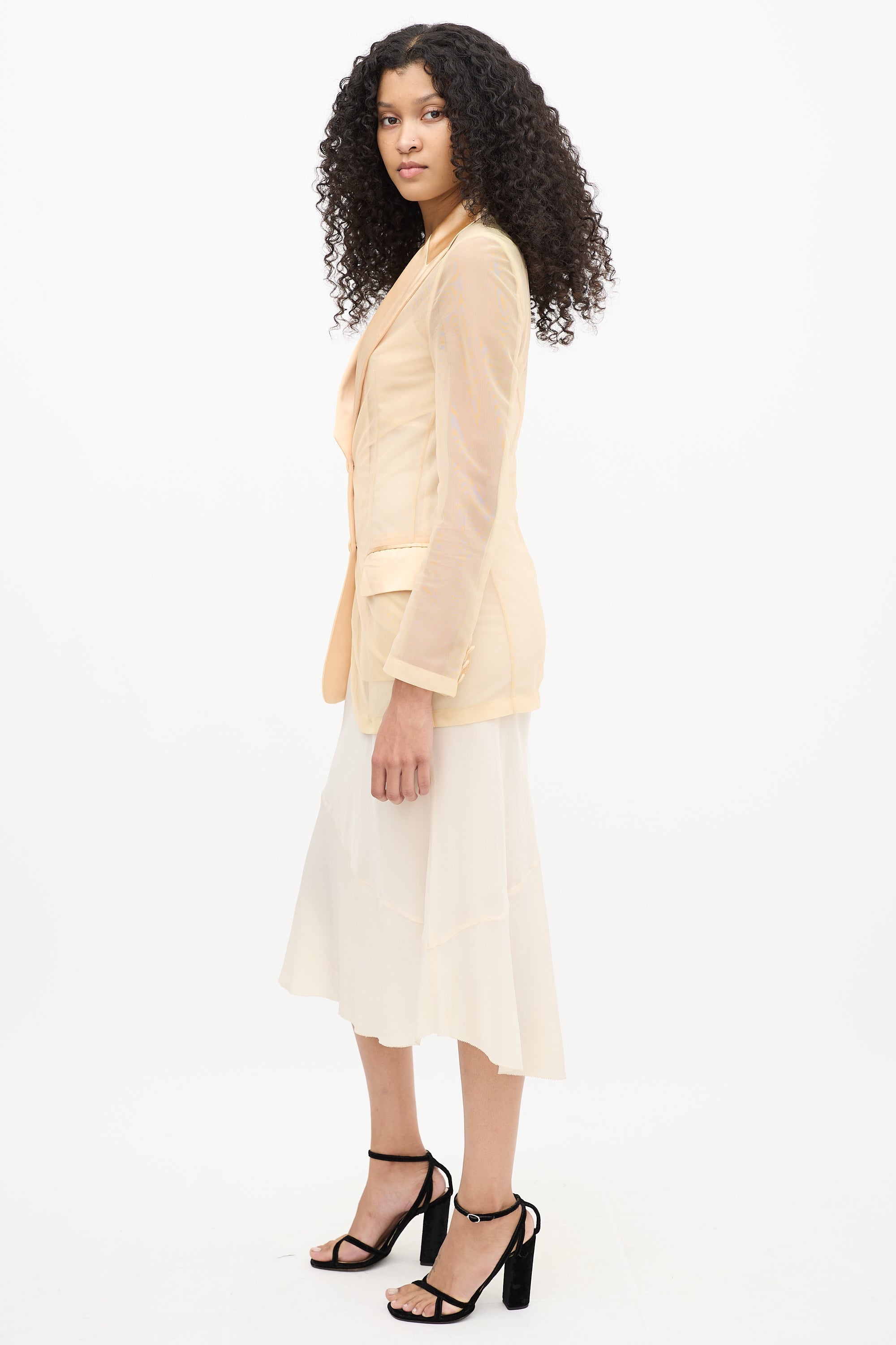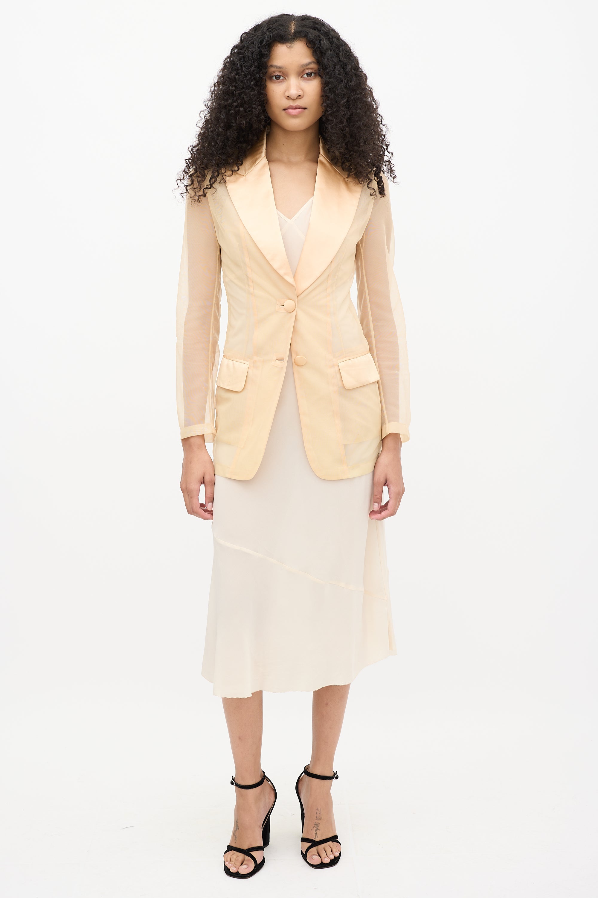 Pre-owned Dolce & Gabbana 1990's beige mesh blazer featuring satin peak lapel, flap pockets at hips, long sleeves with buttoned cuffs, and button up front. Unlined.