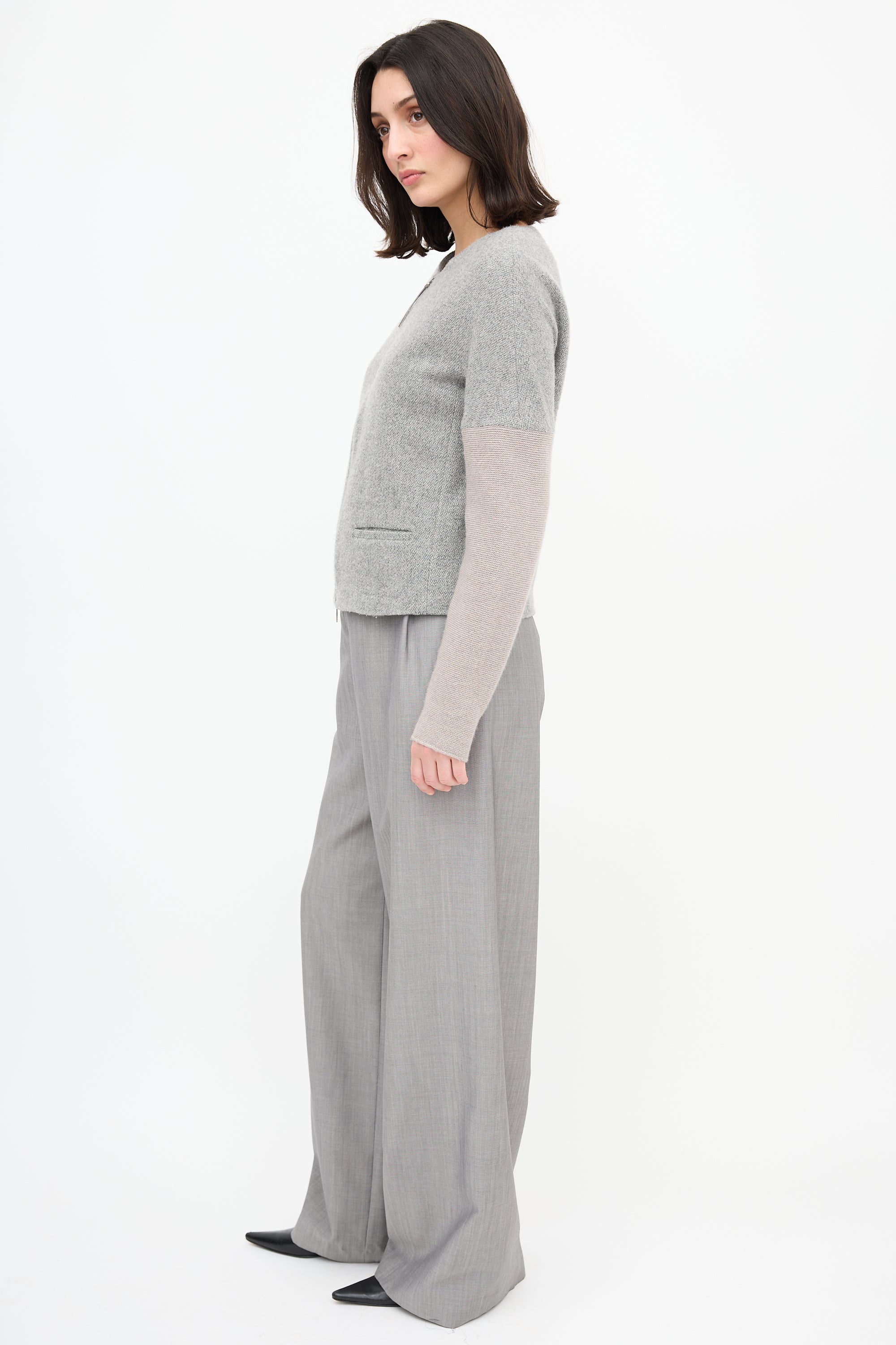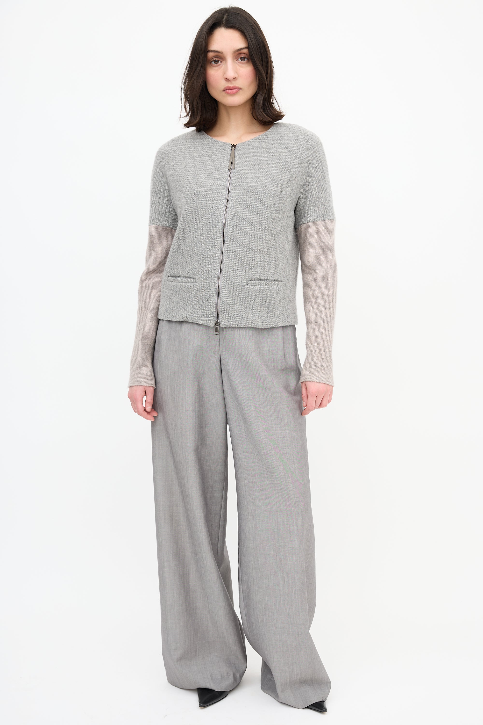 Pre-owned Fabiana Filippi grey melange cashmere jacket featuring round neckline, double zip front, two front pockets, and knit sleeves. Lined.