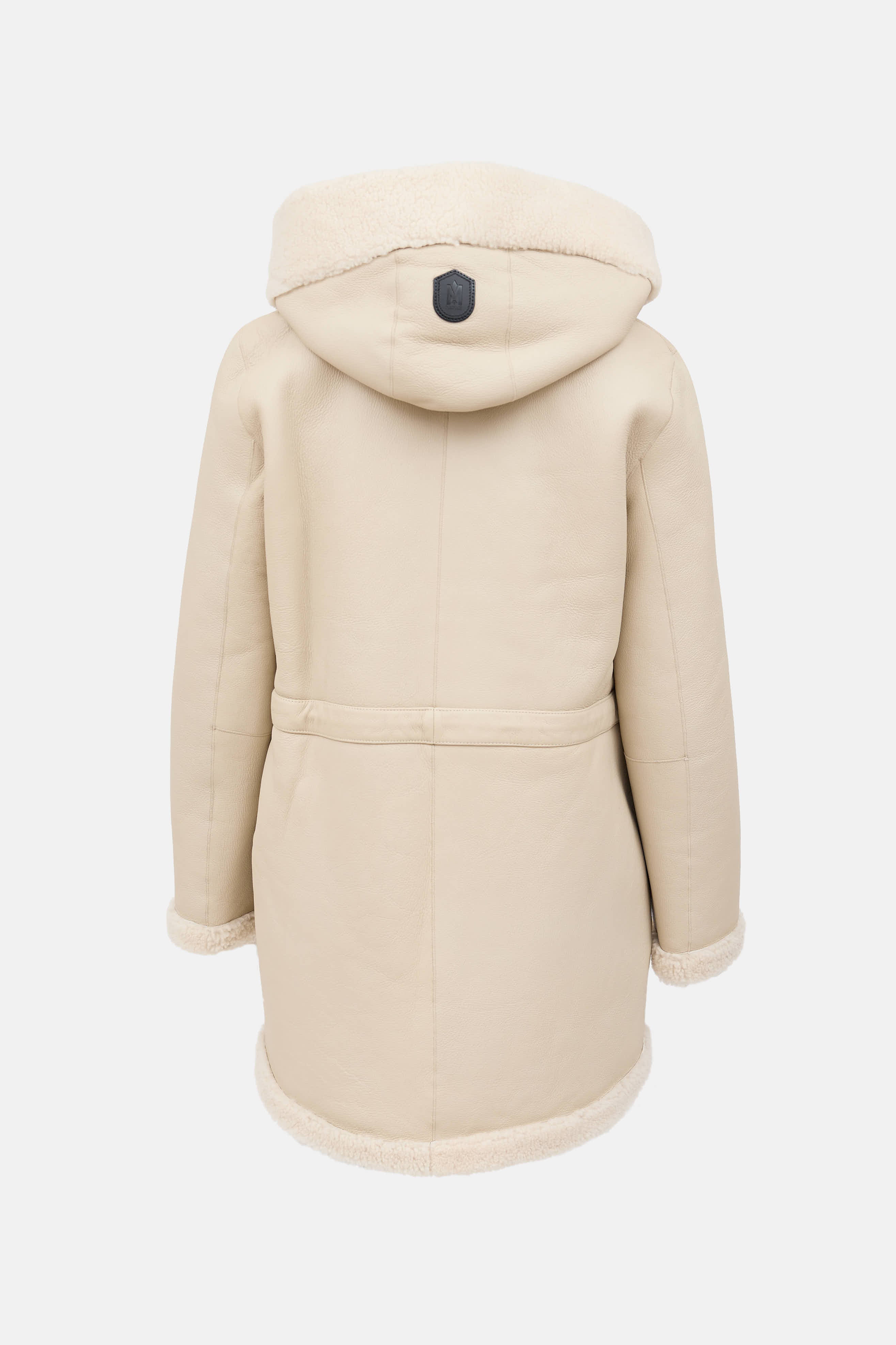 Pre-owned Mackage cream leather Akela jacket featuring reversible styling, attached hood, zip front, cinched drawstring waist, and slit pockets at side.