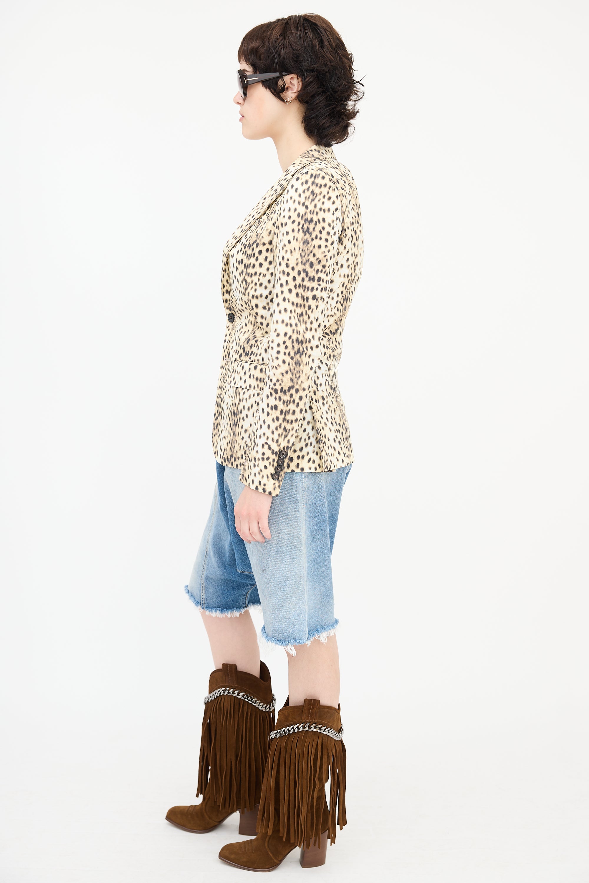 Pre-owned R13 brown and black leopard print Boyfriend blazer featuring a notched lapel, button front, one welt pocket at chest, two flap pockets at hip, dual vented back, and buttoned cuffs.