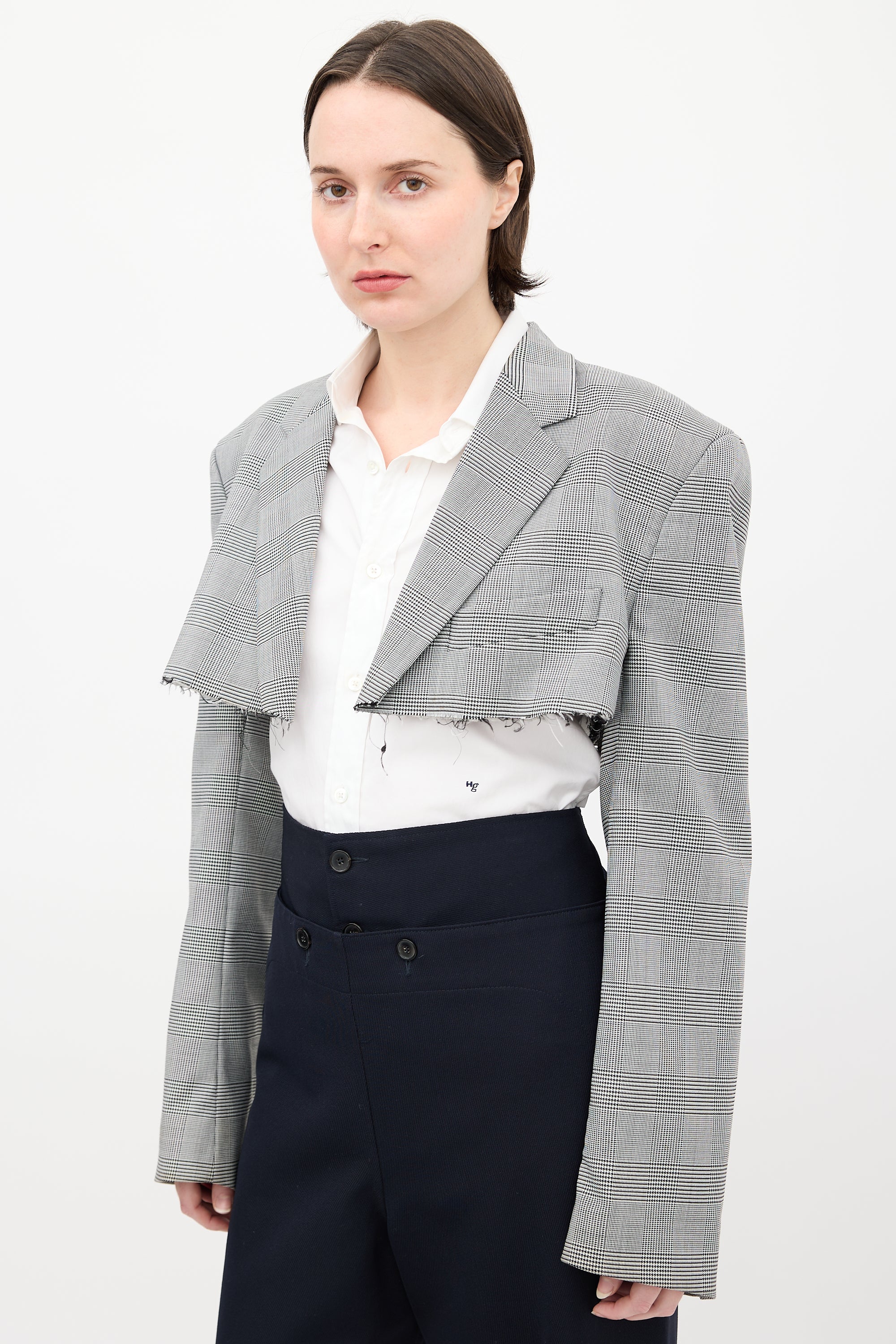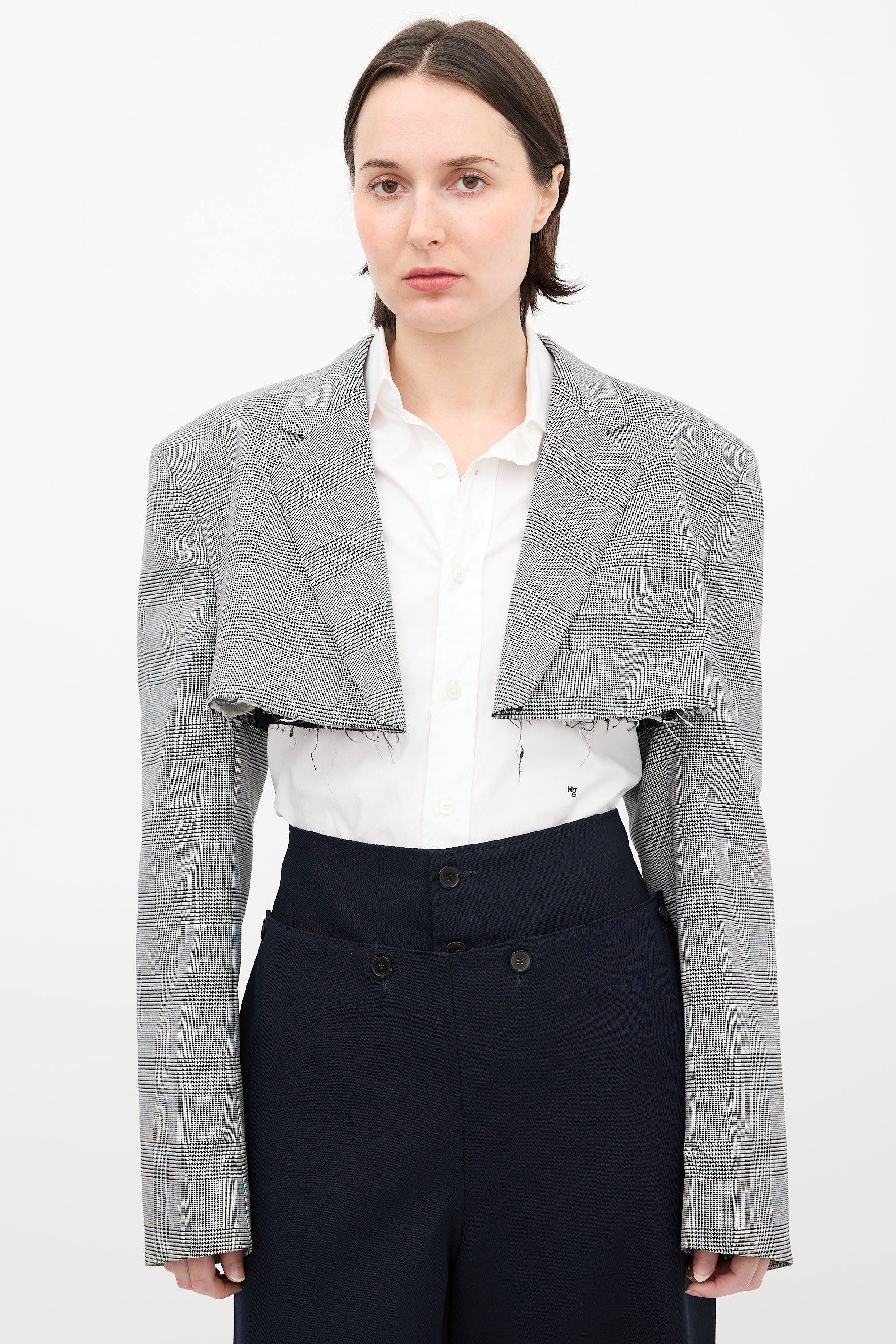 Pre-owned Vetements Garderobe collection black and white cropped blazer featuring Glen check pattern, notched lapel, rubber logo tab at back neck, open front, welt pocket detail at left chest, raw hem, exaggerated padded shoulders, and buttoned cuffs. Lined.