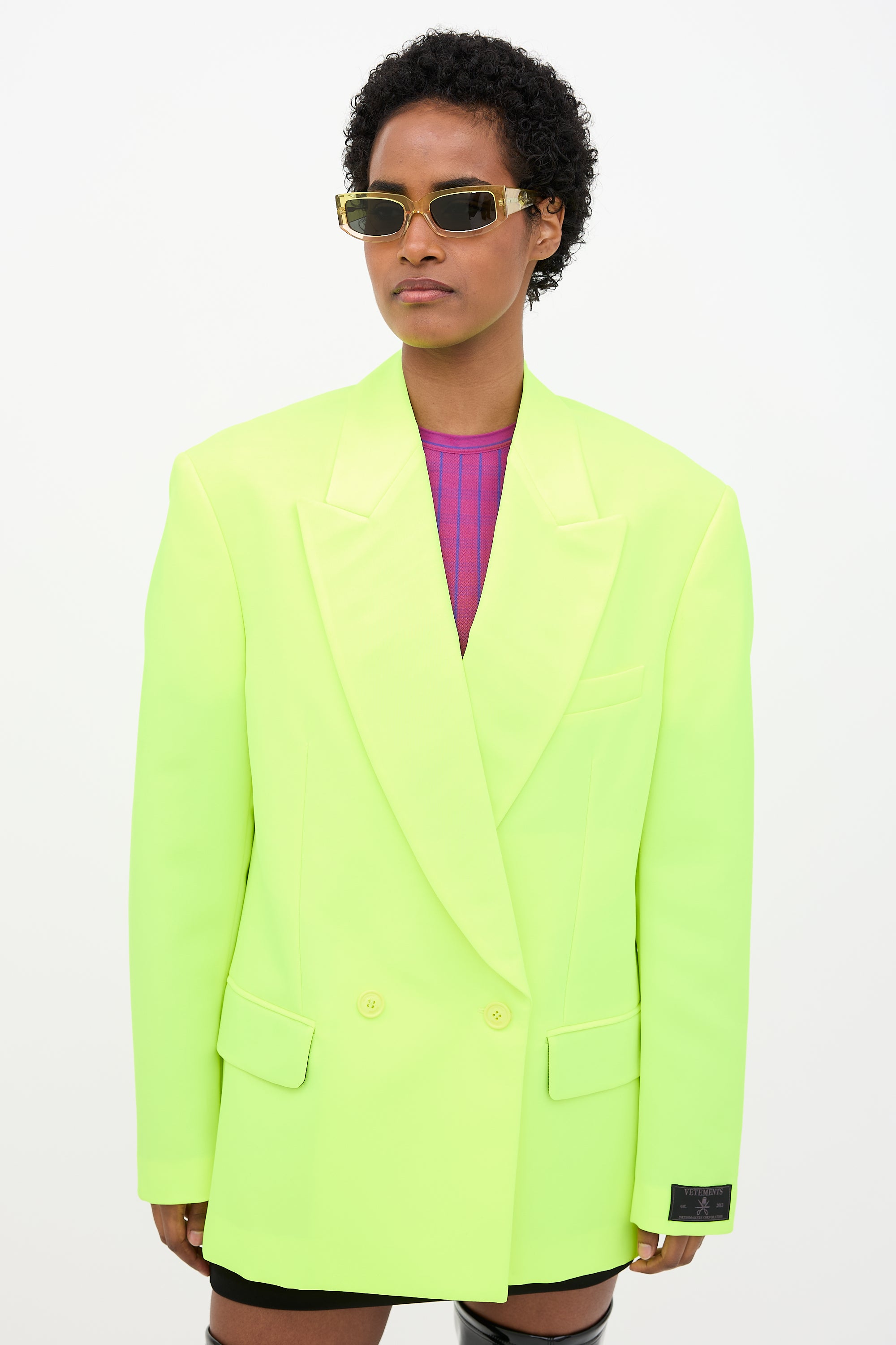 Pre-owned Vetements Spring 2020 neon yellow blazer featuring peak lapel, 2x1 double breasted button front, welt pocket at left chest, two front flap pockets, two interior pockets, and logo tab at left cuff. Lined.