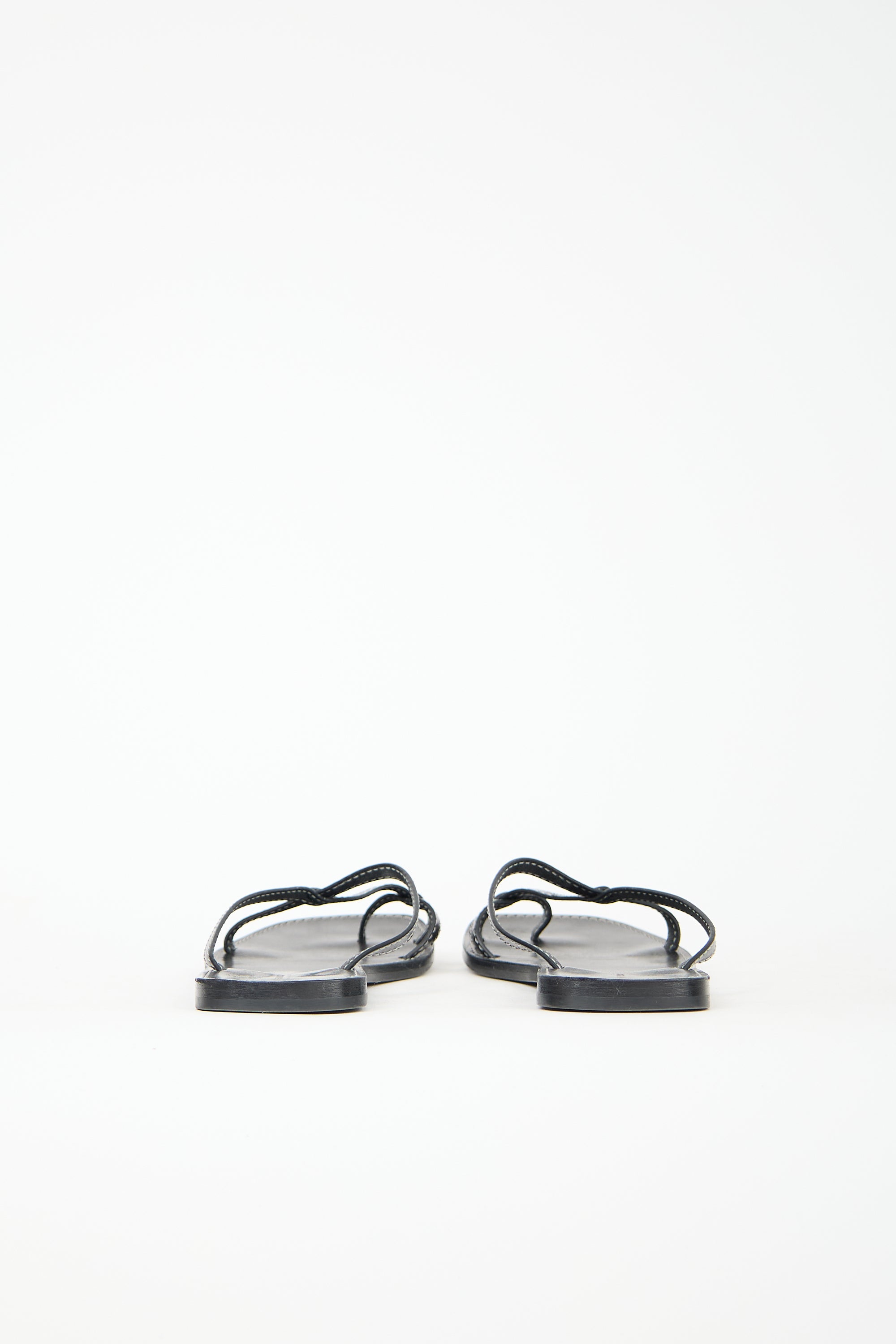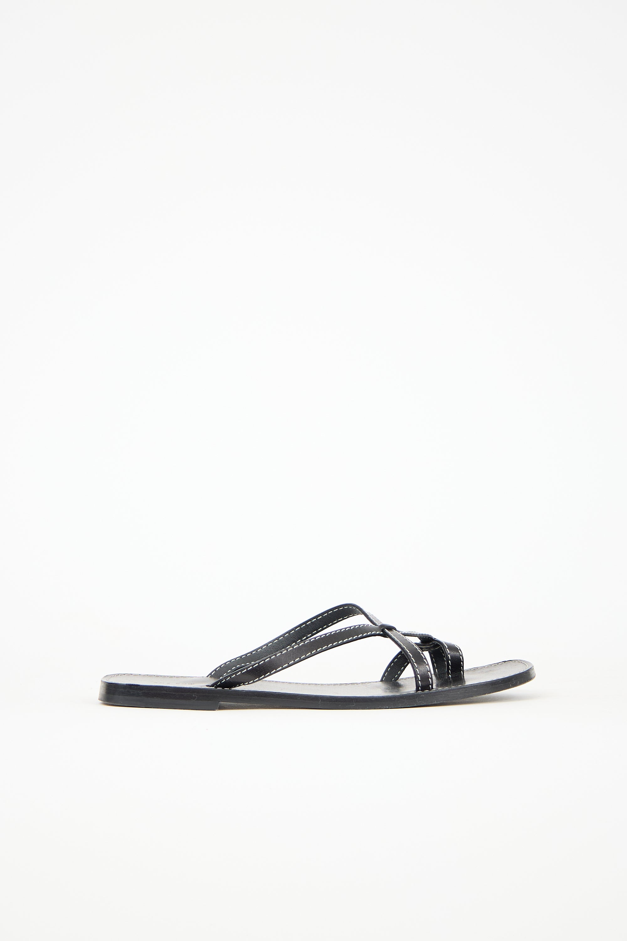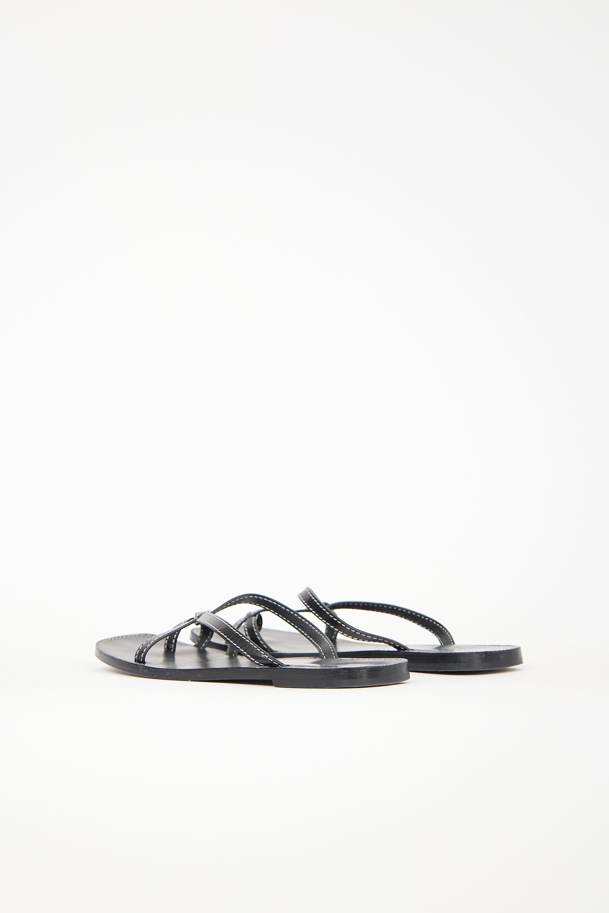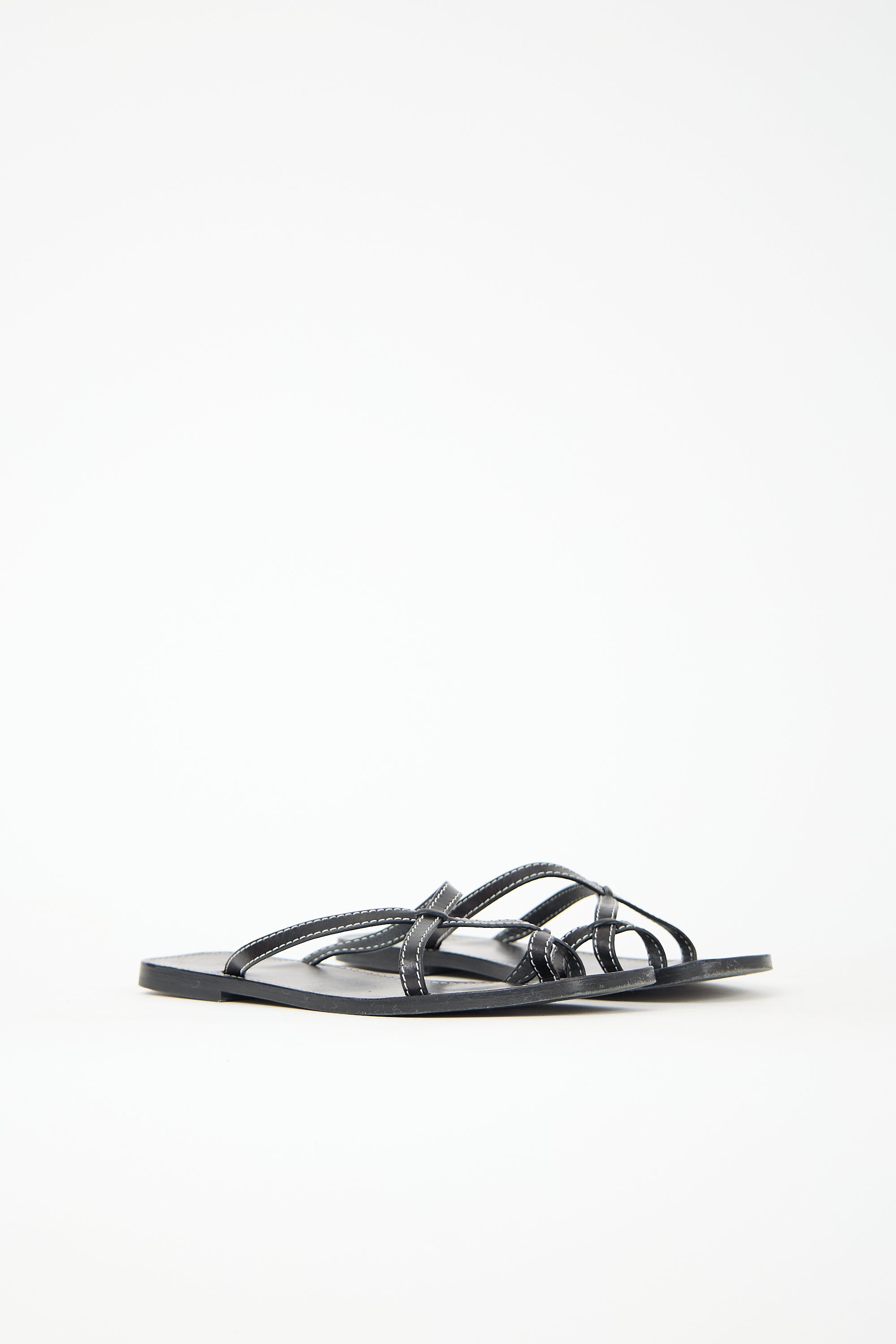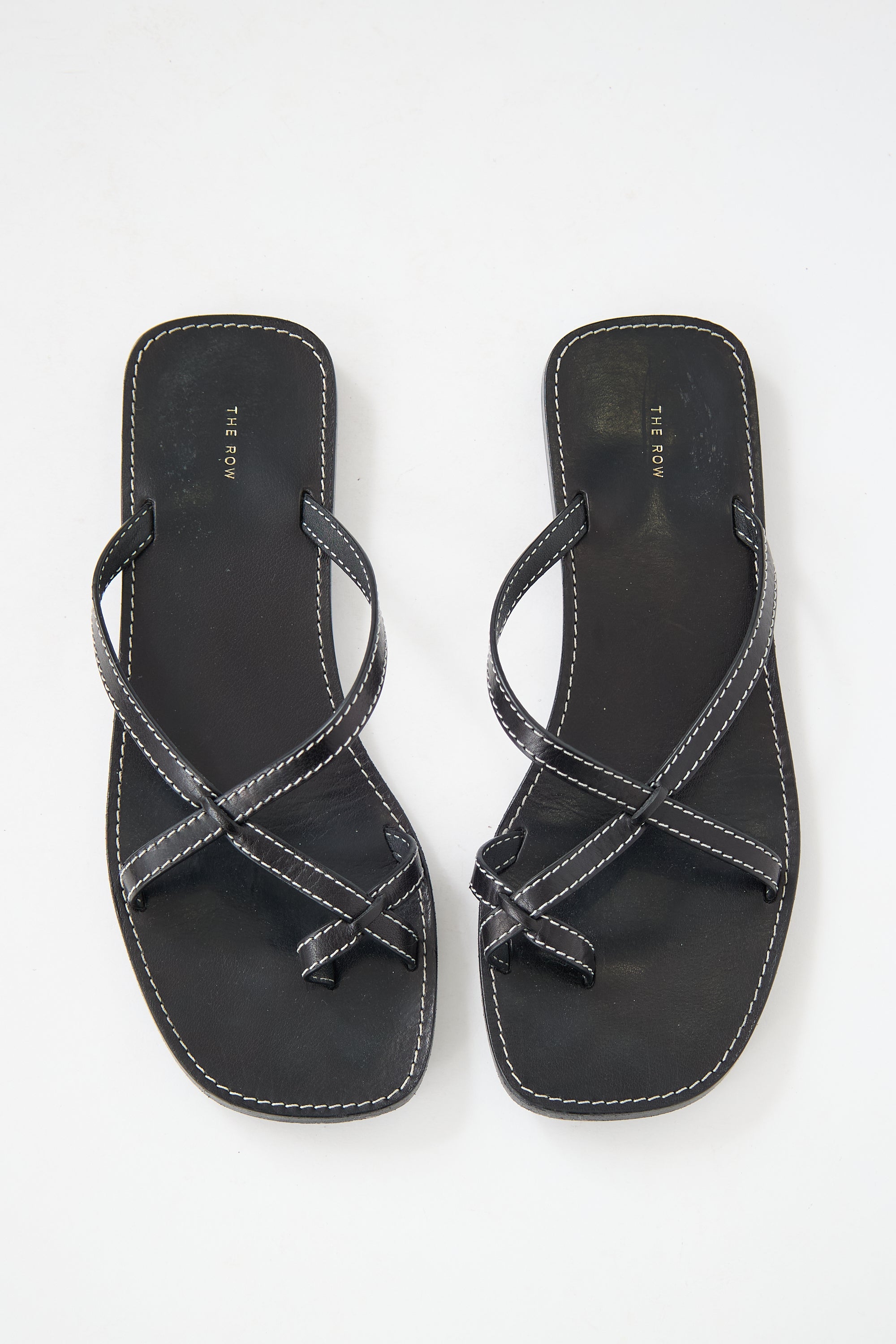 Pre-owned The Row black leather Link sandals featuring an open square toe, criss cross toe and vamp straps, contrast stitching, and slip on entry. Comes with original dust bag.