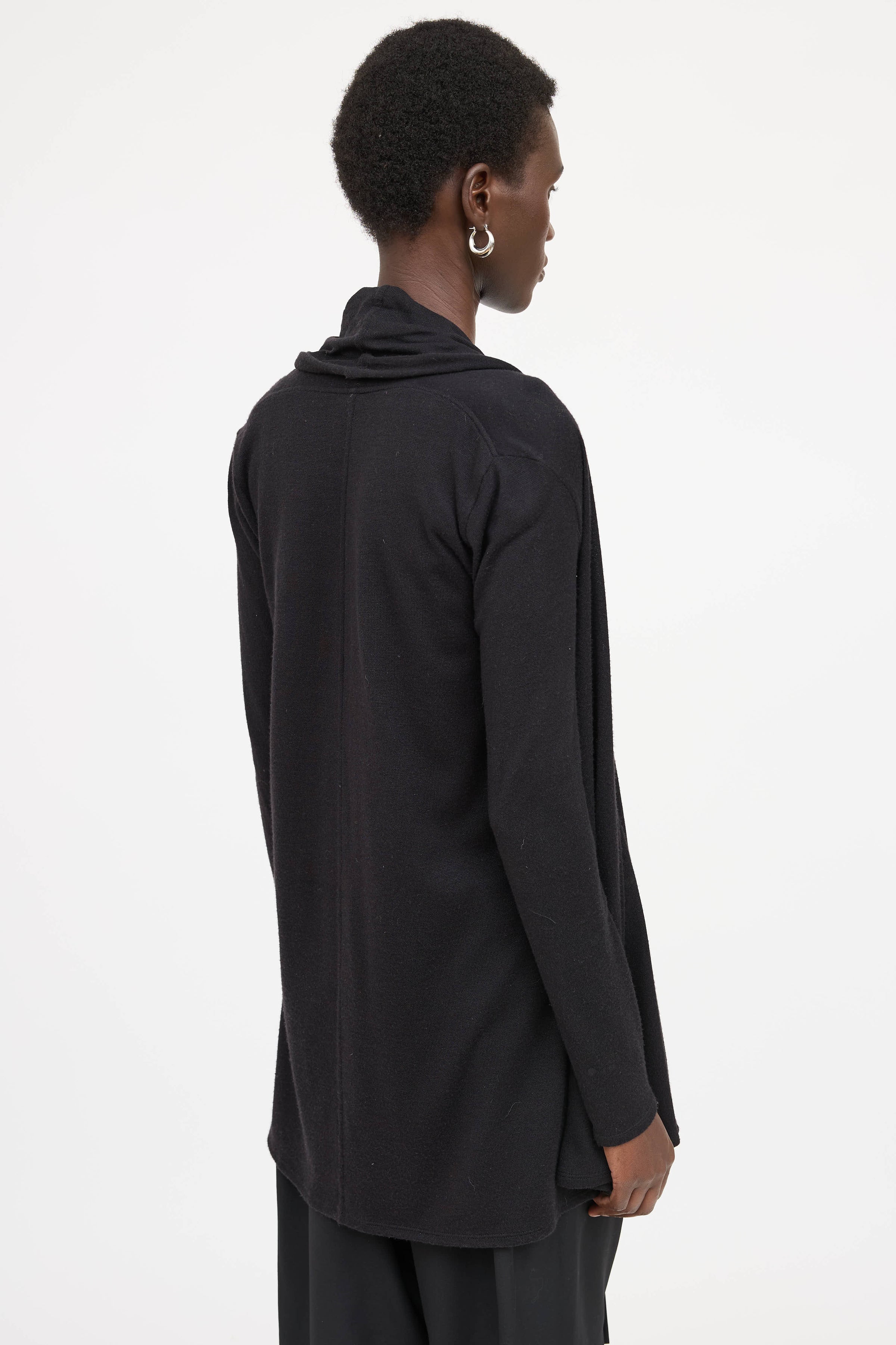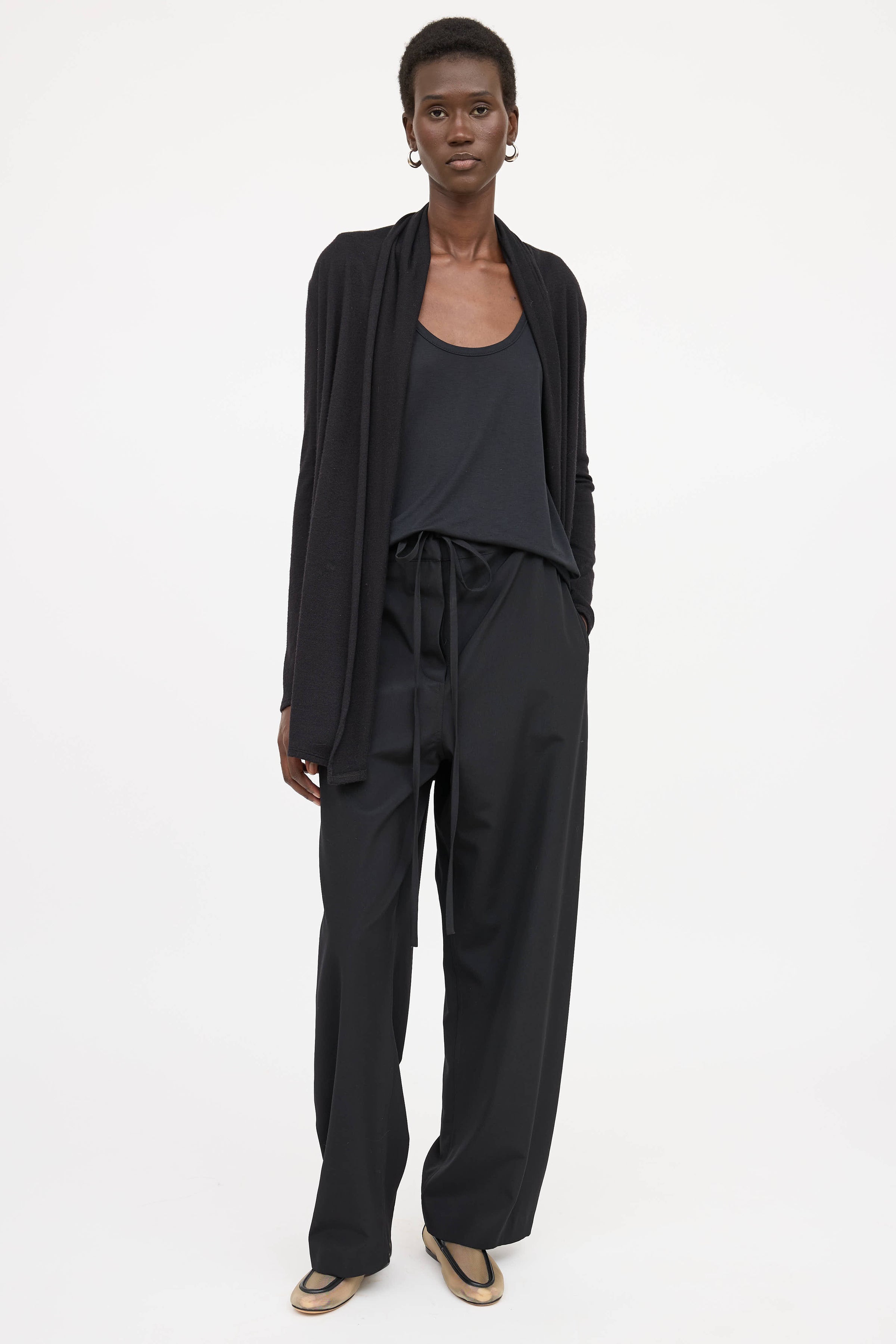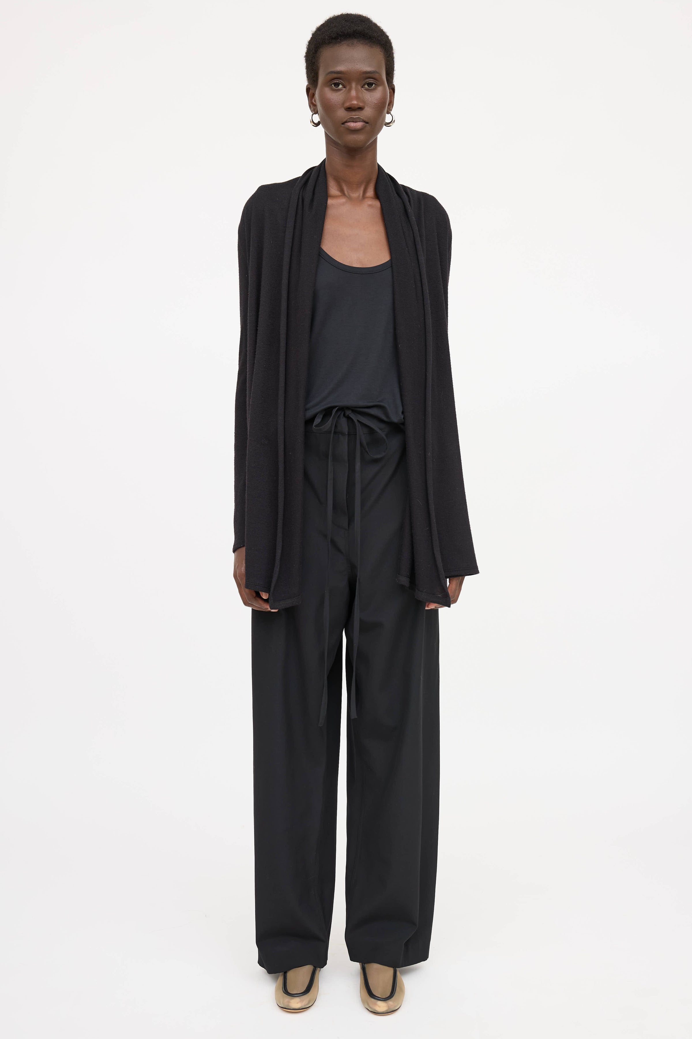 Pre-owned The Row black open front cardigan featuring shawl neckline and seam at back.