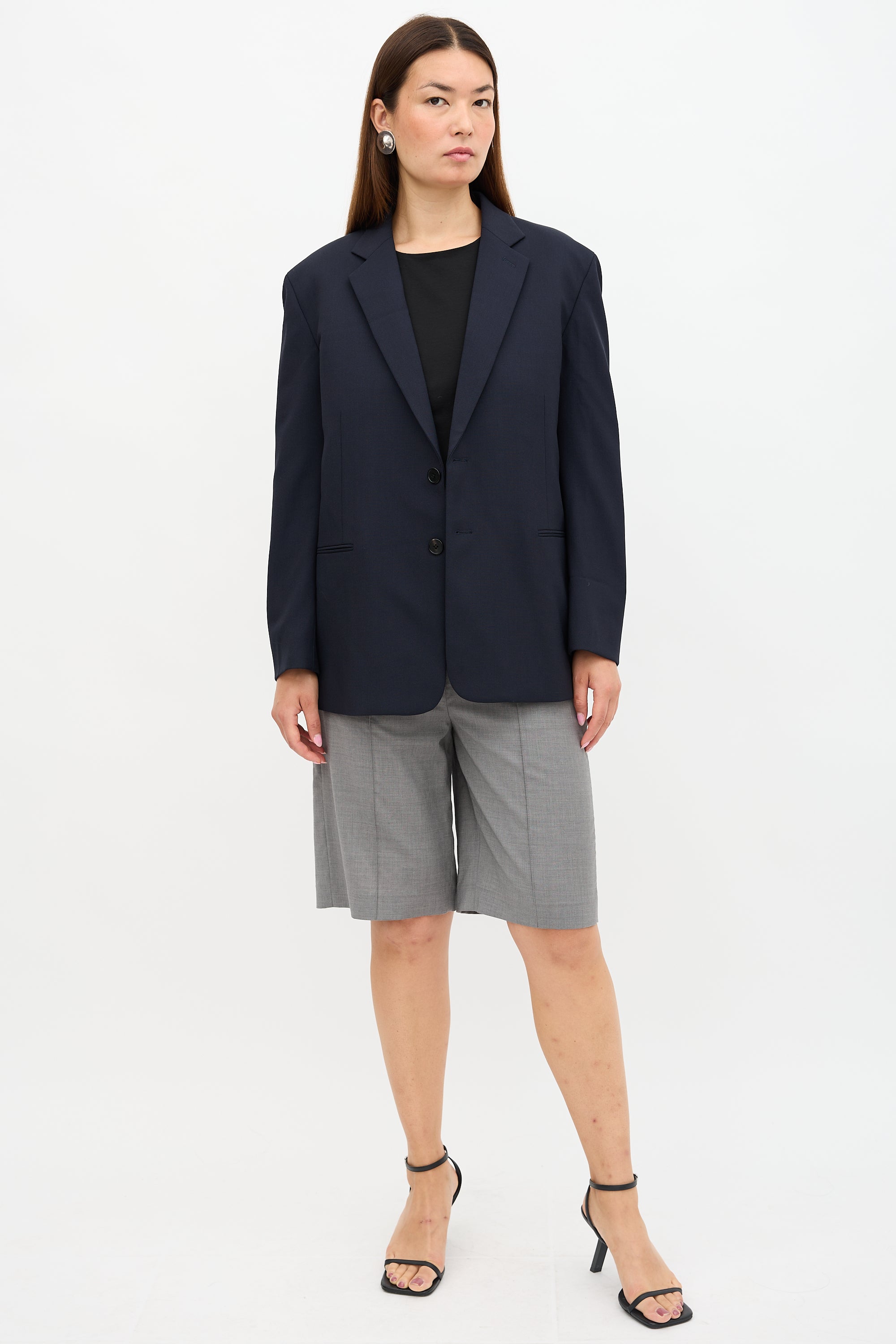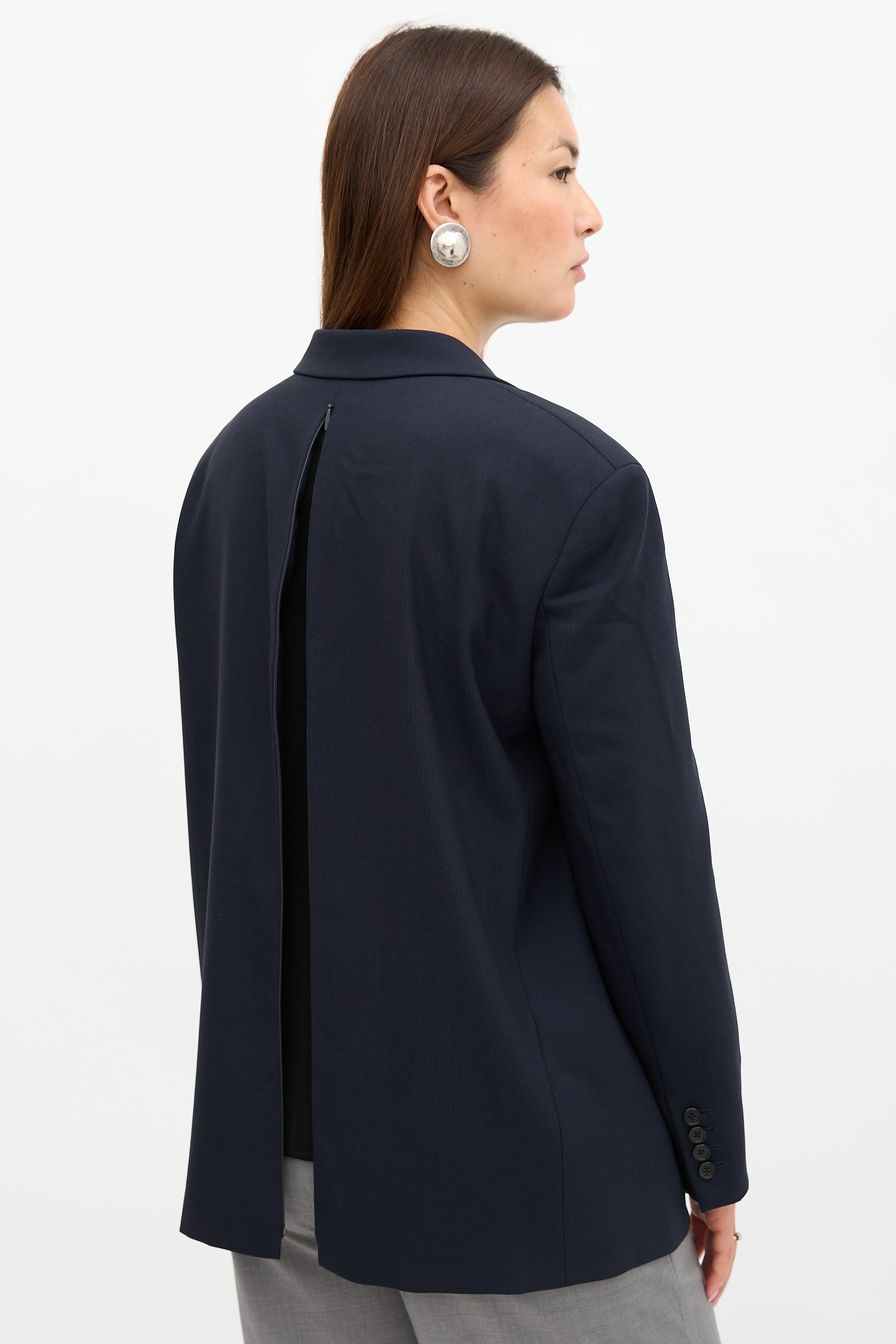Pre-owned The Row navy wool Cochise jacket featuring a notched lapel, two button front, two welt pockets, buttoned cuffs, and concealed full zip back vent. Lined.