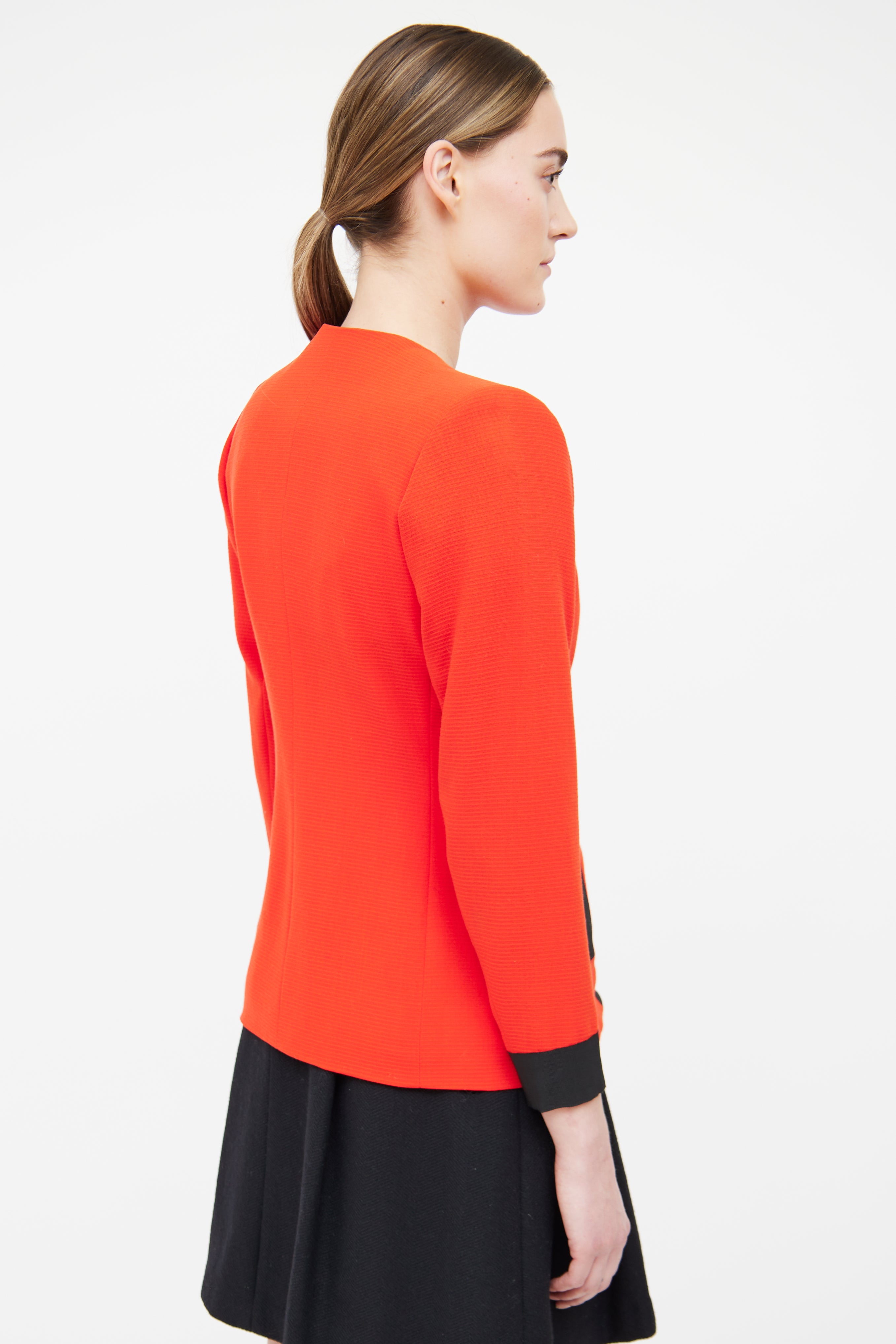 Pre-owned vintage Yves Saint Laurent Rive Gauche red evening jacket featuring shoulder pads, two functional pockets, long sleeves, black trim and oversized pearlescent buttons.