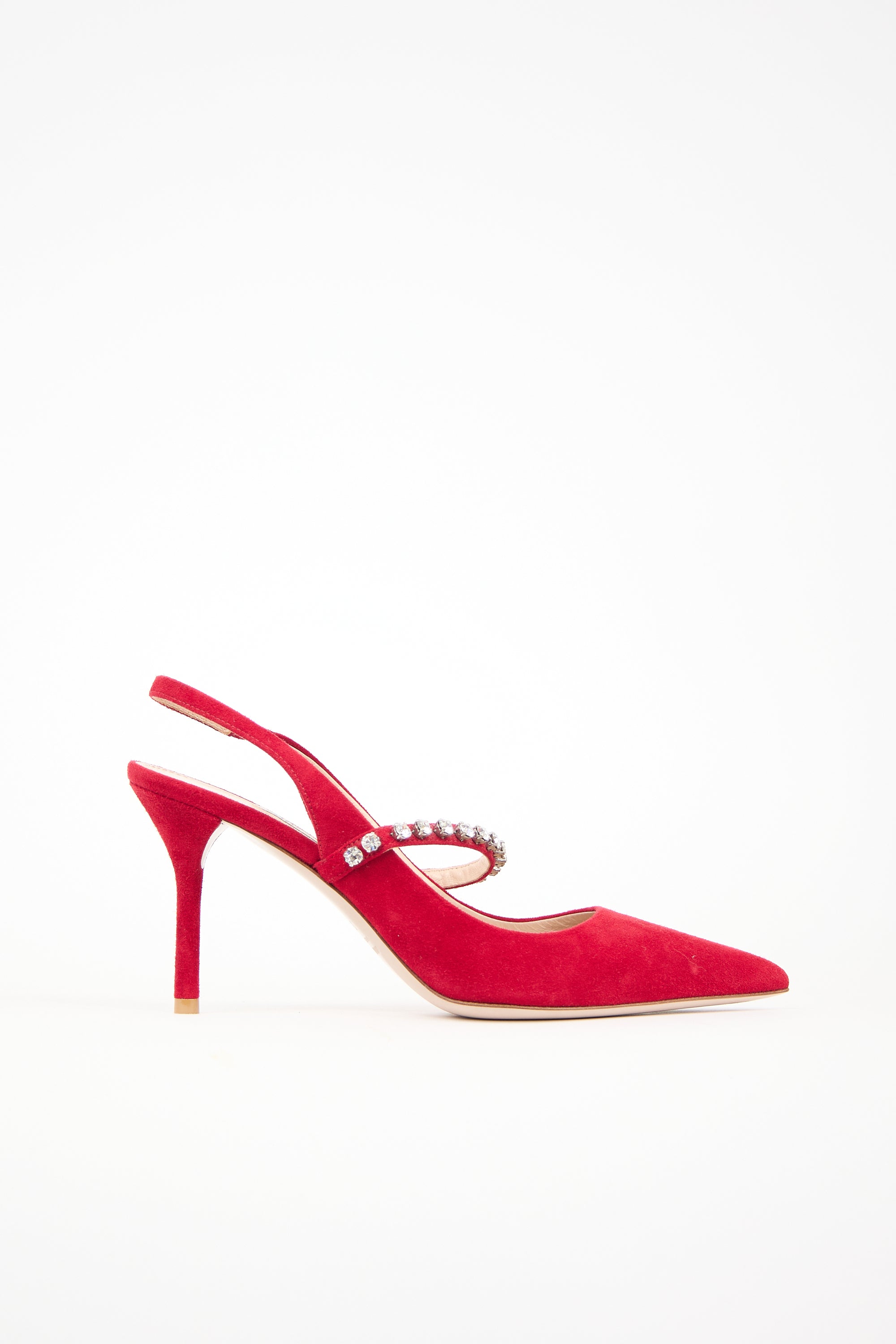 Pre-owned Miu Miu red suede pumps featuring pointed toe, instep strap with inset crystal embellishments, slingback strap, and covered pin heel. Comes with original dust bags.