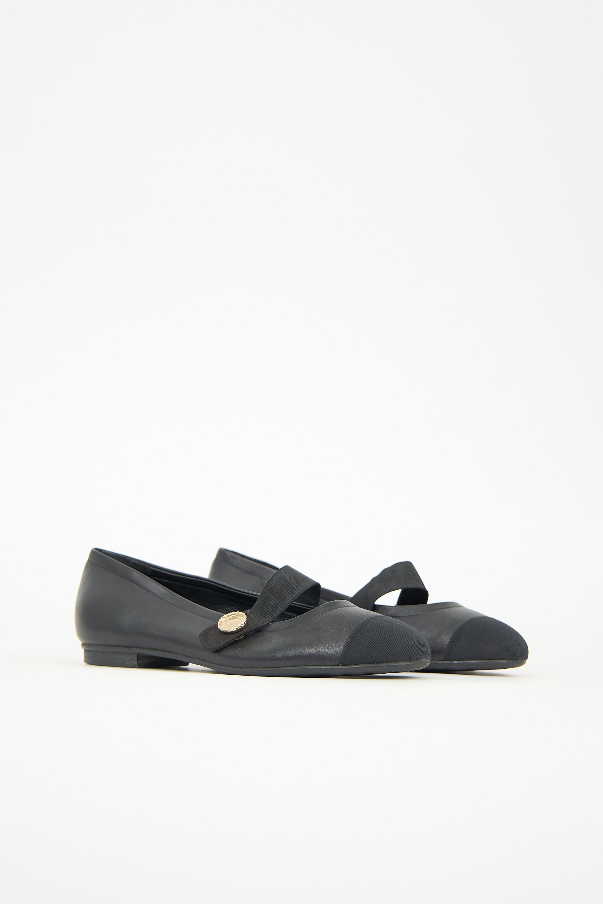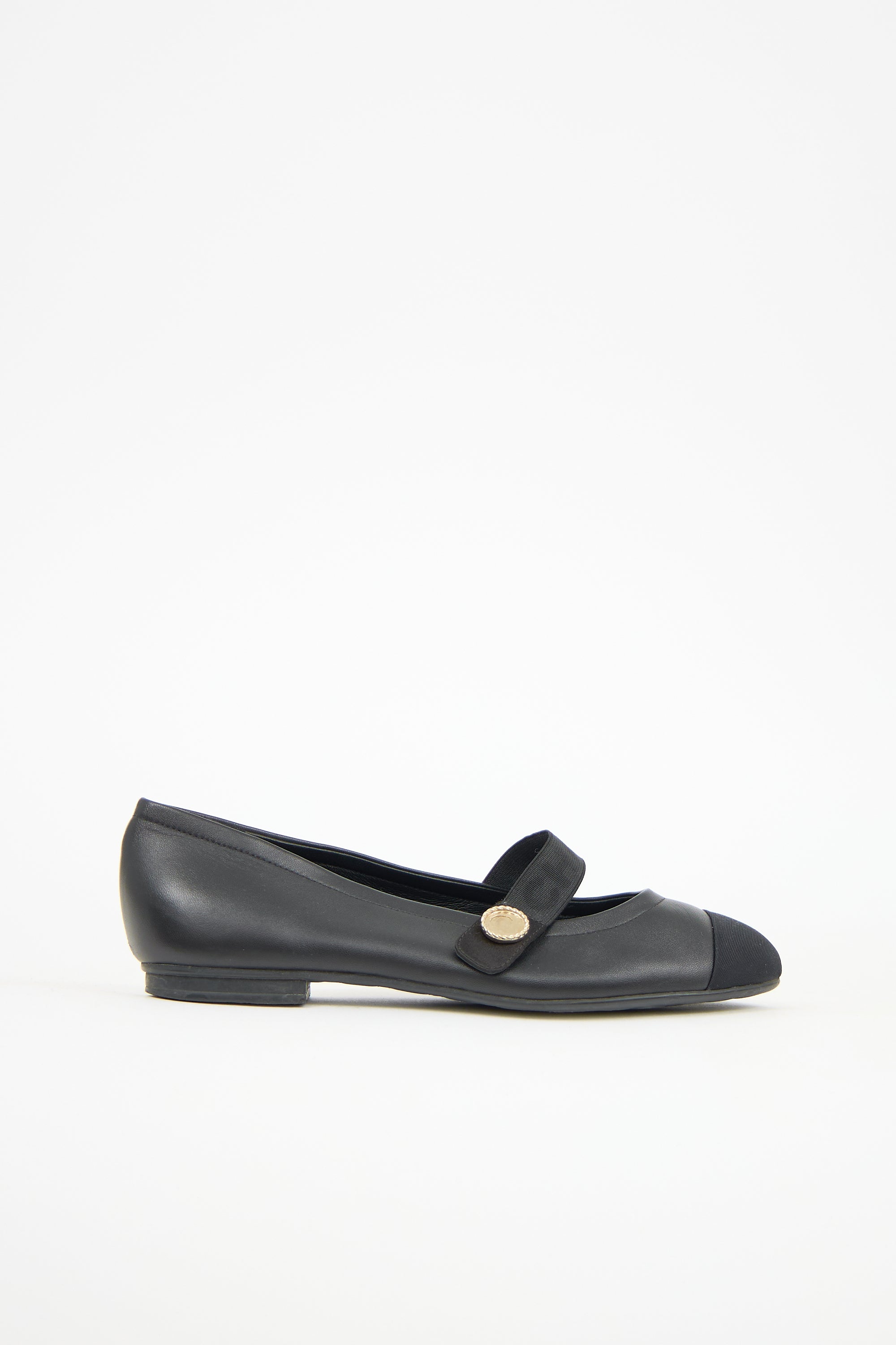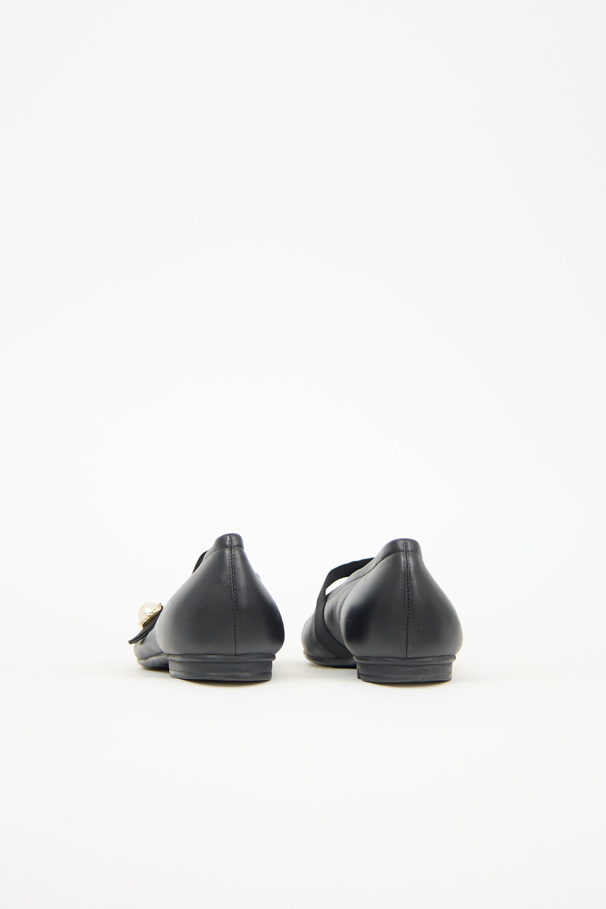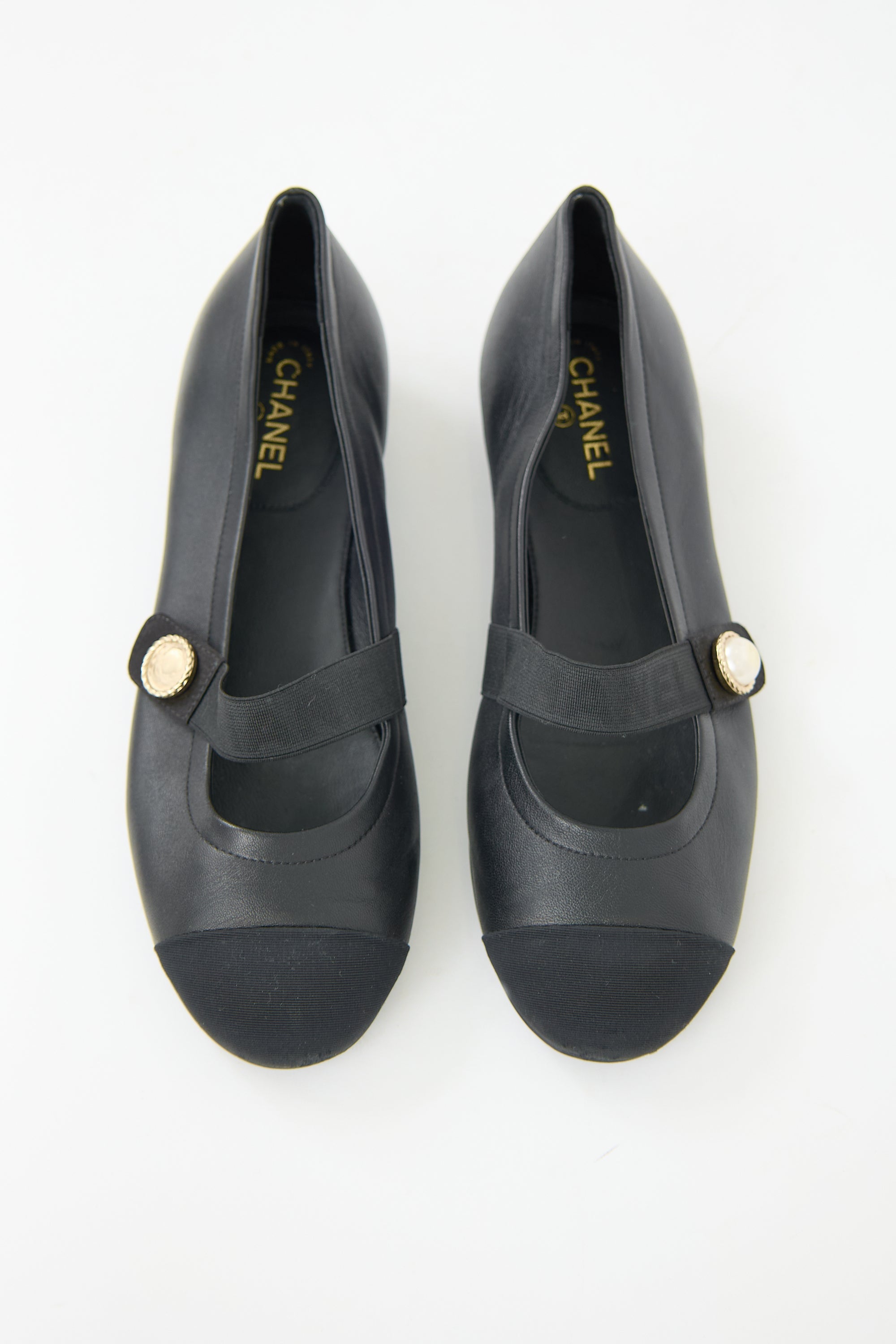 Pre-owned Chanel black leather mary jane flats featuring a grosgrain rounded cap toe, elasticized strap across vamp with faux pearl embellishment at outer side, and a small rubber heel. Comes with original dust bags.