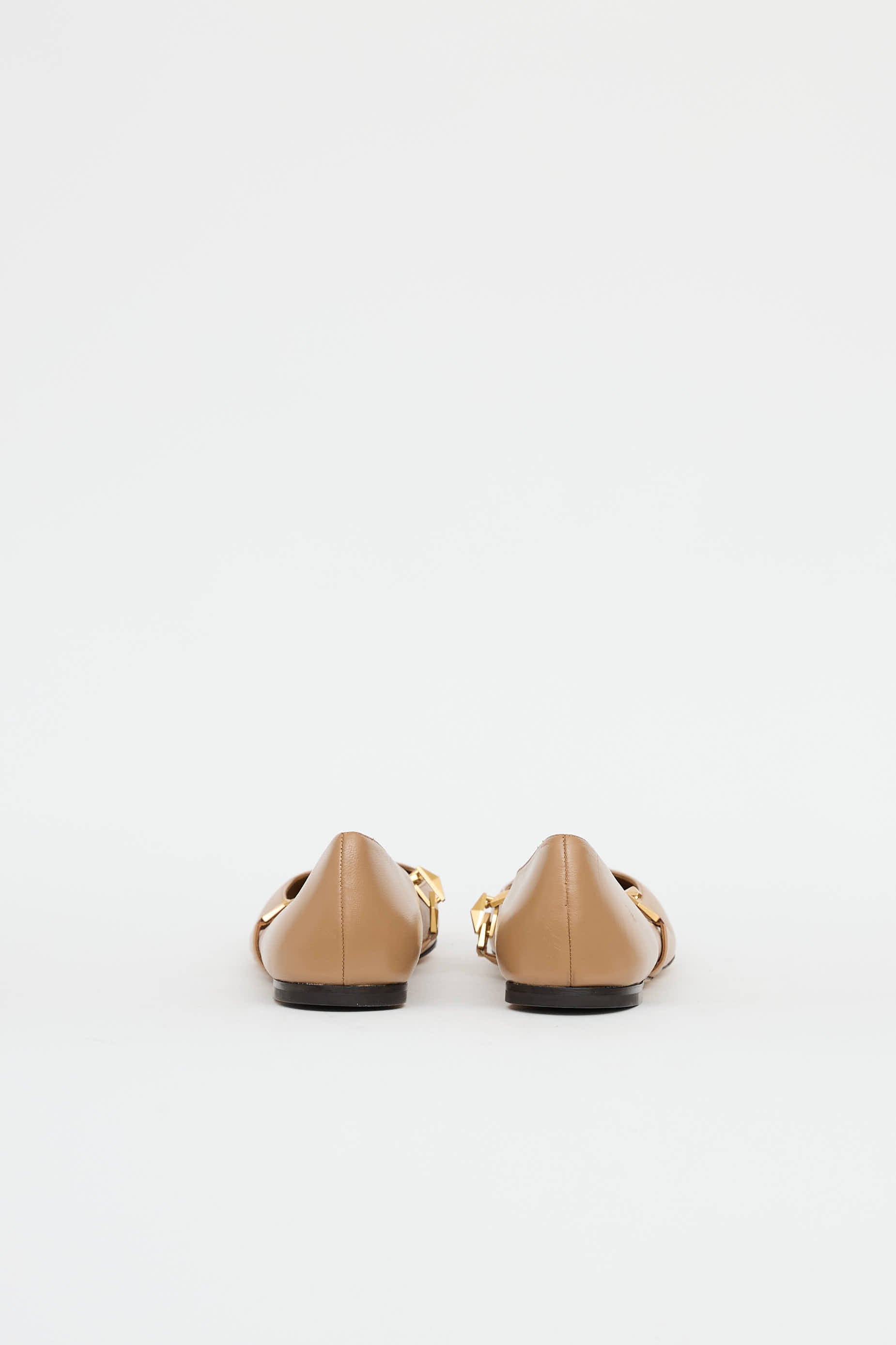 Pre-owned Jimmy Choo beige leather flat featuring a square toe, gold tone chain at vamp, and stacked heel.